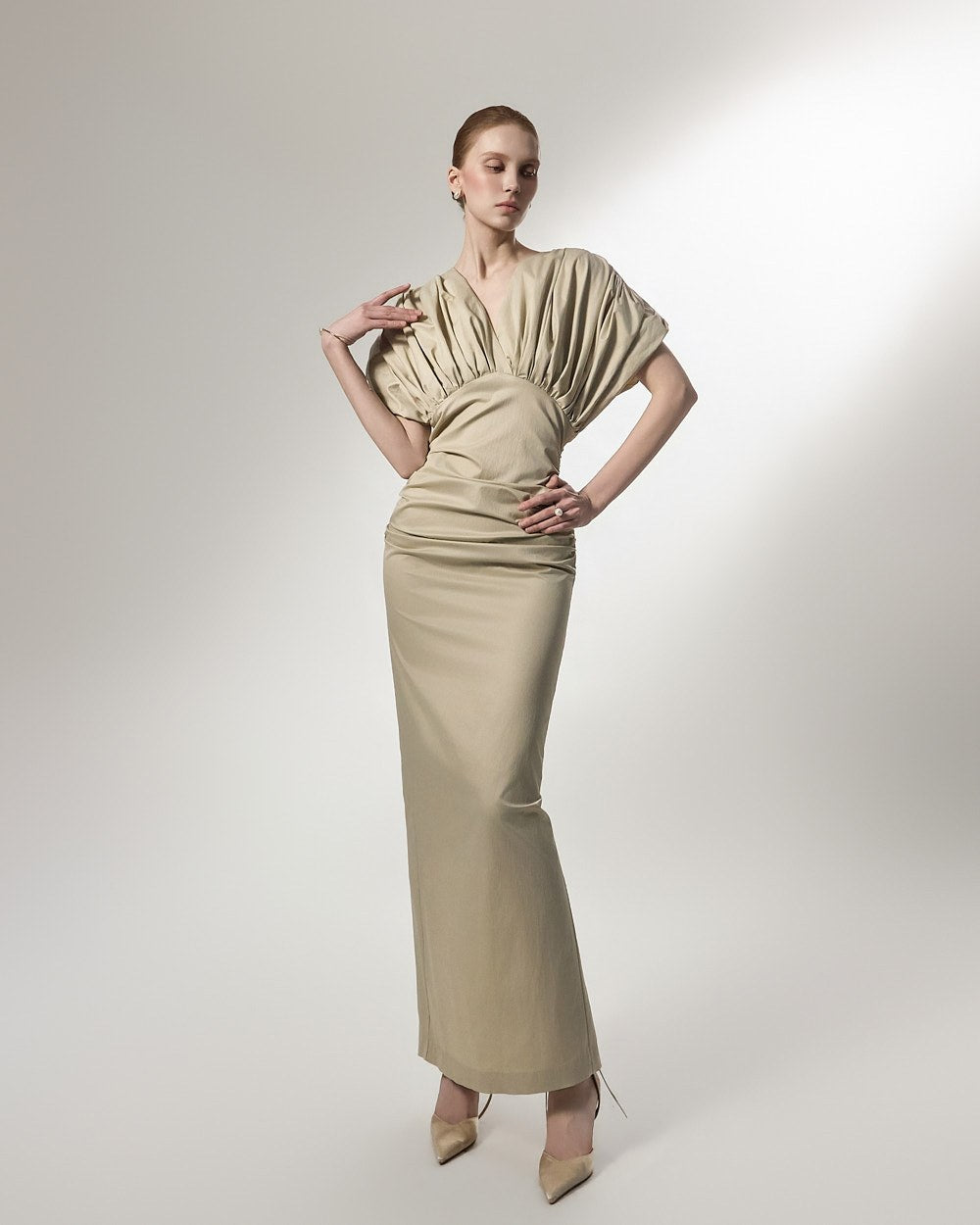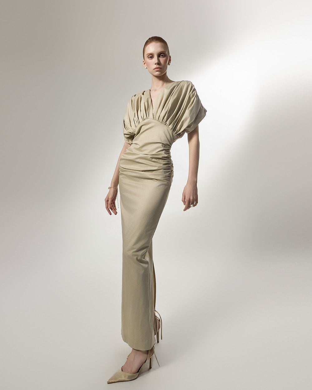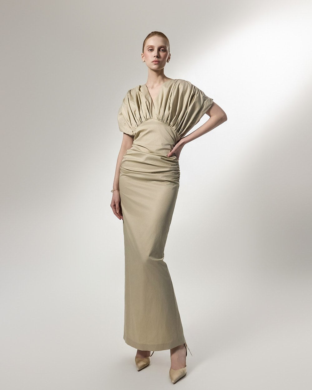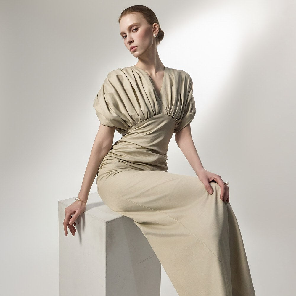 ウエスト部分に施されたシャーリングディテールは、体に優しくフィットし、