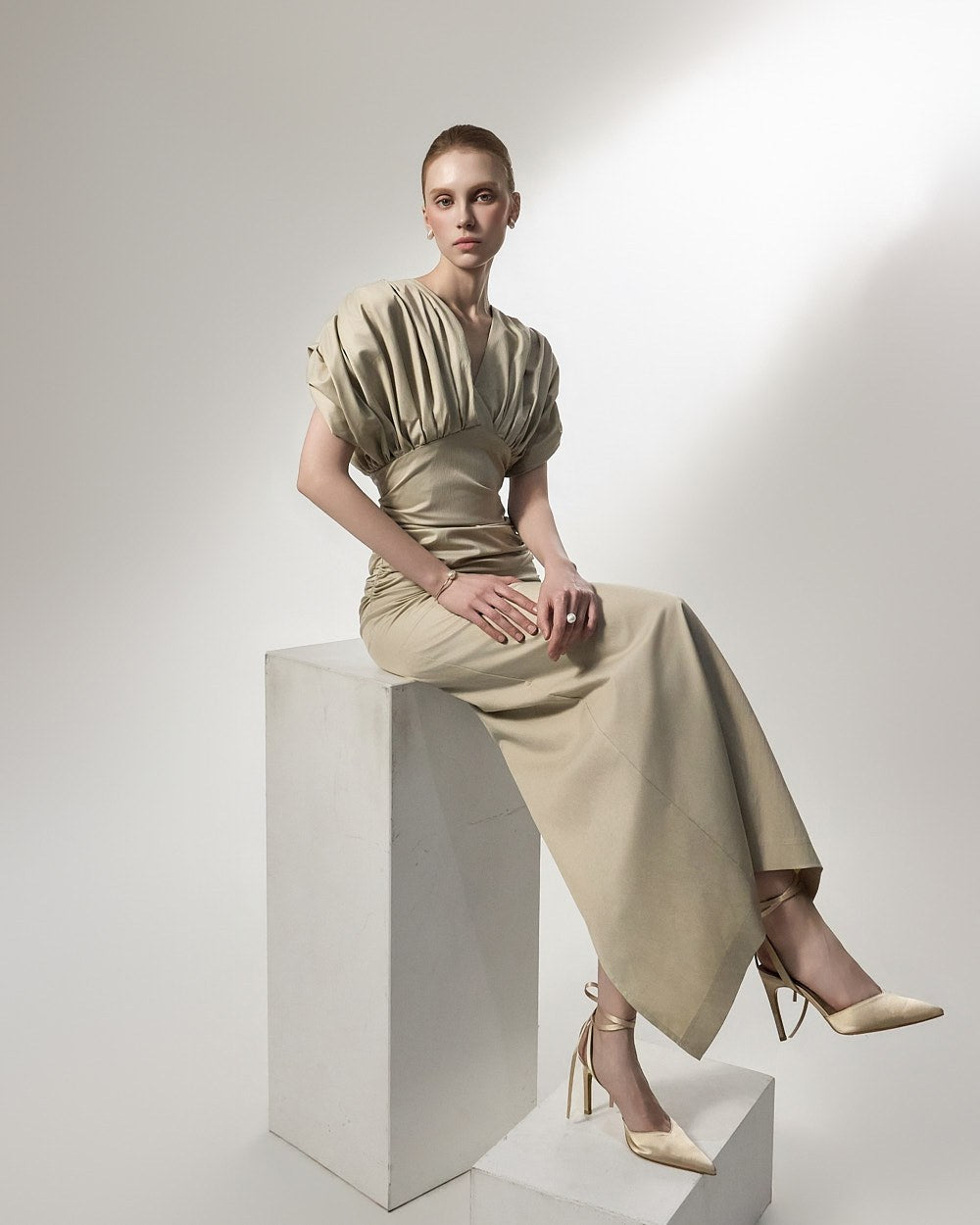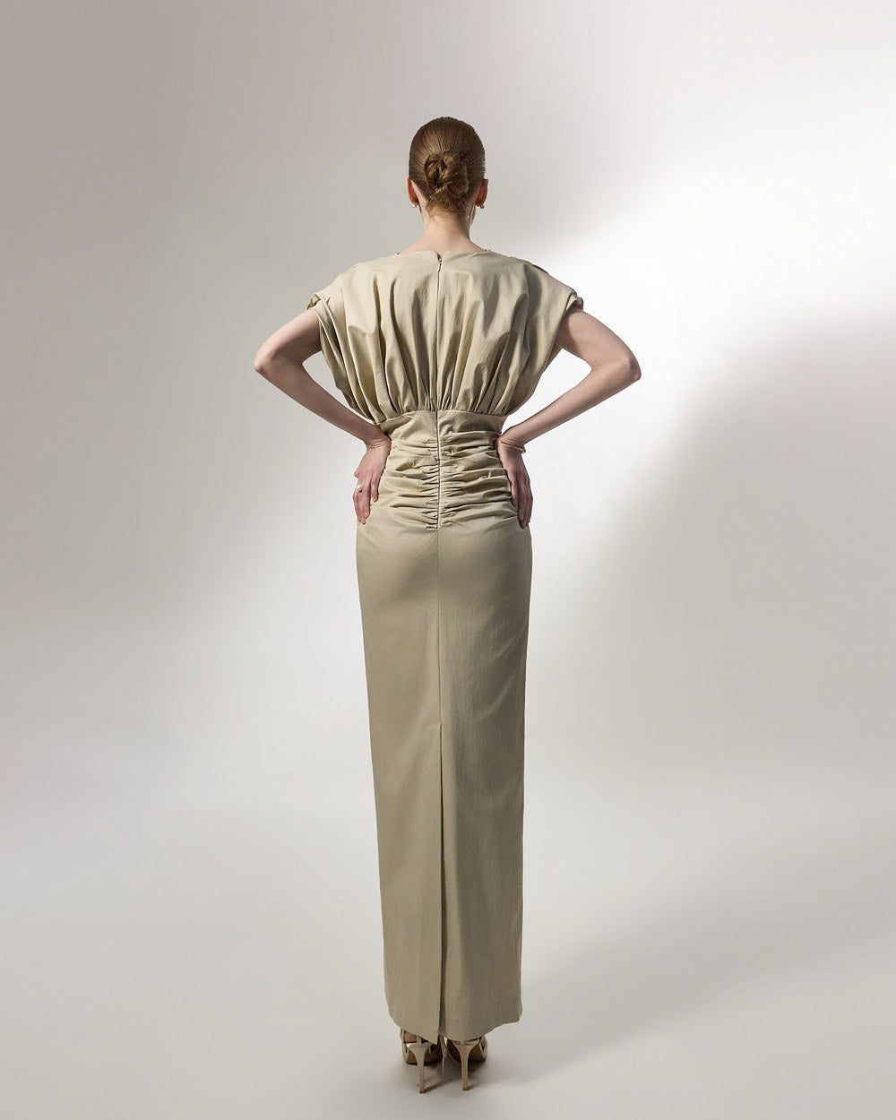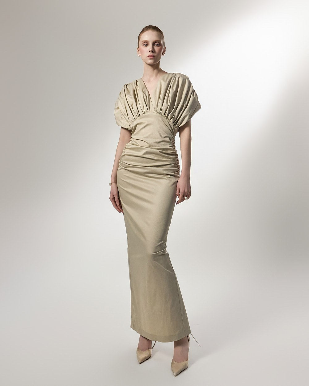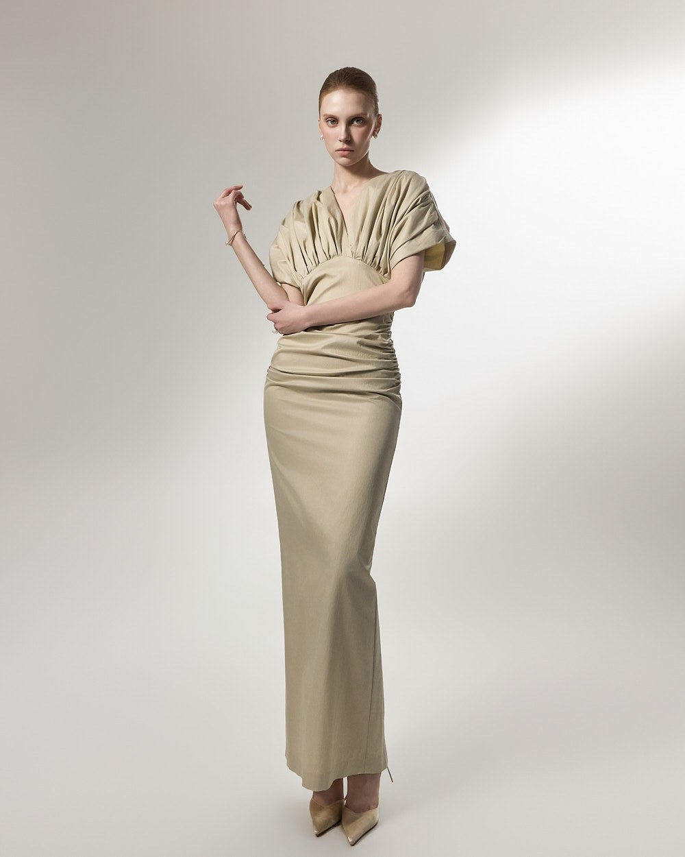 ウエスト部分に施されたシャーリングディテールは、体に優しくフィットし、