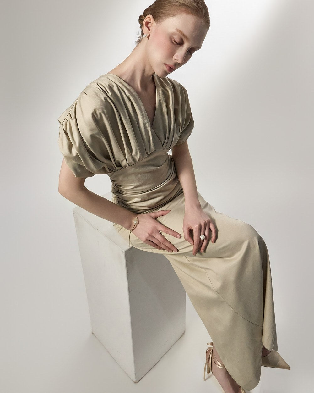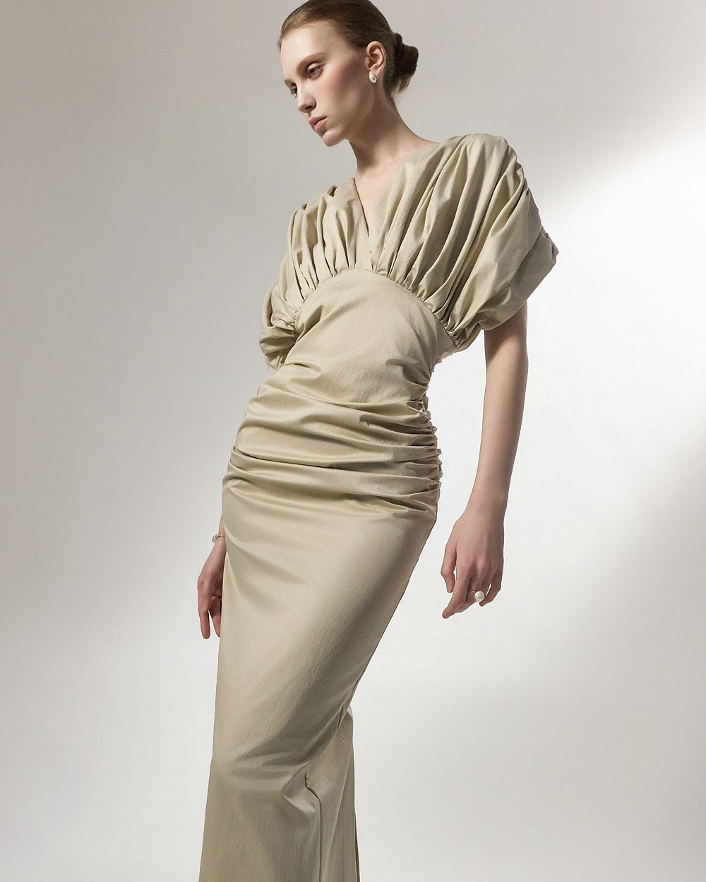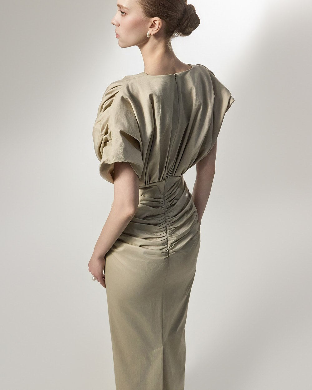 深いVネックラインとボリューム感のあるパフスリーブが