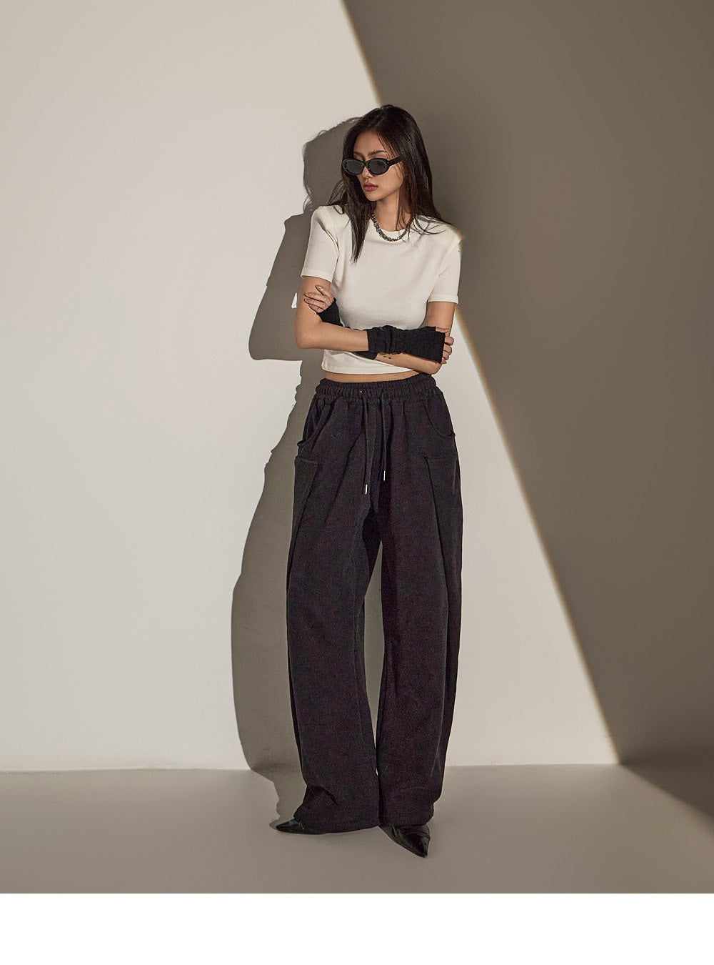 丸いネックラインが全体の印象に優しい雰囲気を添えます。