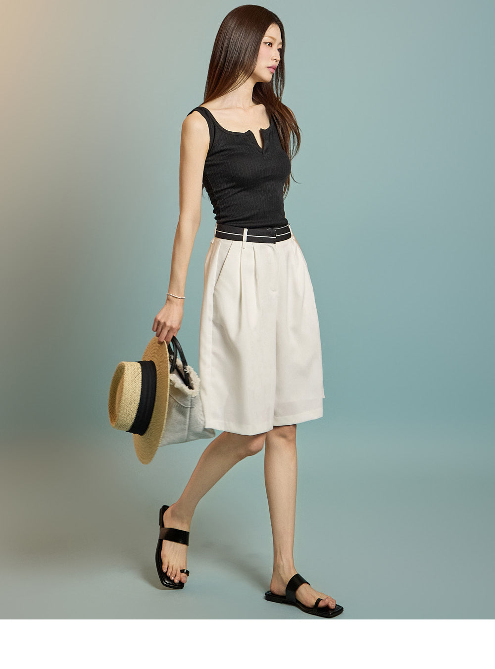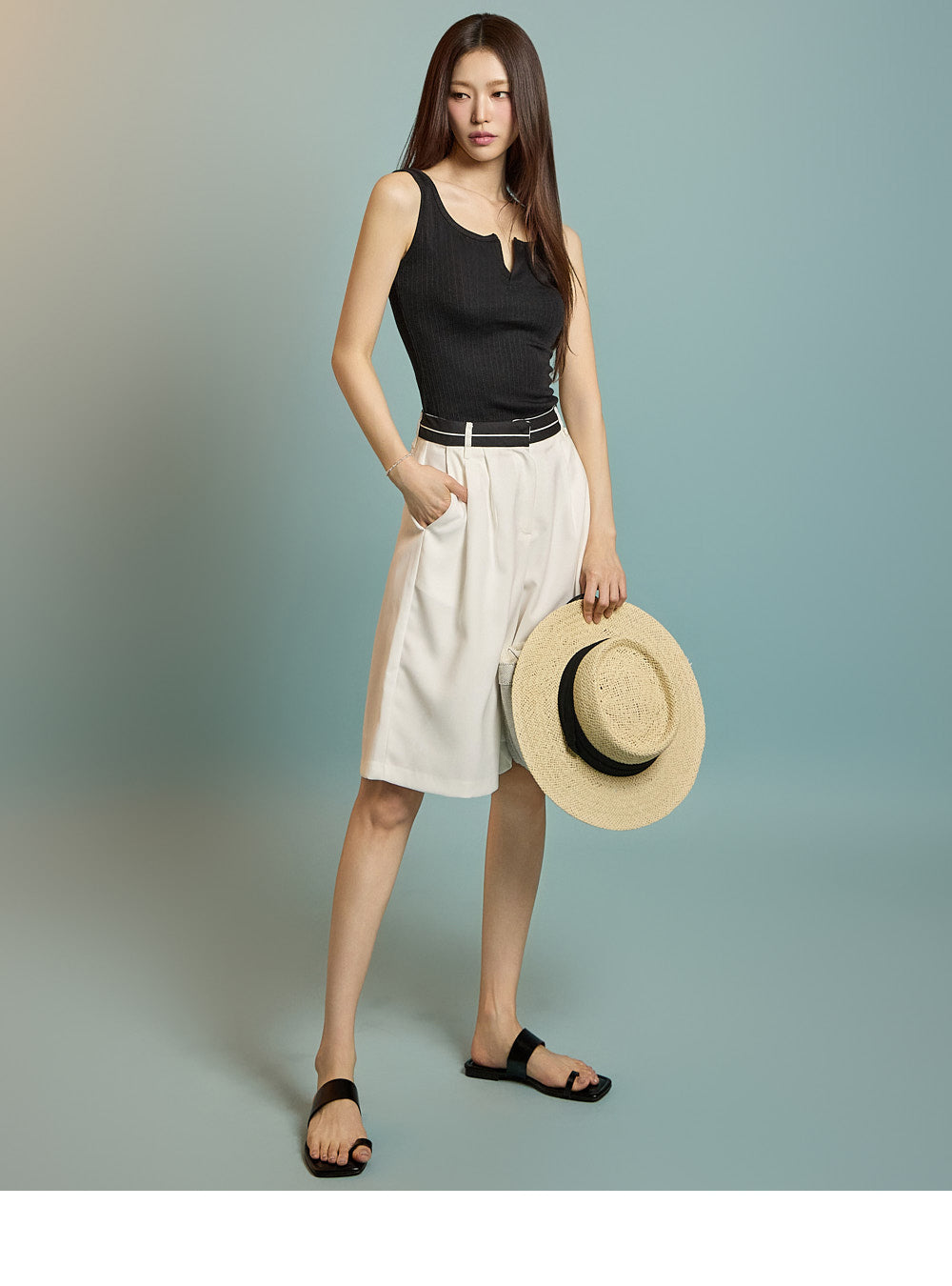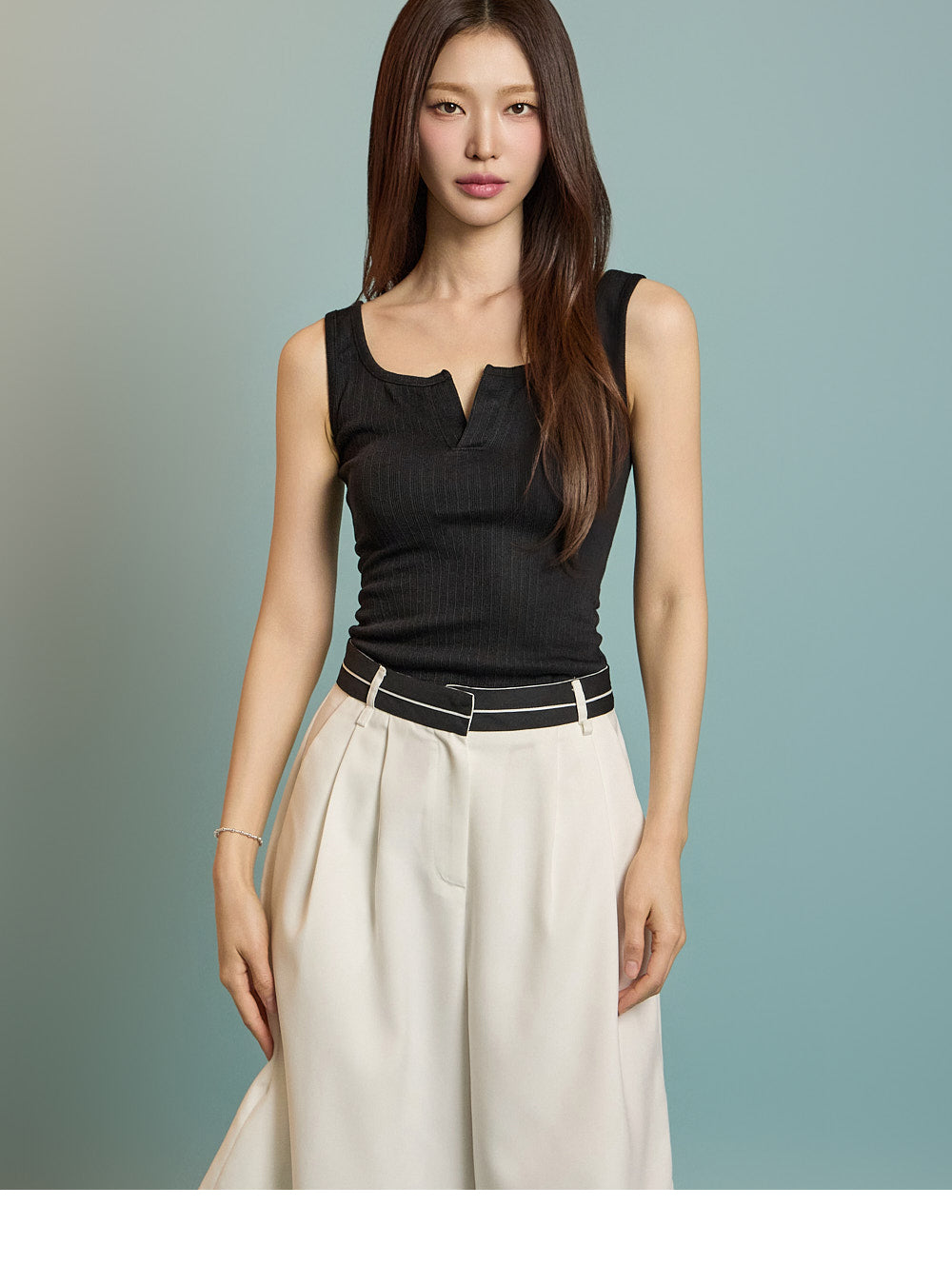 カジュアルなムードのスリットノースリーブトップスです。