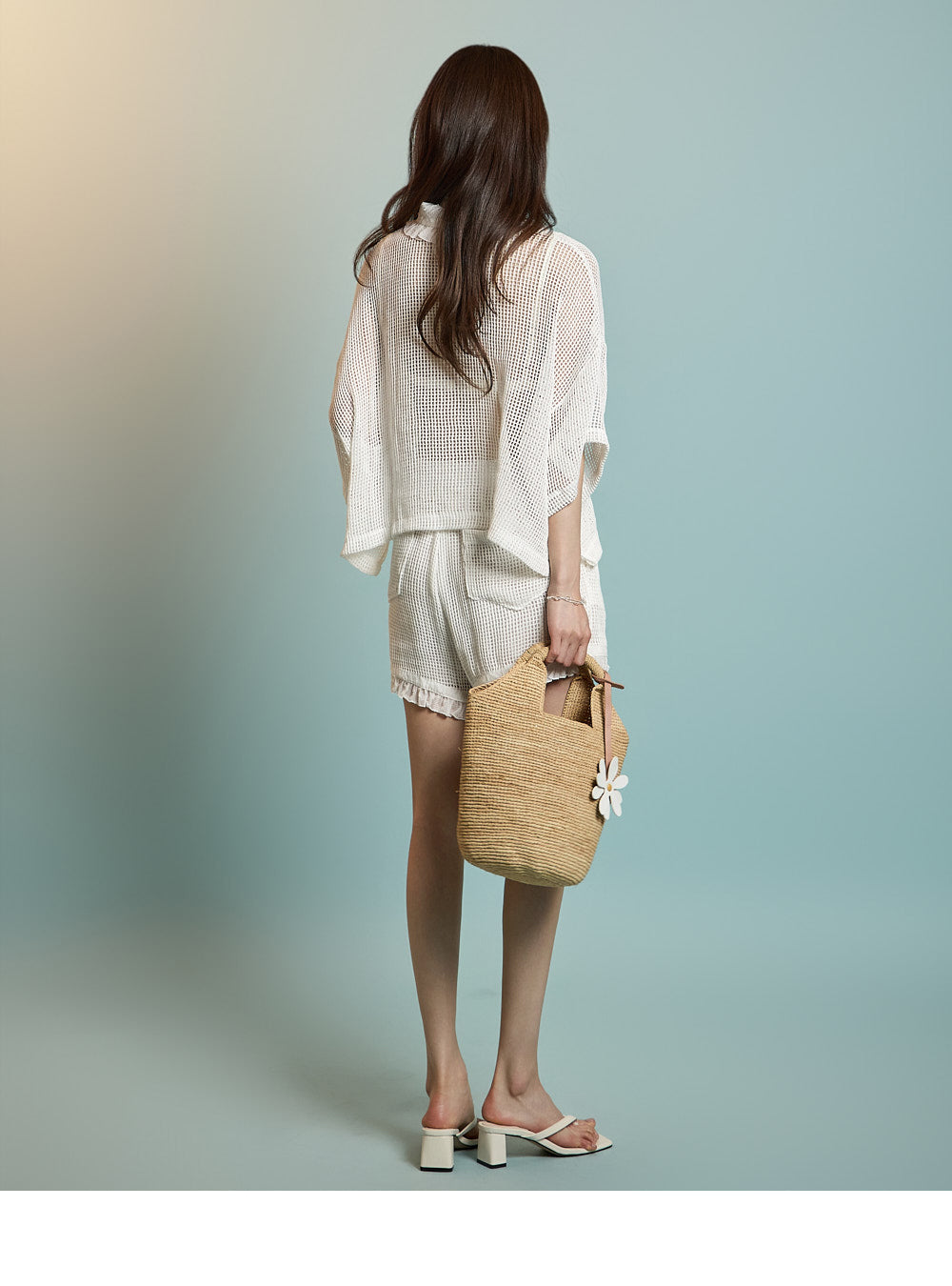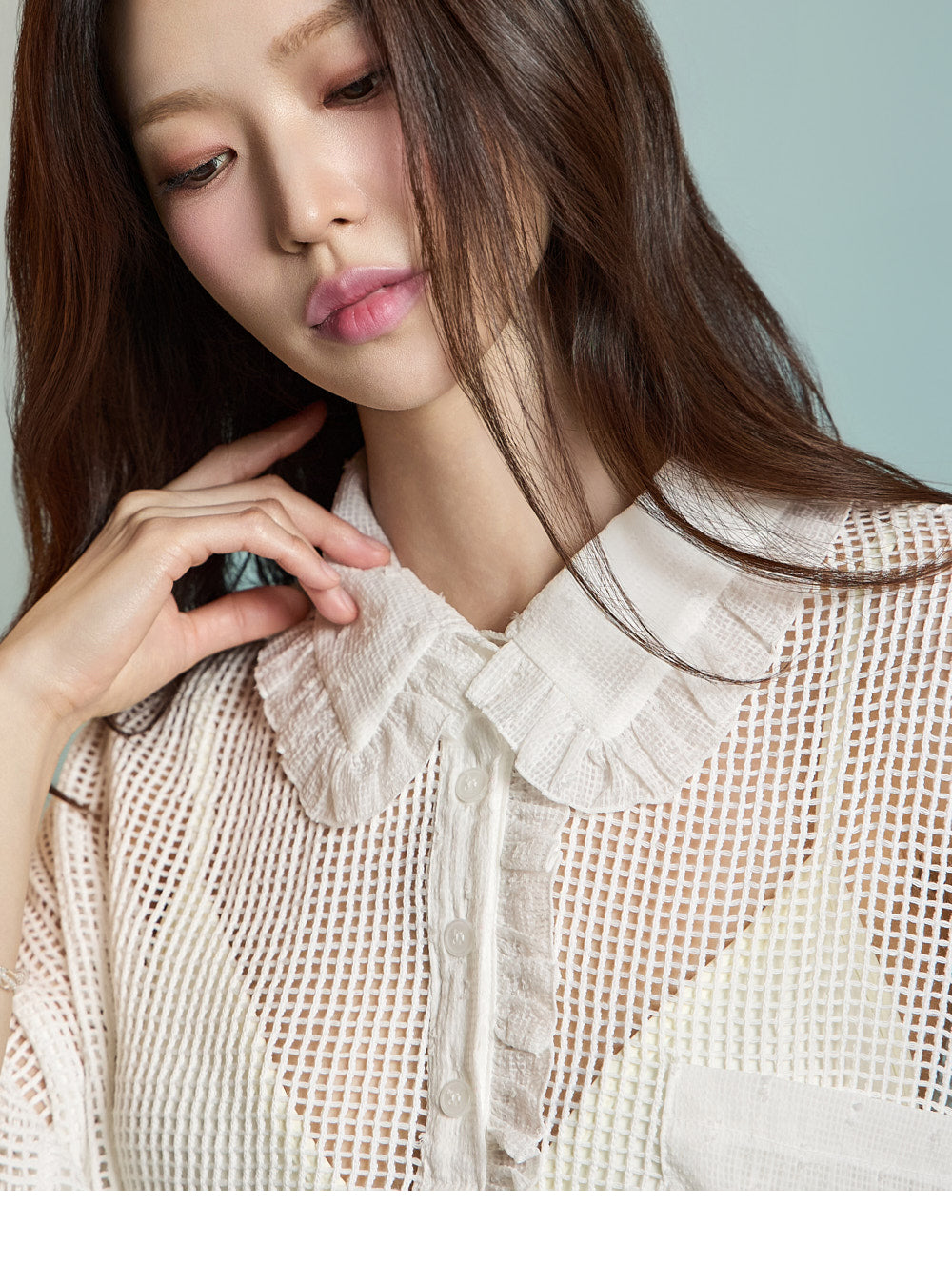 襟元のフリルディテールが魅力を添えています。