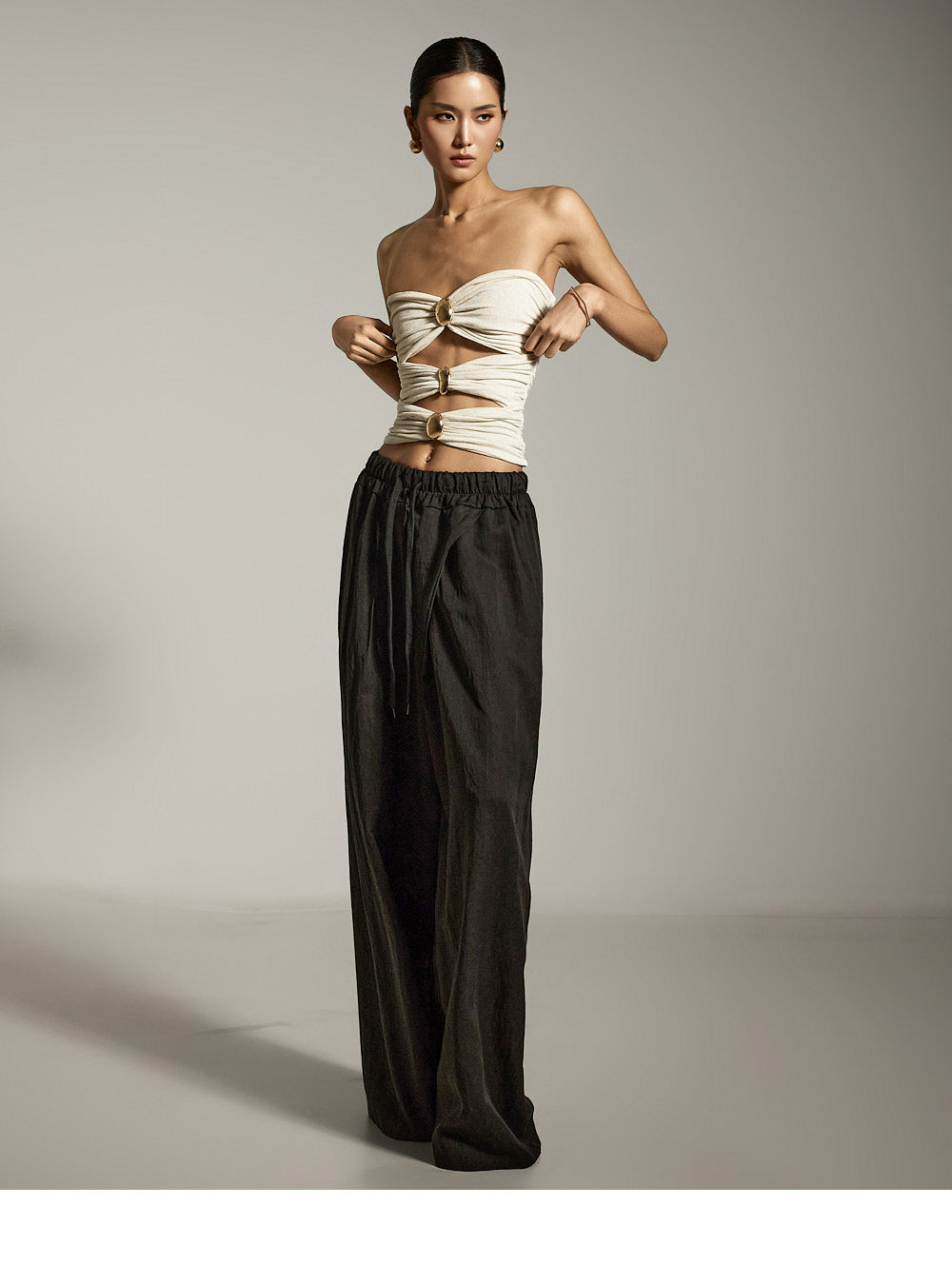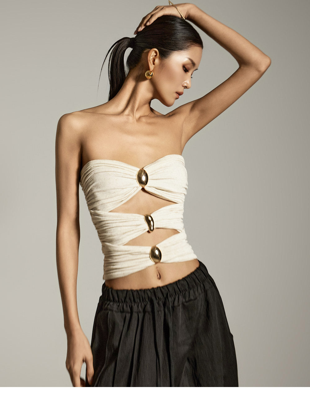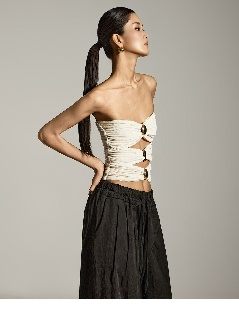 カットアウトシャーリングトップスは、活発でスタイリッシュなムードを演出します。