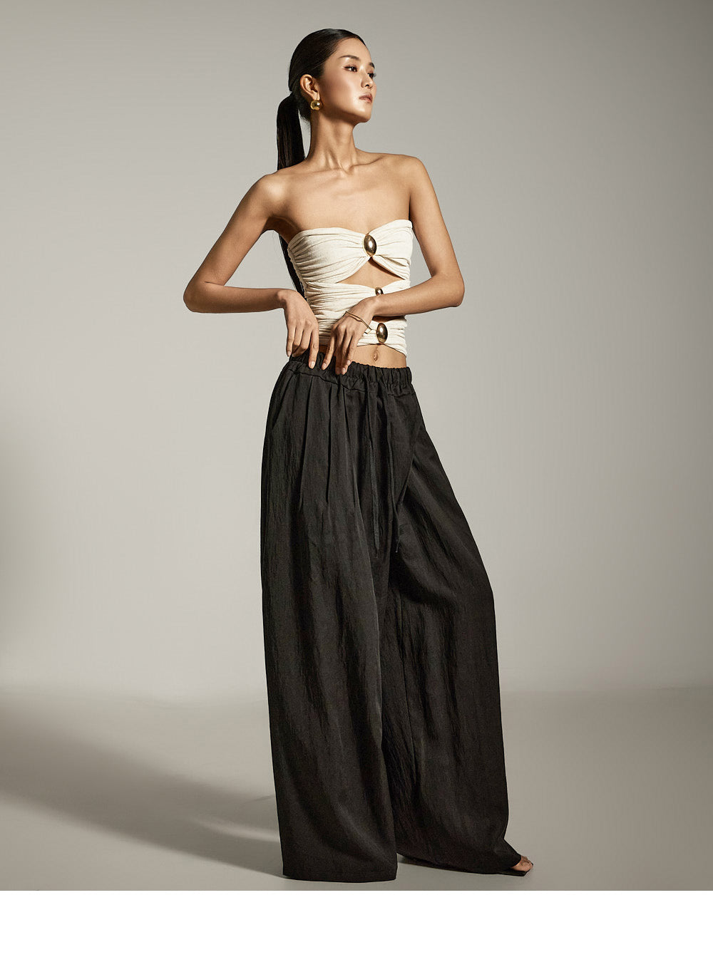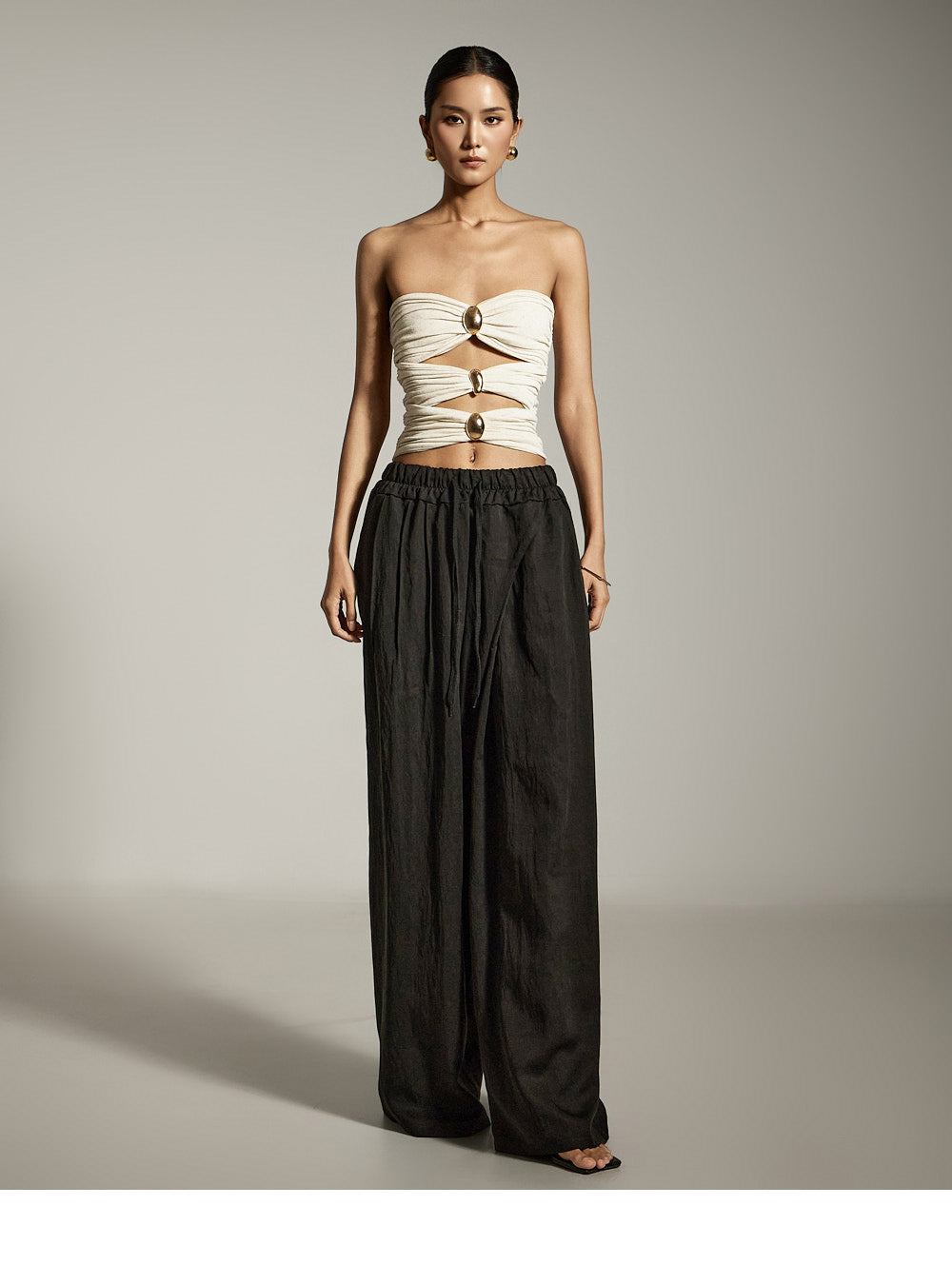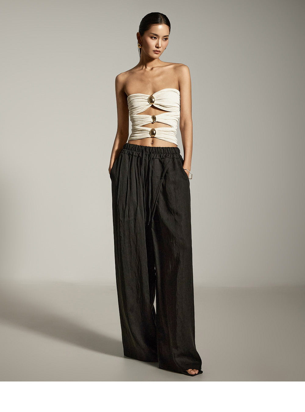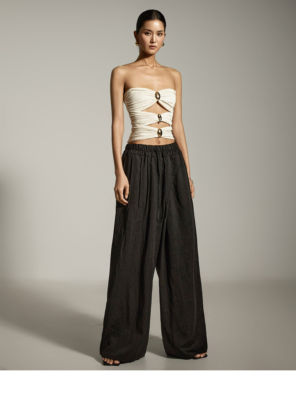 カットアウトシャーリングトップスは、活発でスタイリッシュなムードを演出します。