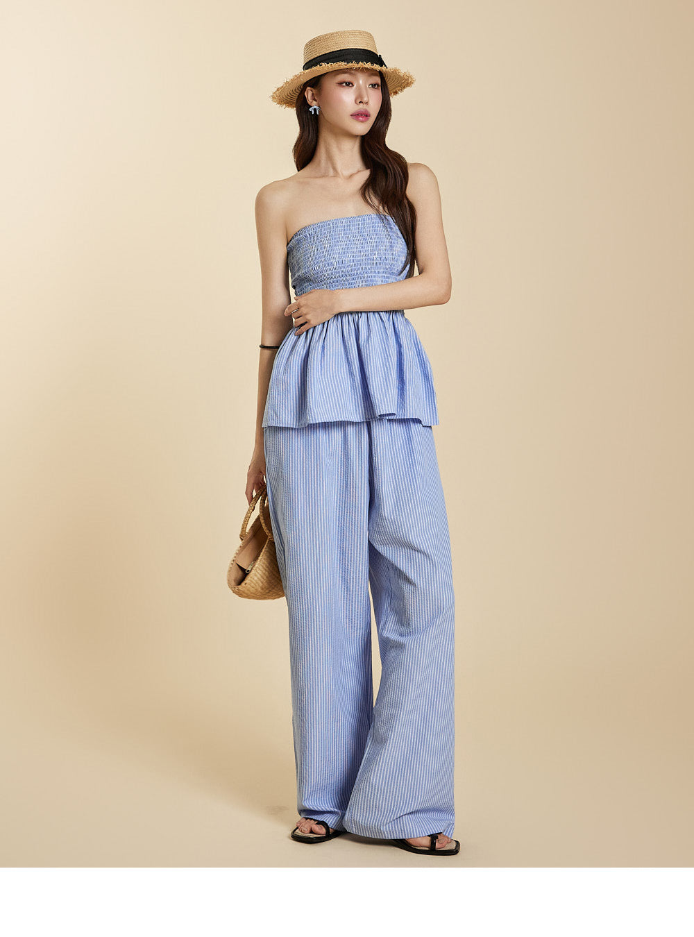 カジュアルスタイルのスモックストラップレスチューブトップです。