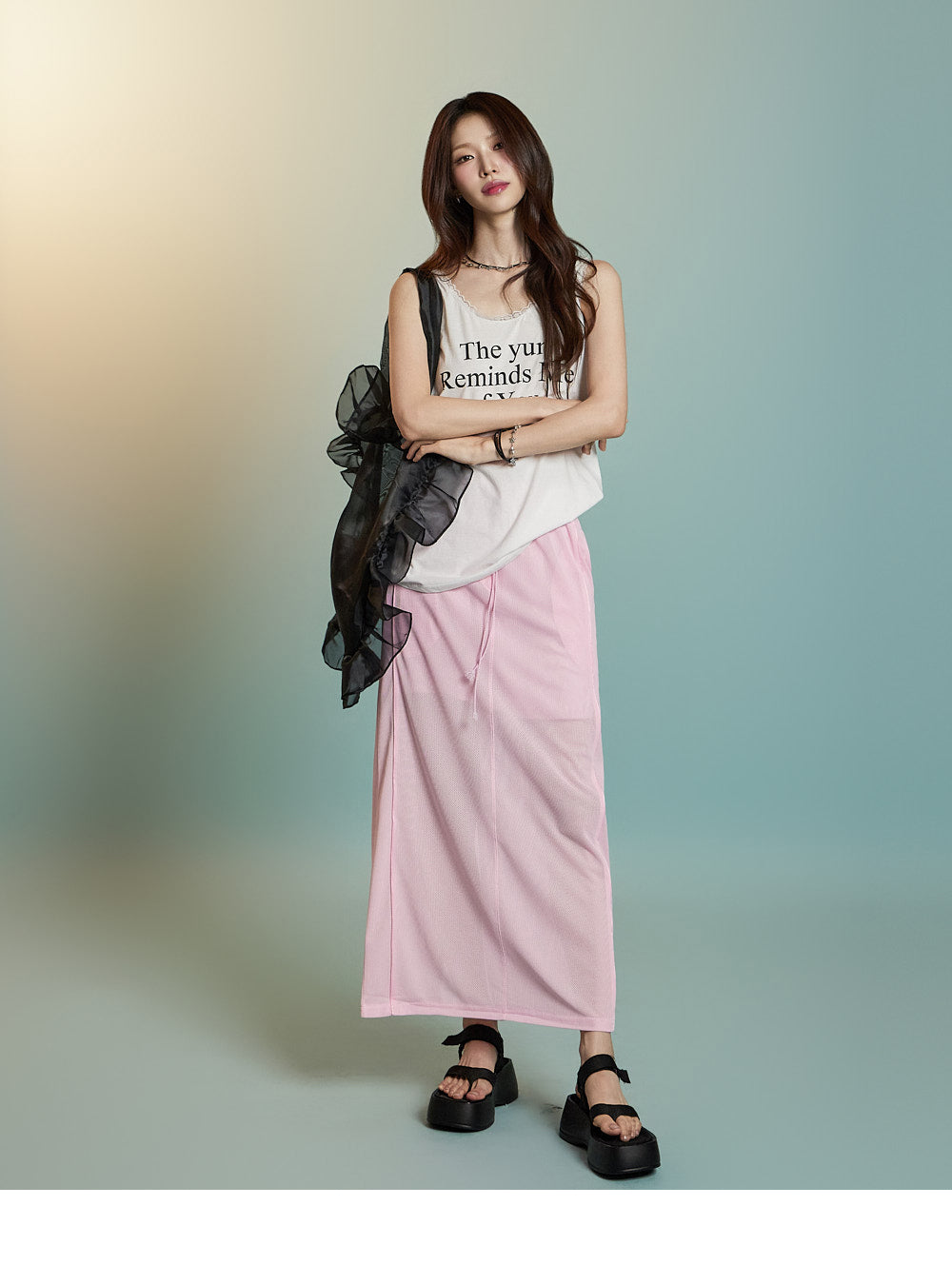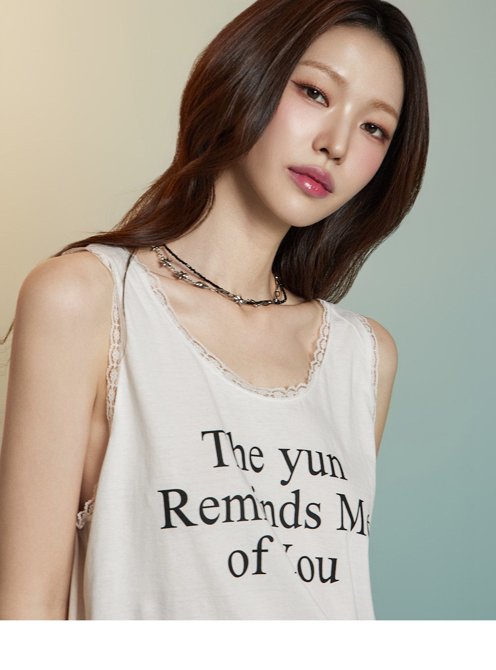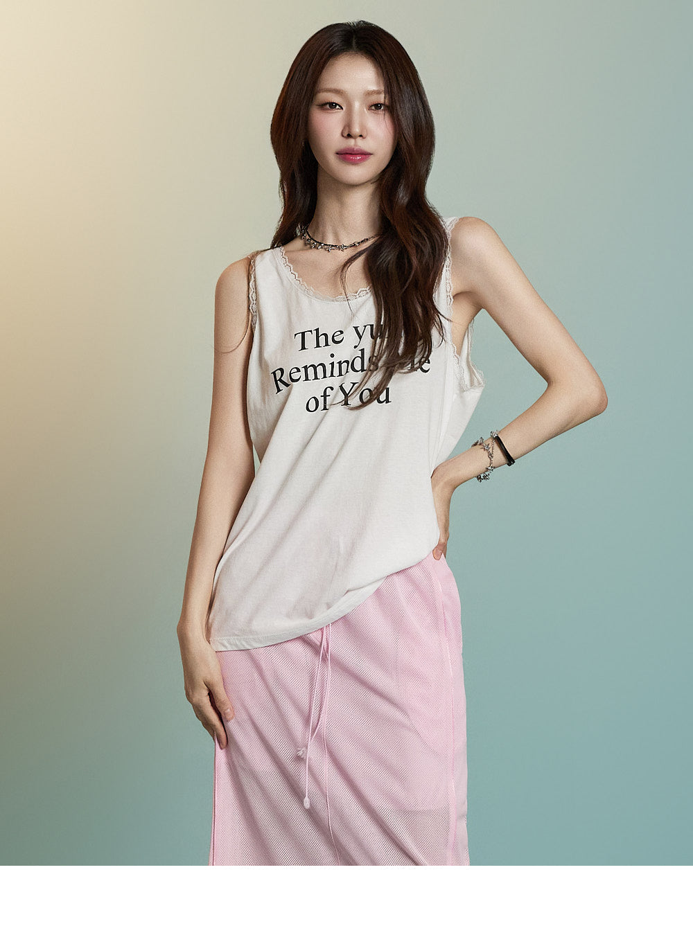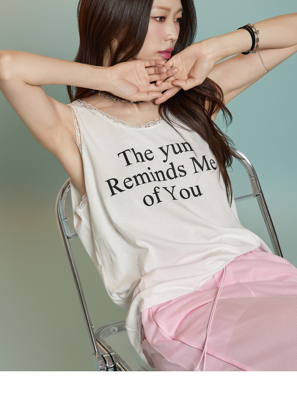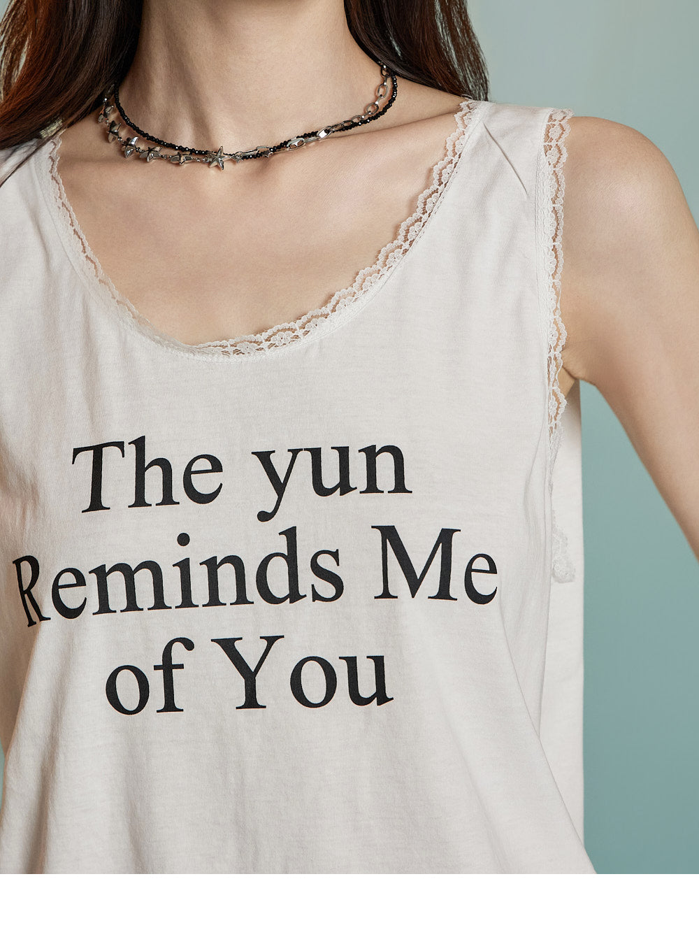 フロントにはレタリングプリントとレースのディテールが組み合わされており、