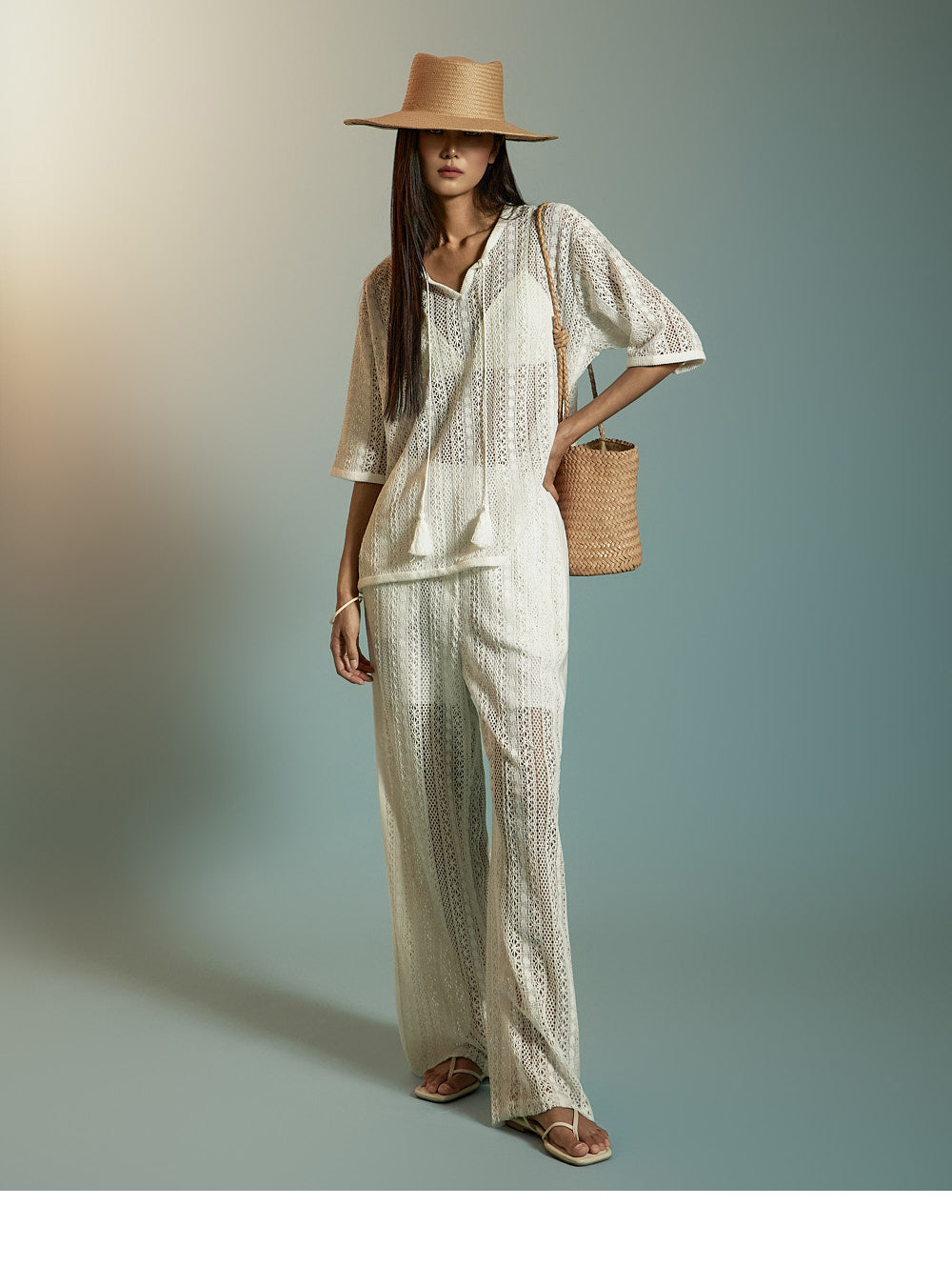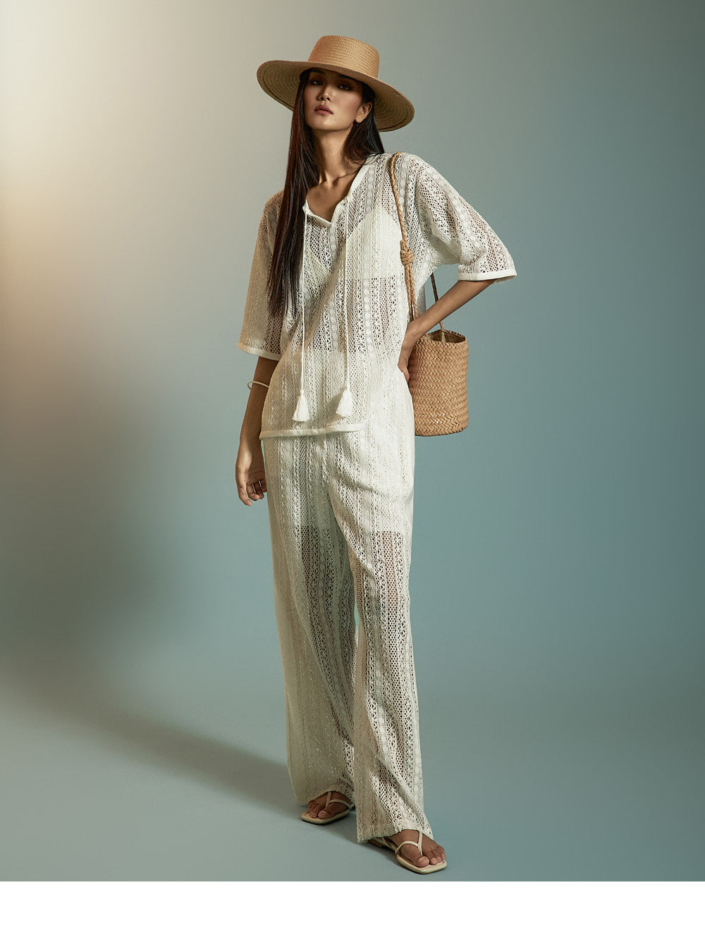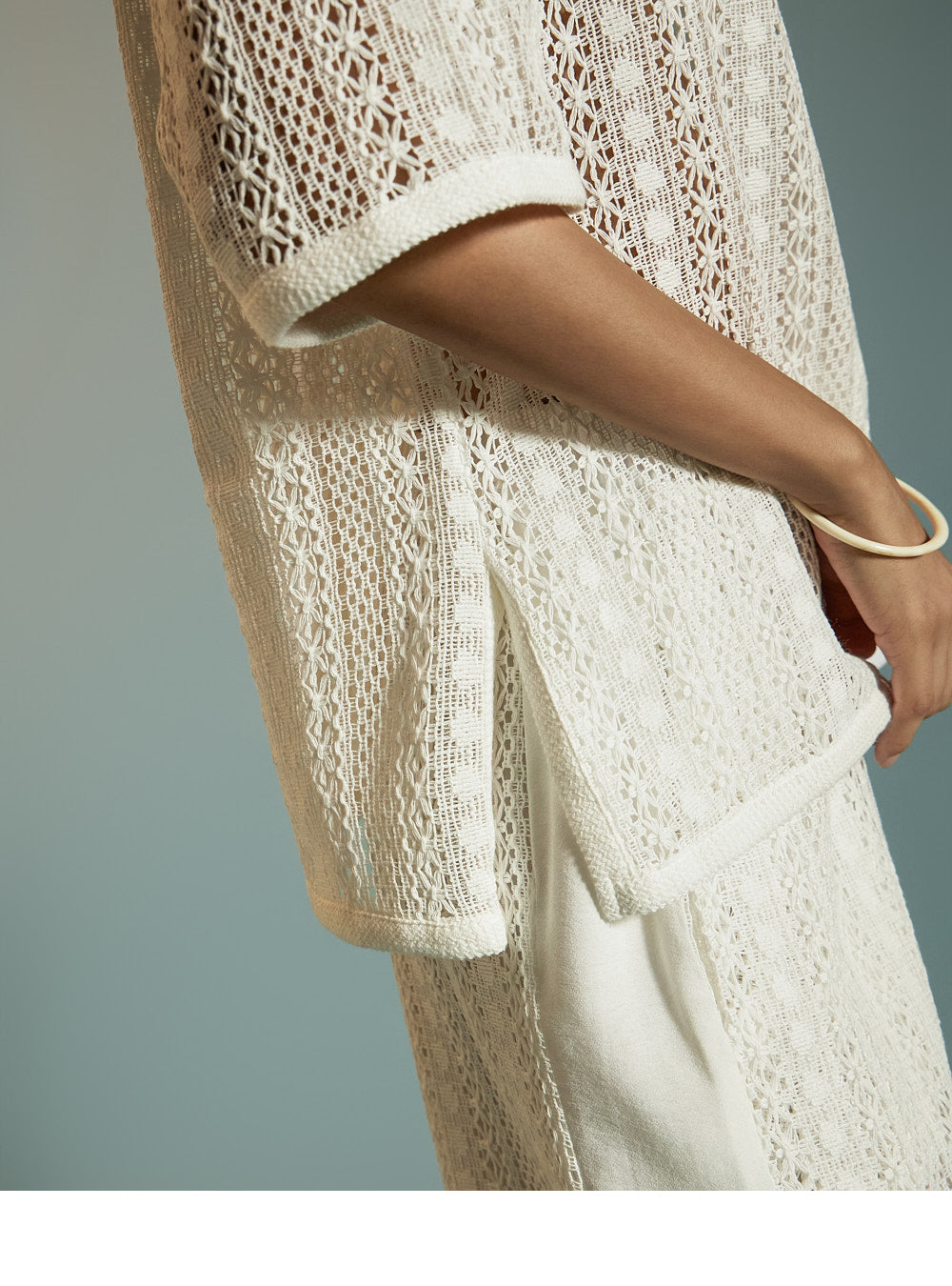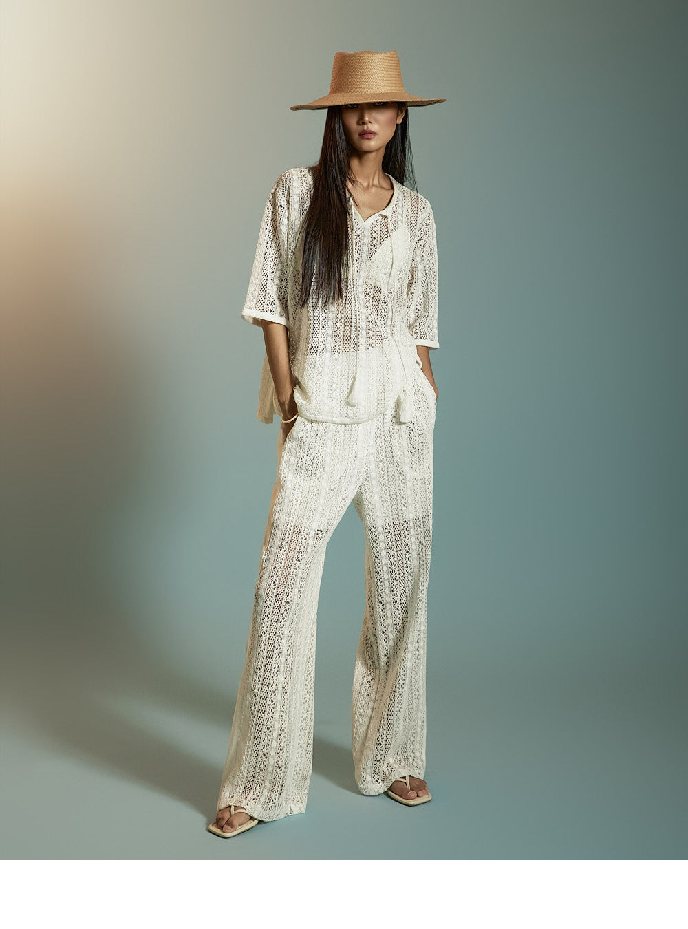 このレースニットトップスはリラックスしたカジュアルな雰囲気を醸し出します。