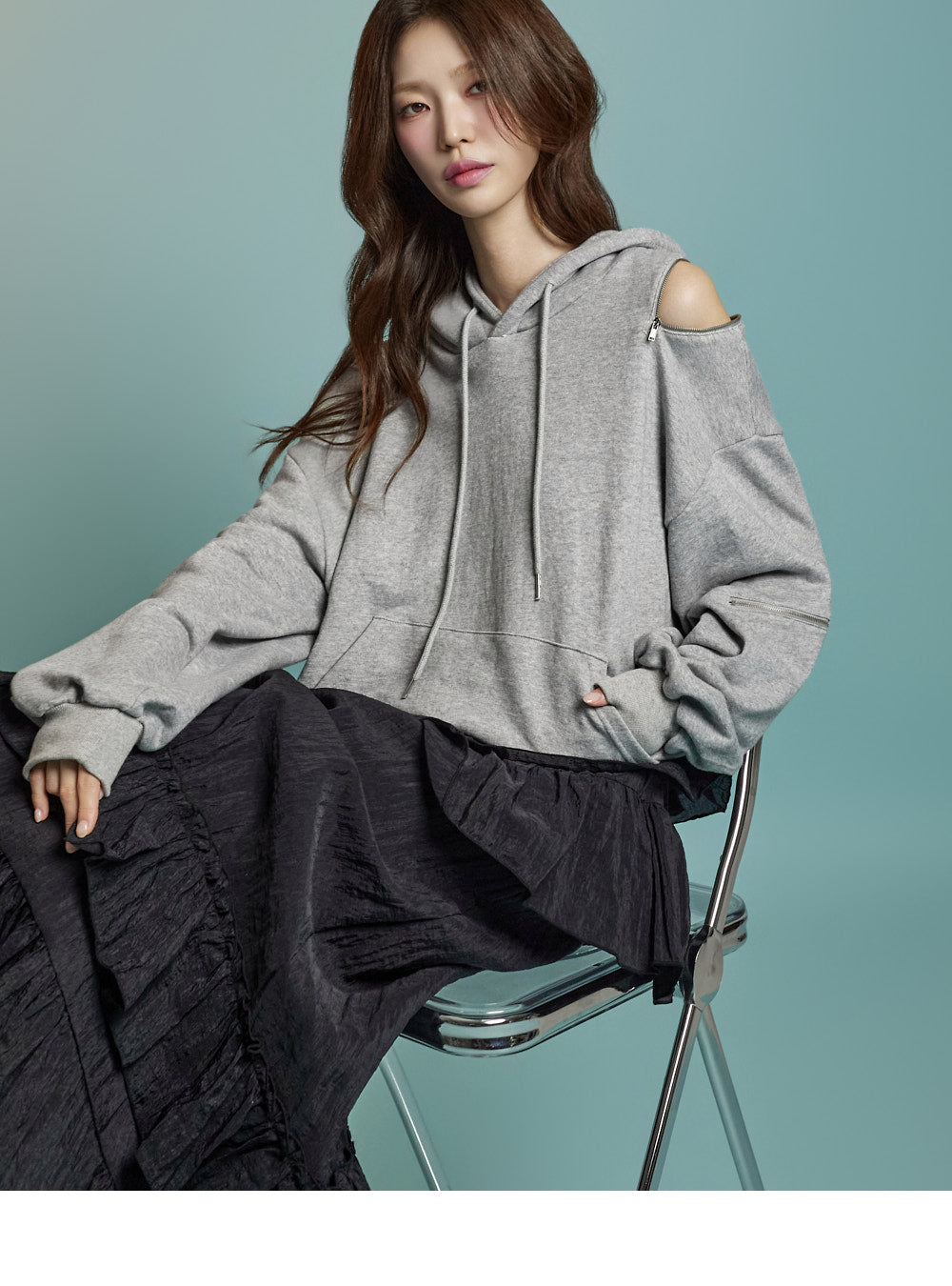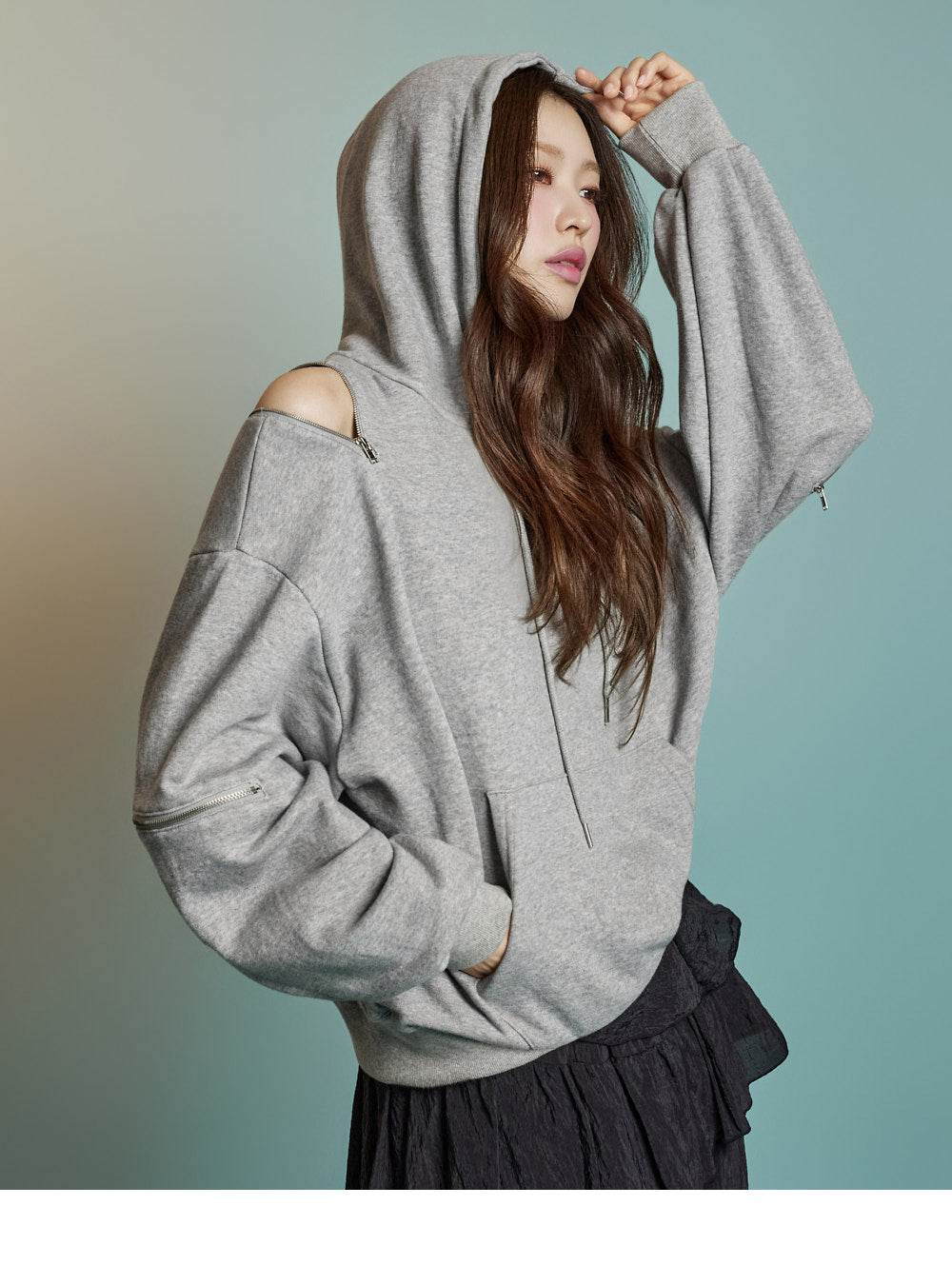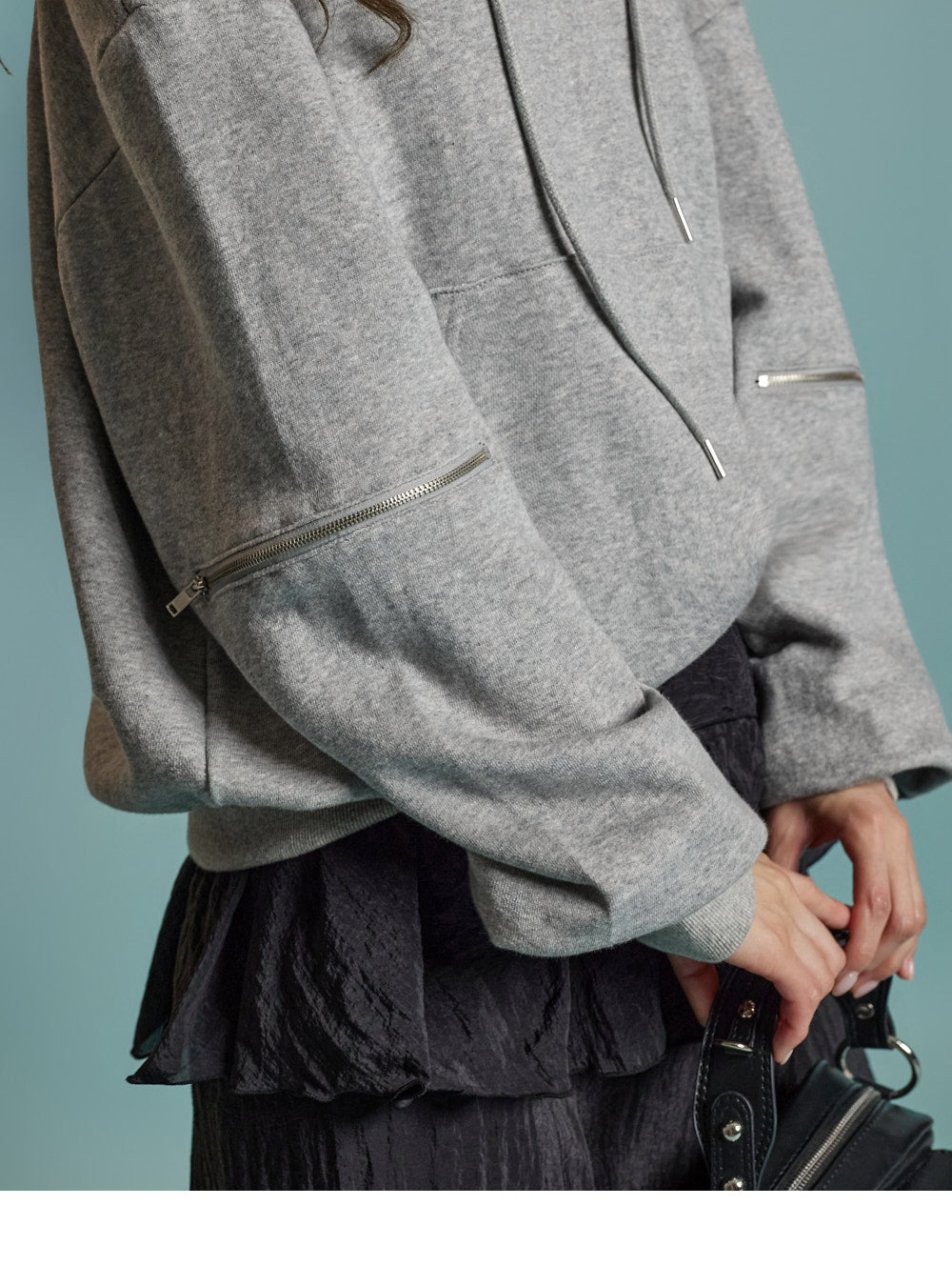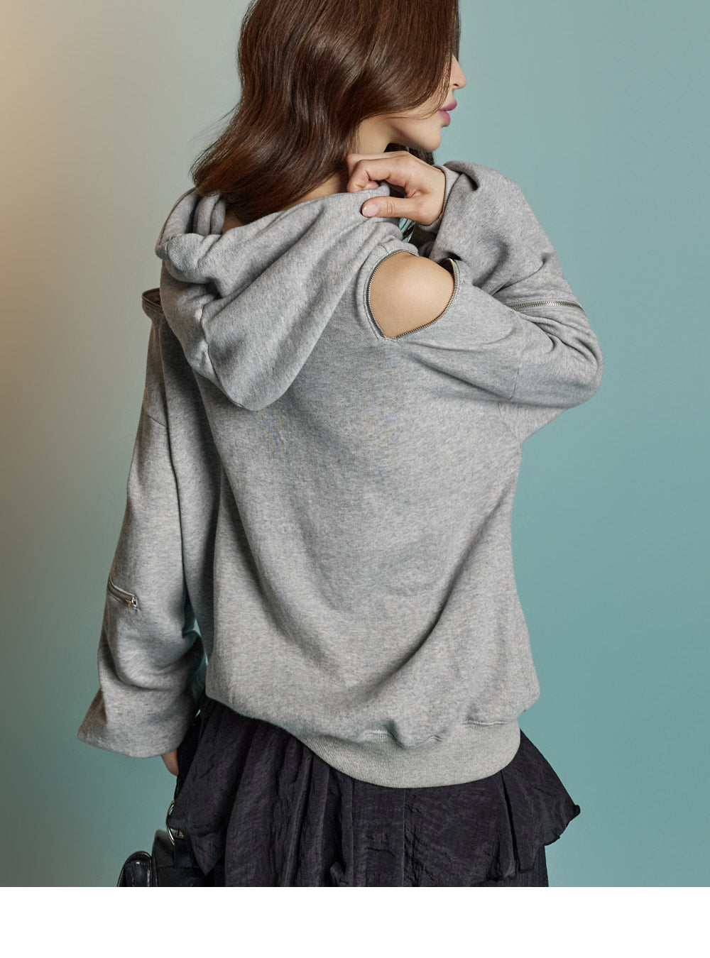 Featuring zipper details on the shoulders and sleeves,