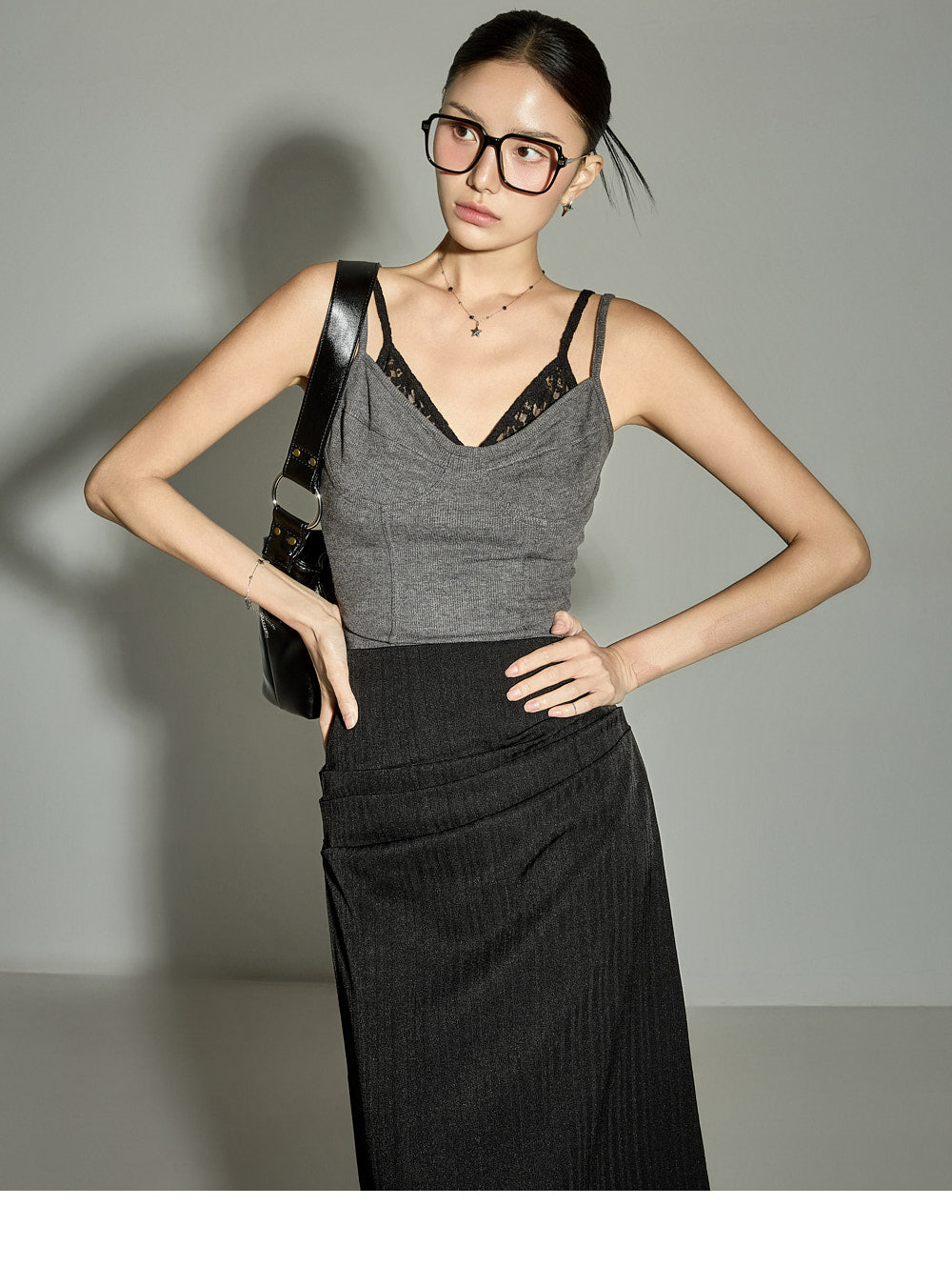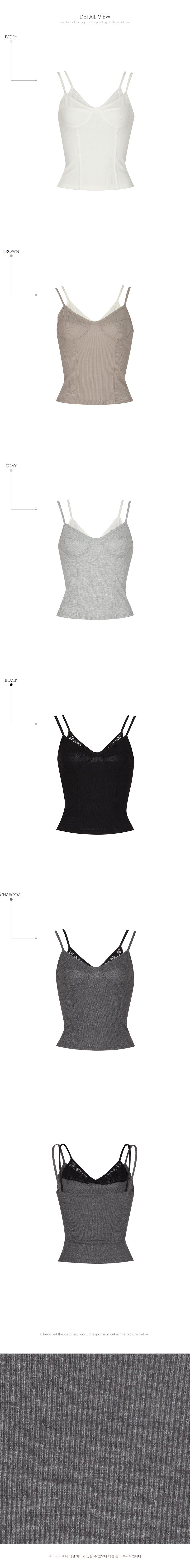 while the layered lace design and V-neck detail