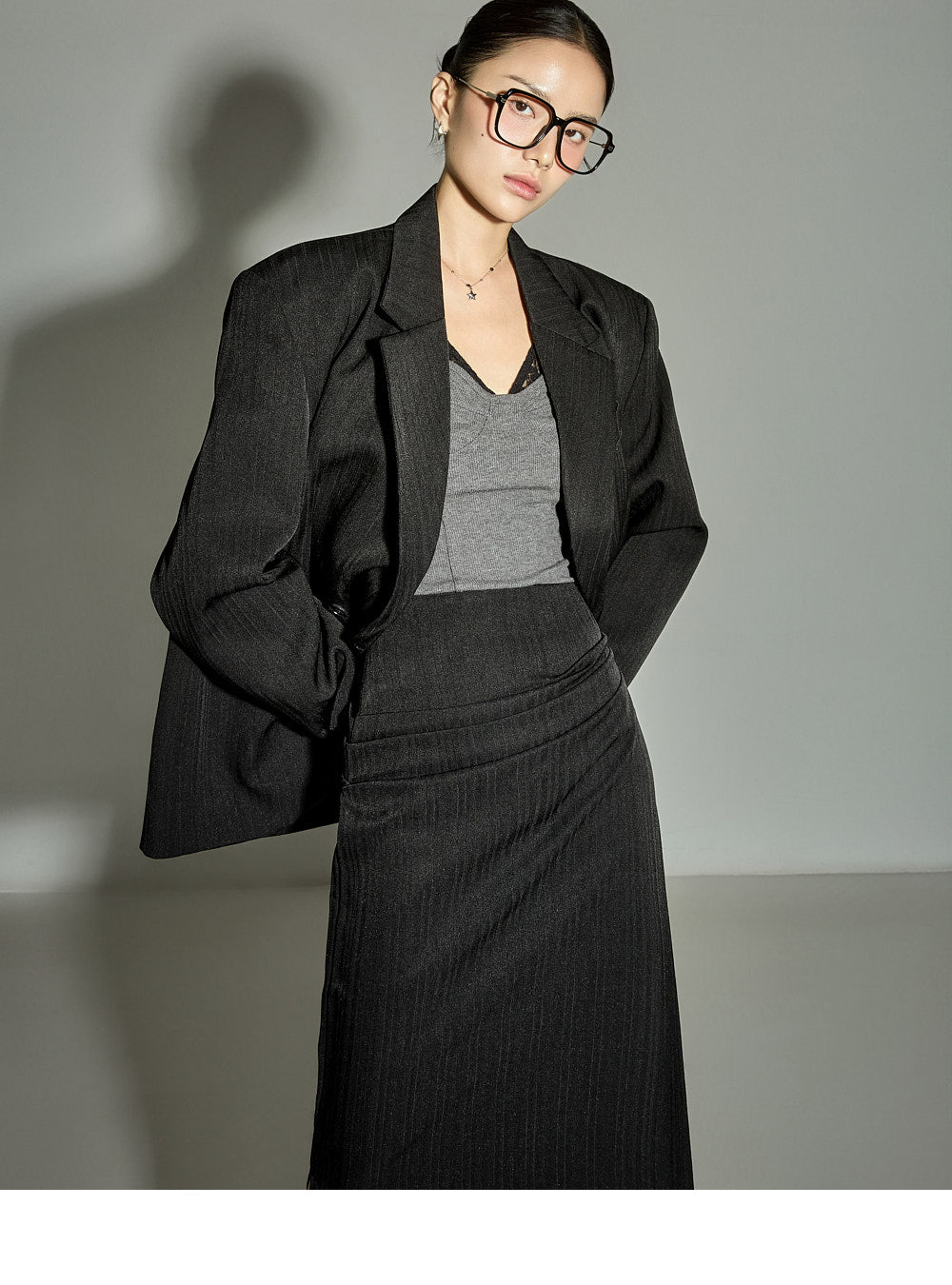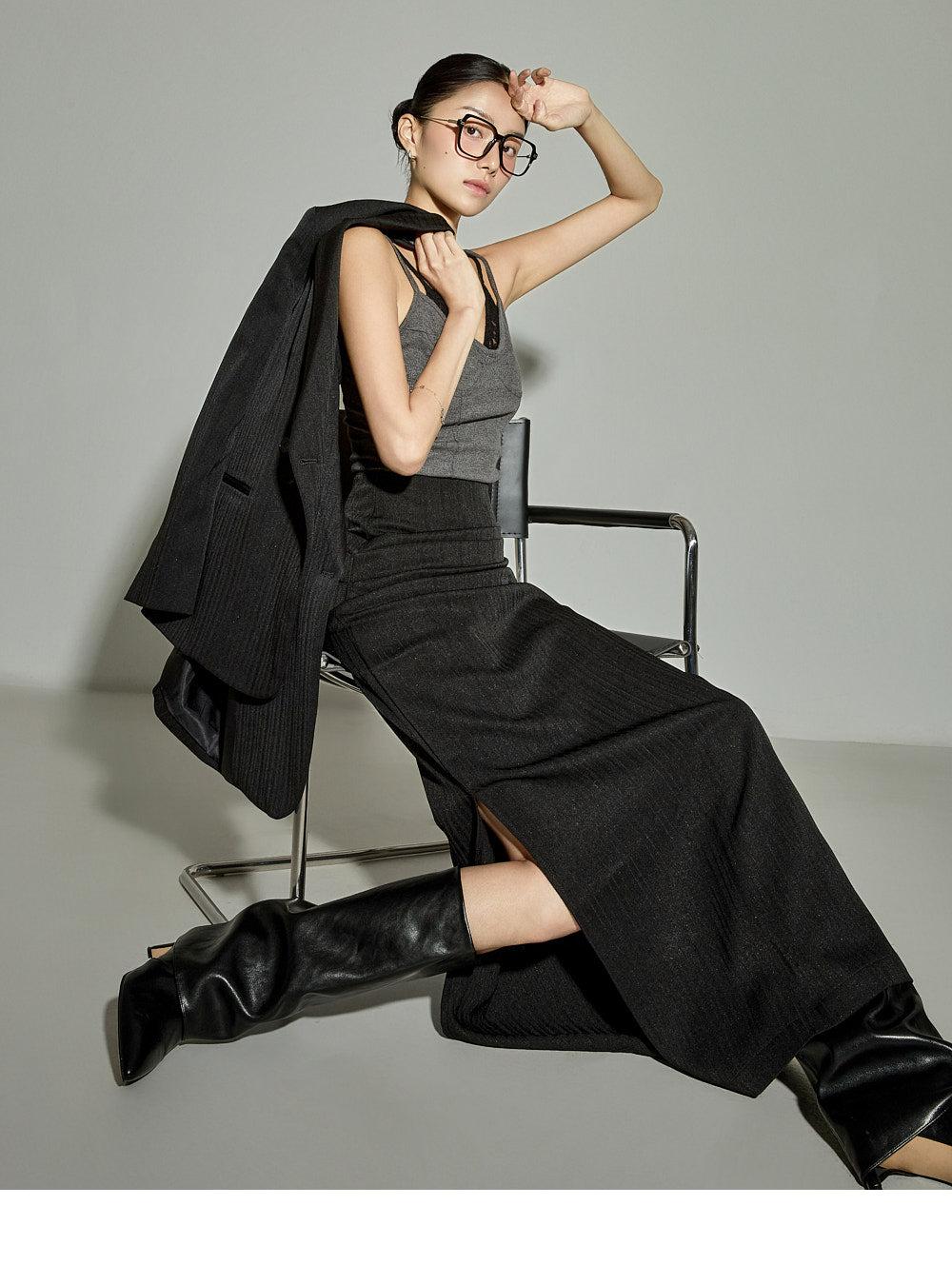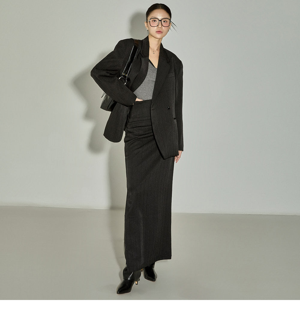 The 171cm model is wearing size One in the CHARCOAL color.