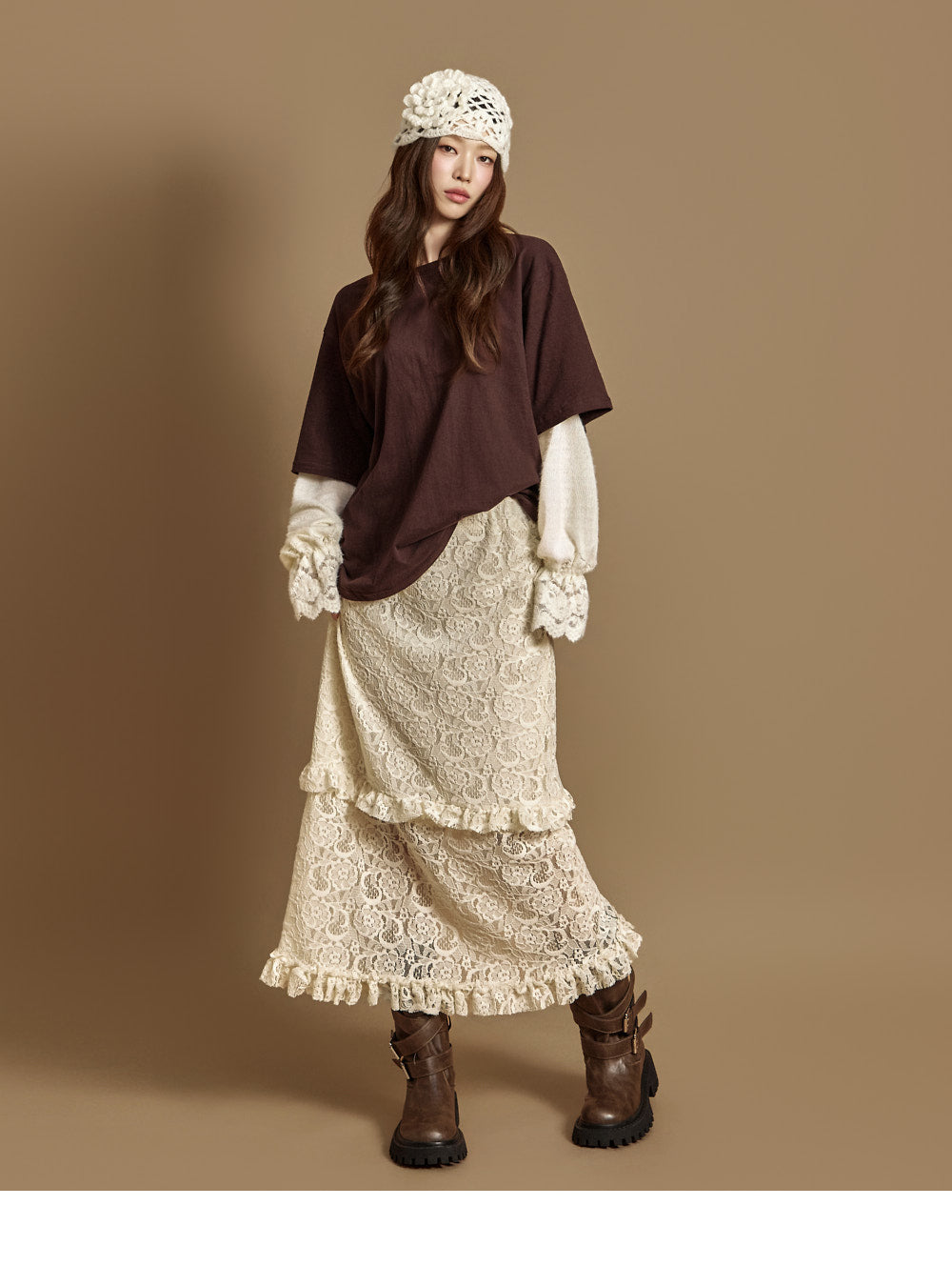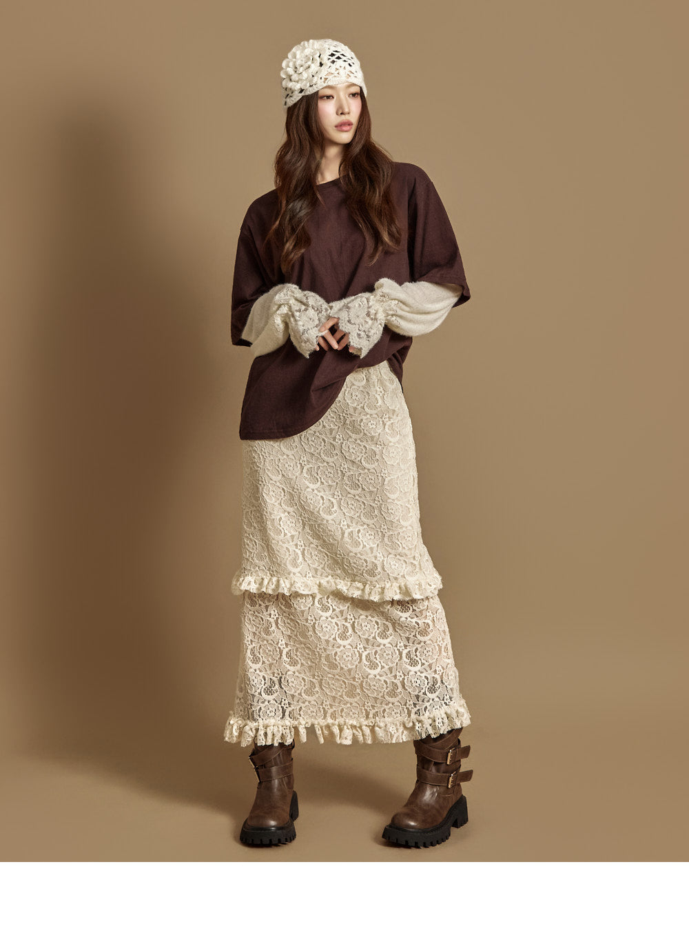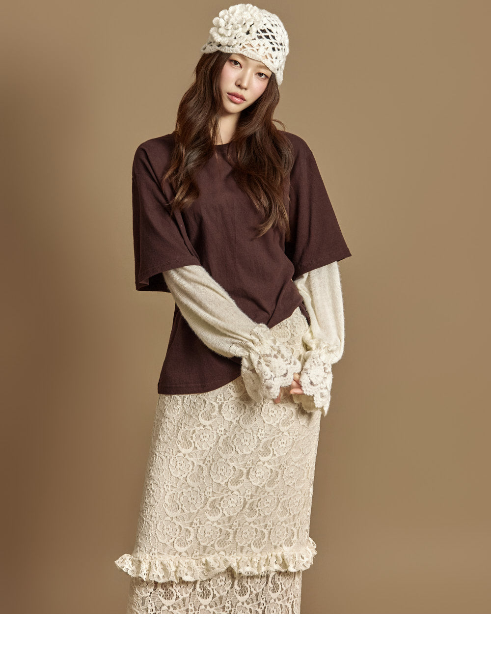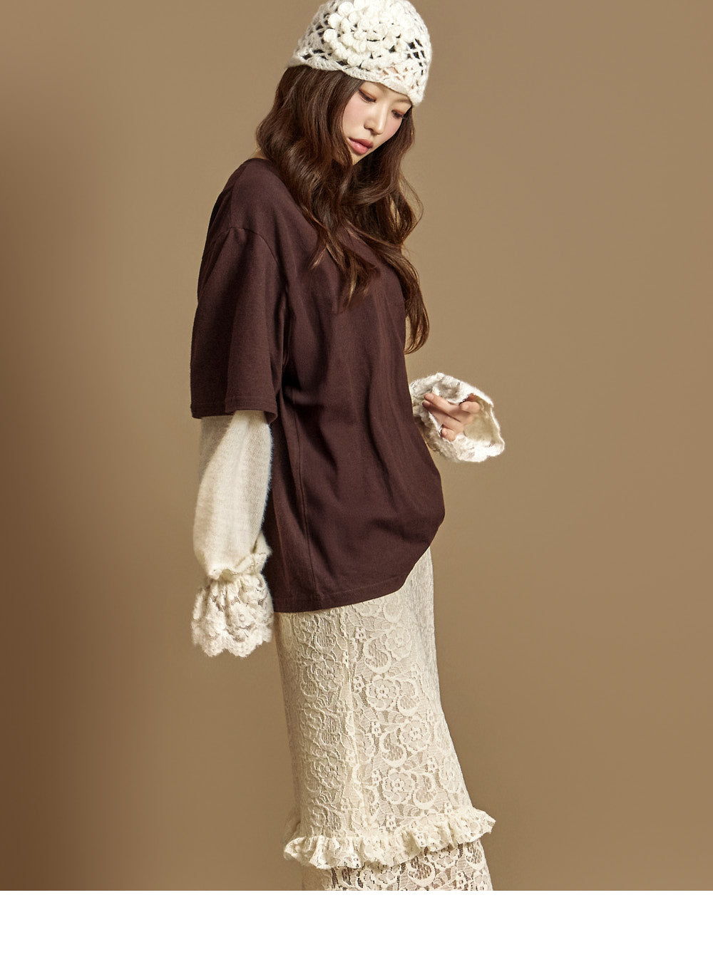 The loose fit creates a relaxed silhouette,and lace details at the sleeve hems