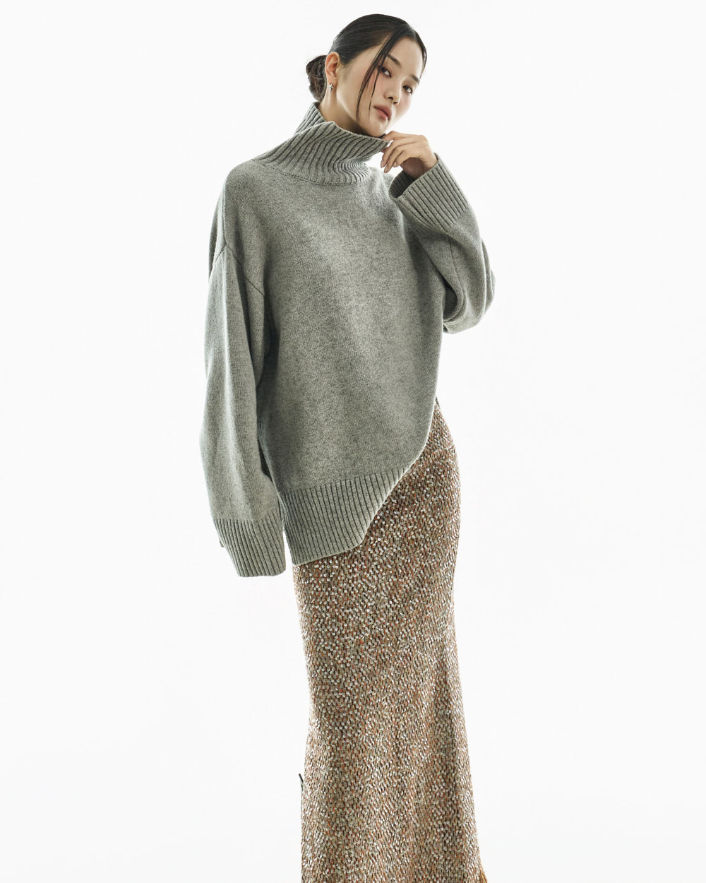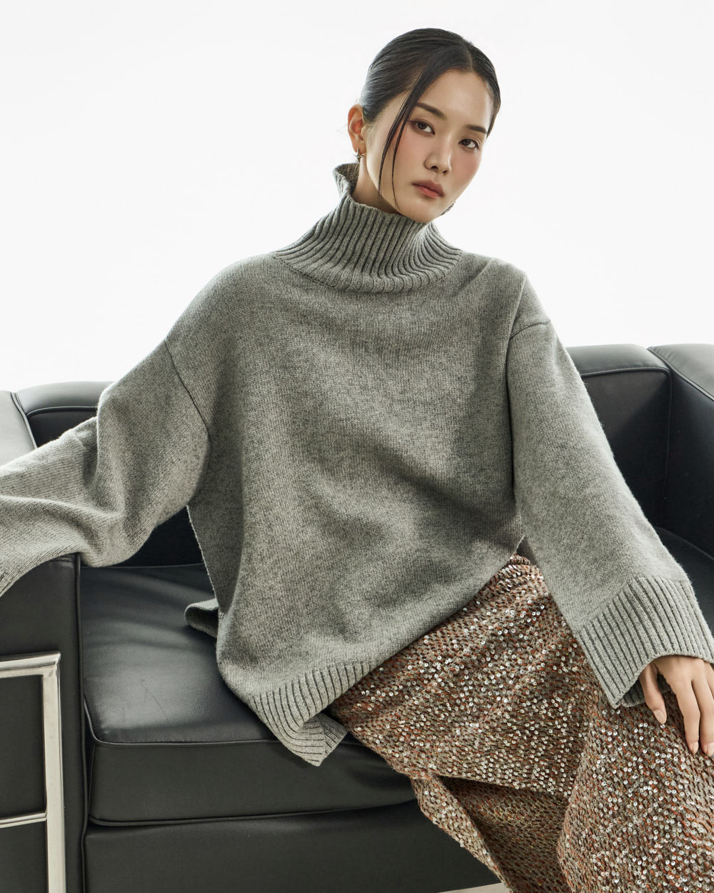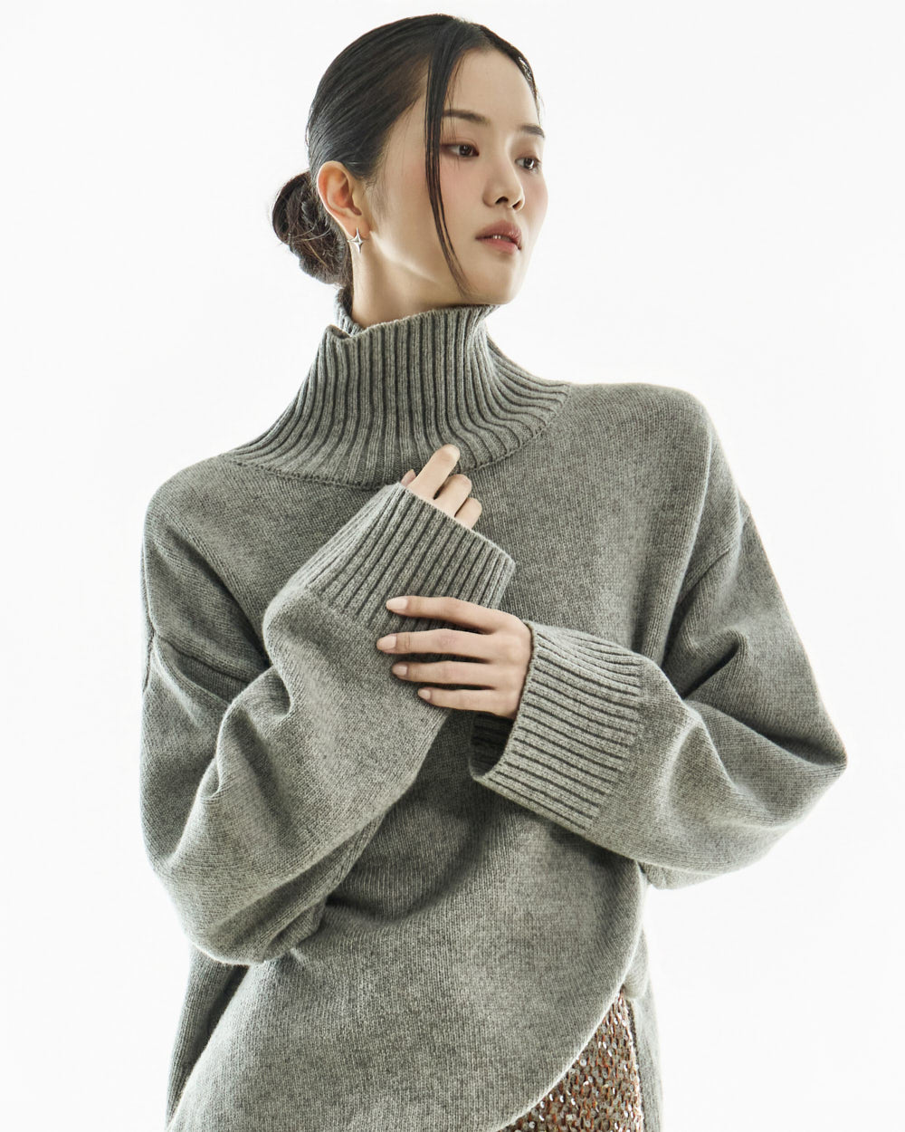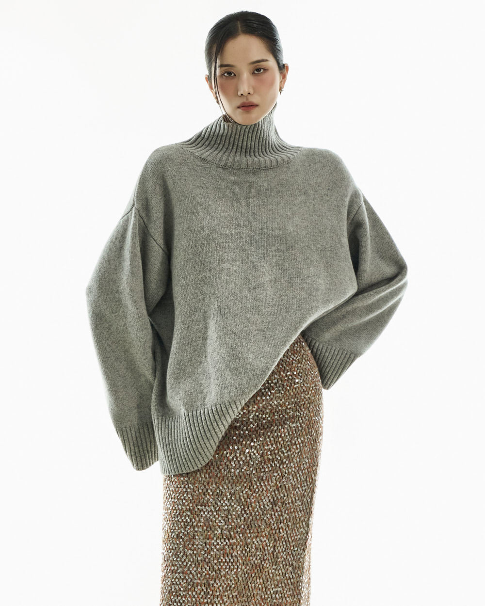 The turtleneck design, oversized fit, and loose silhouette