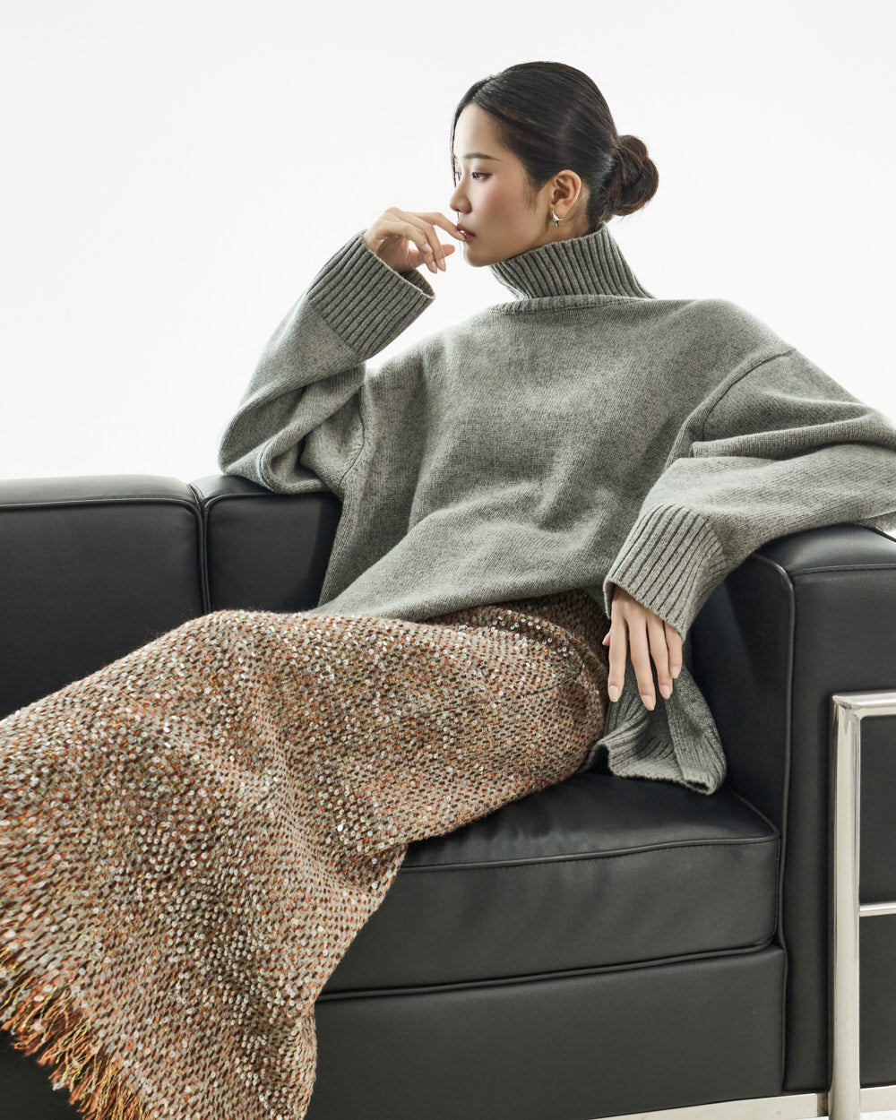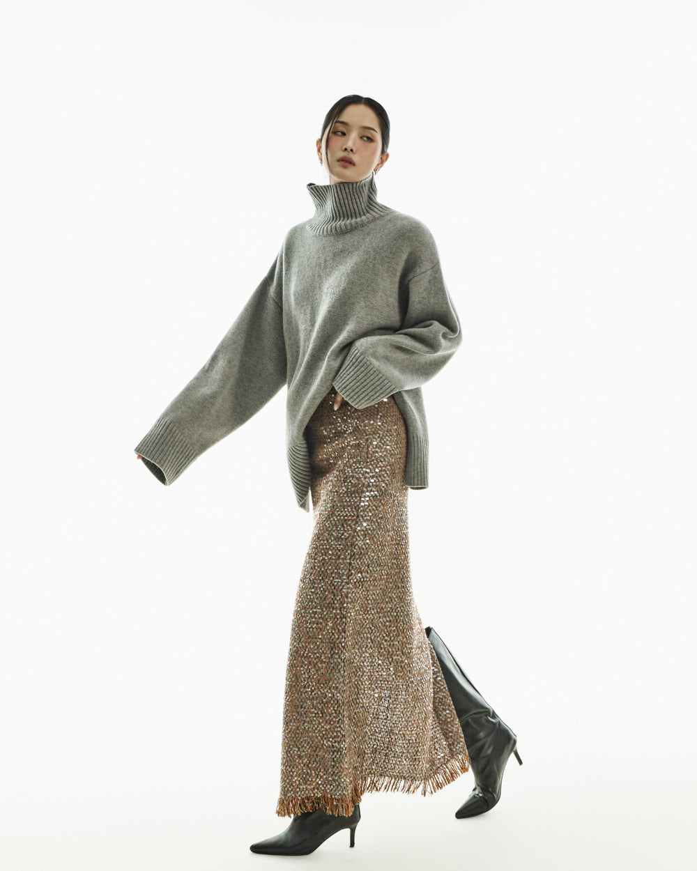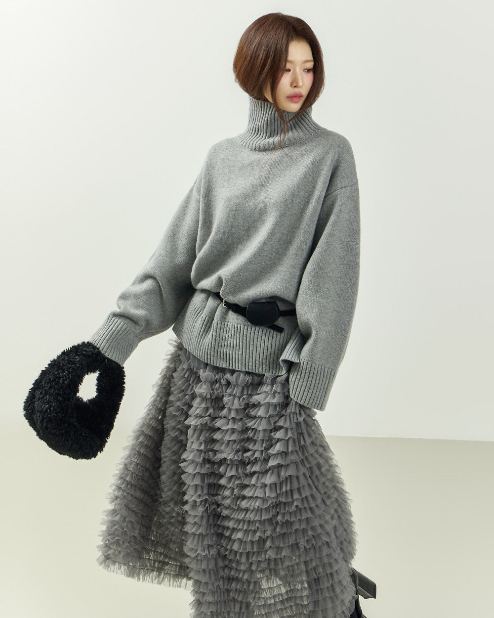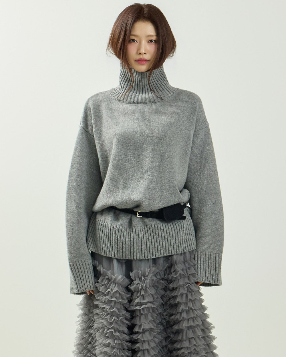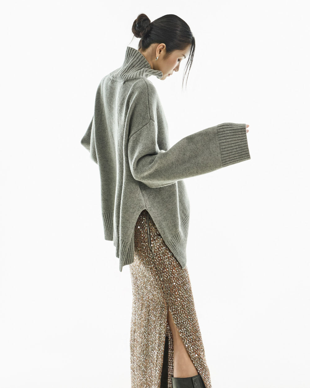 The turtleneck design, oversized fit, and loose silhouette