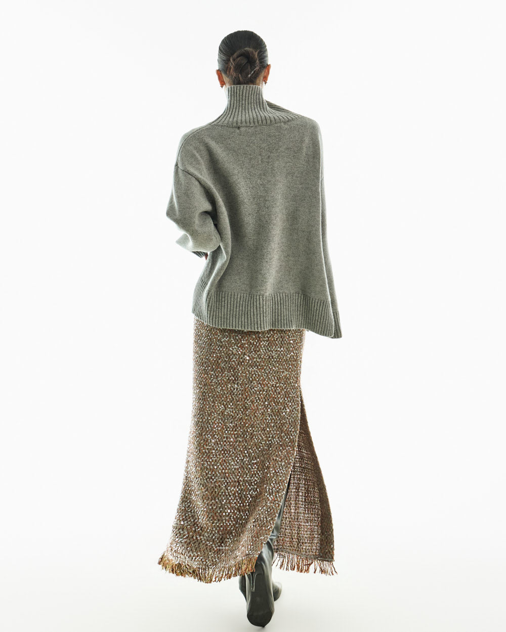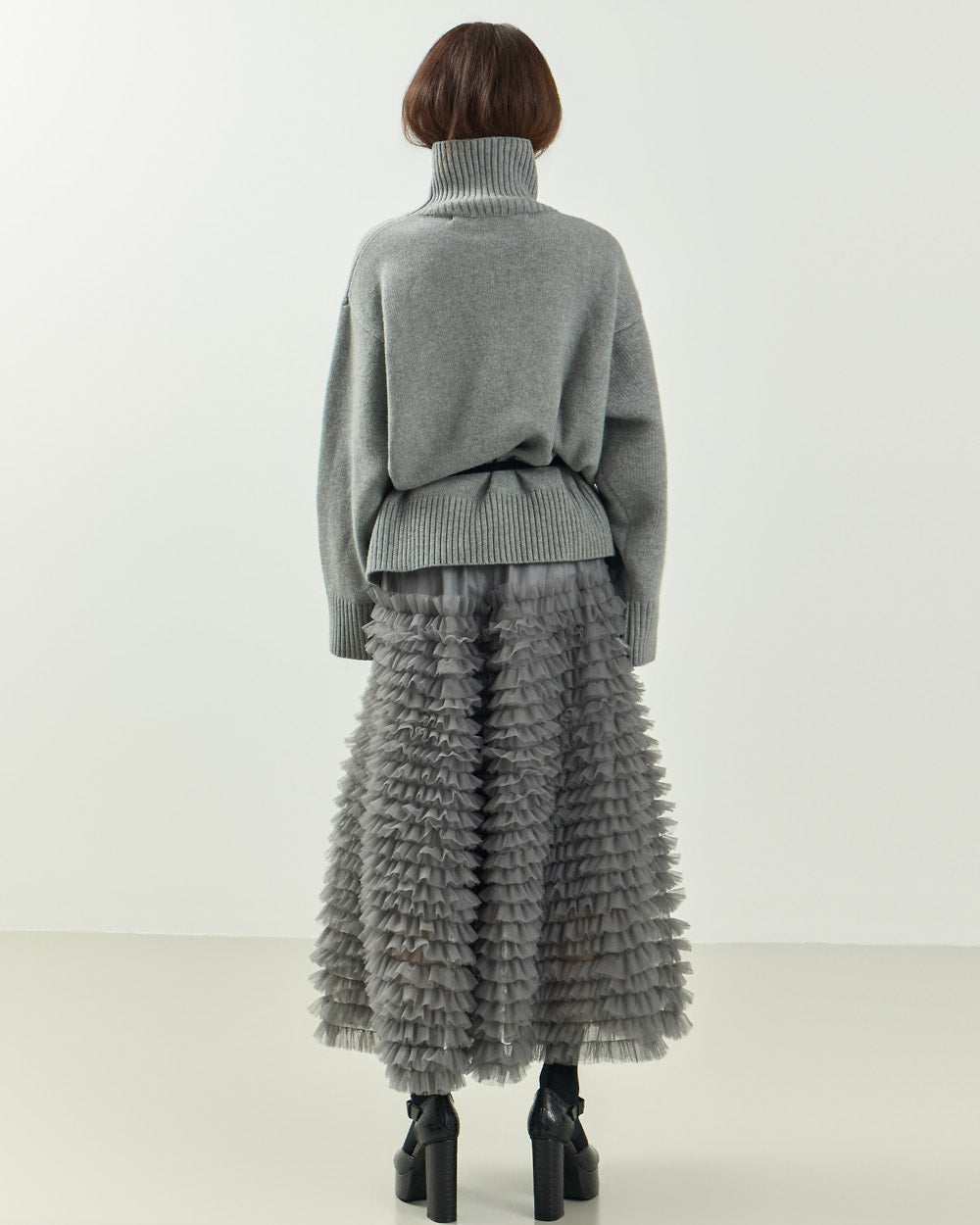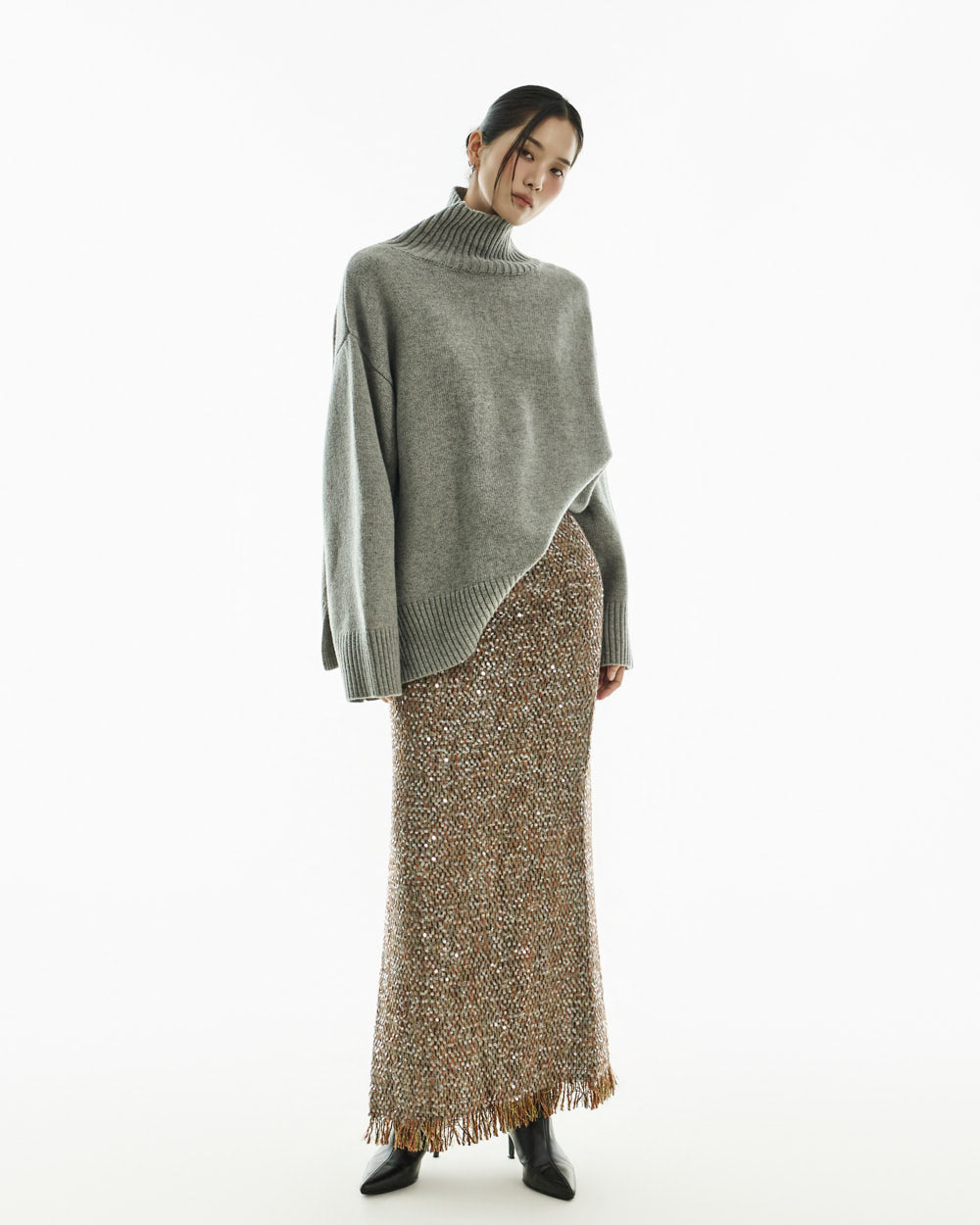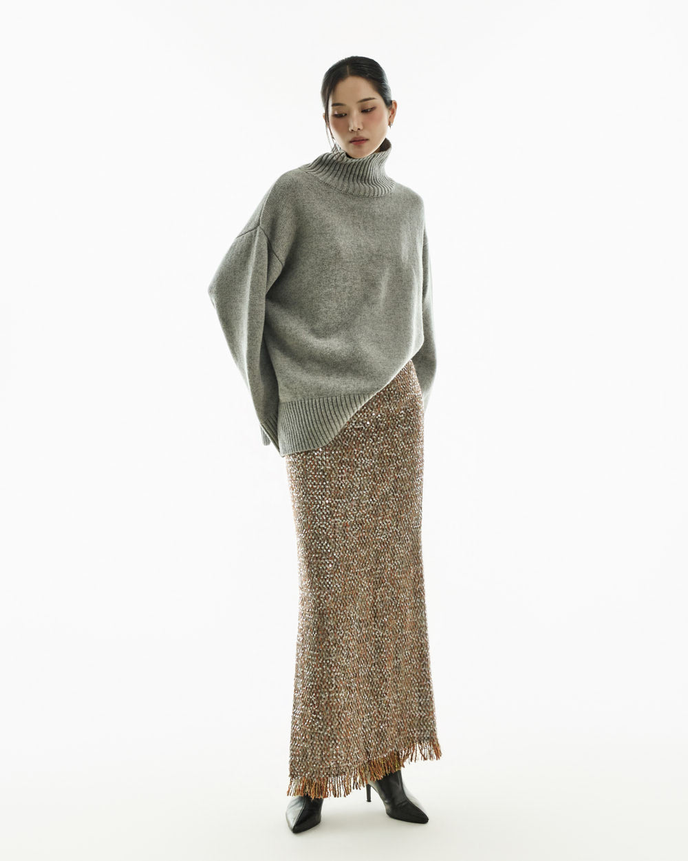 The turtleneck design, oversized fit, and loose silhouette