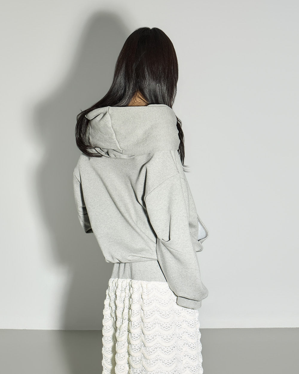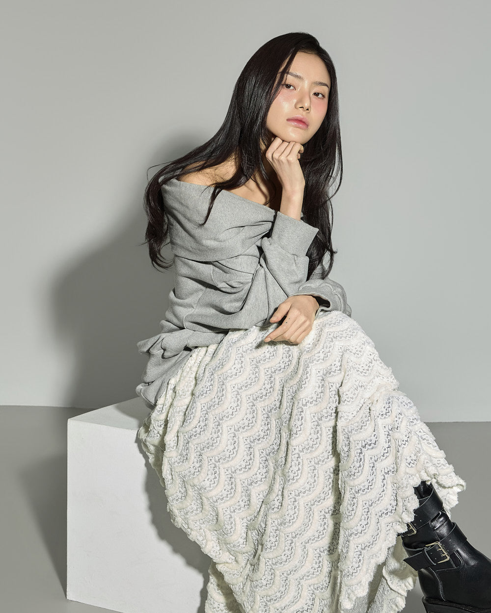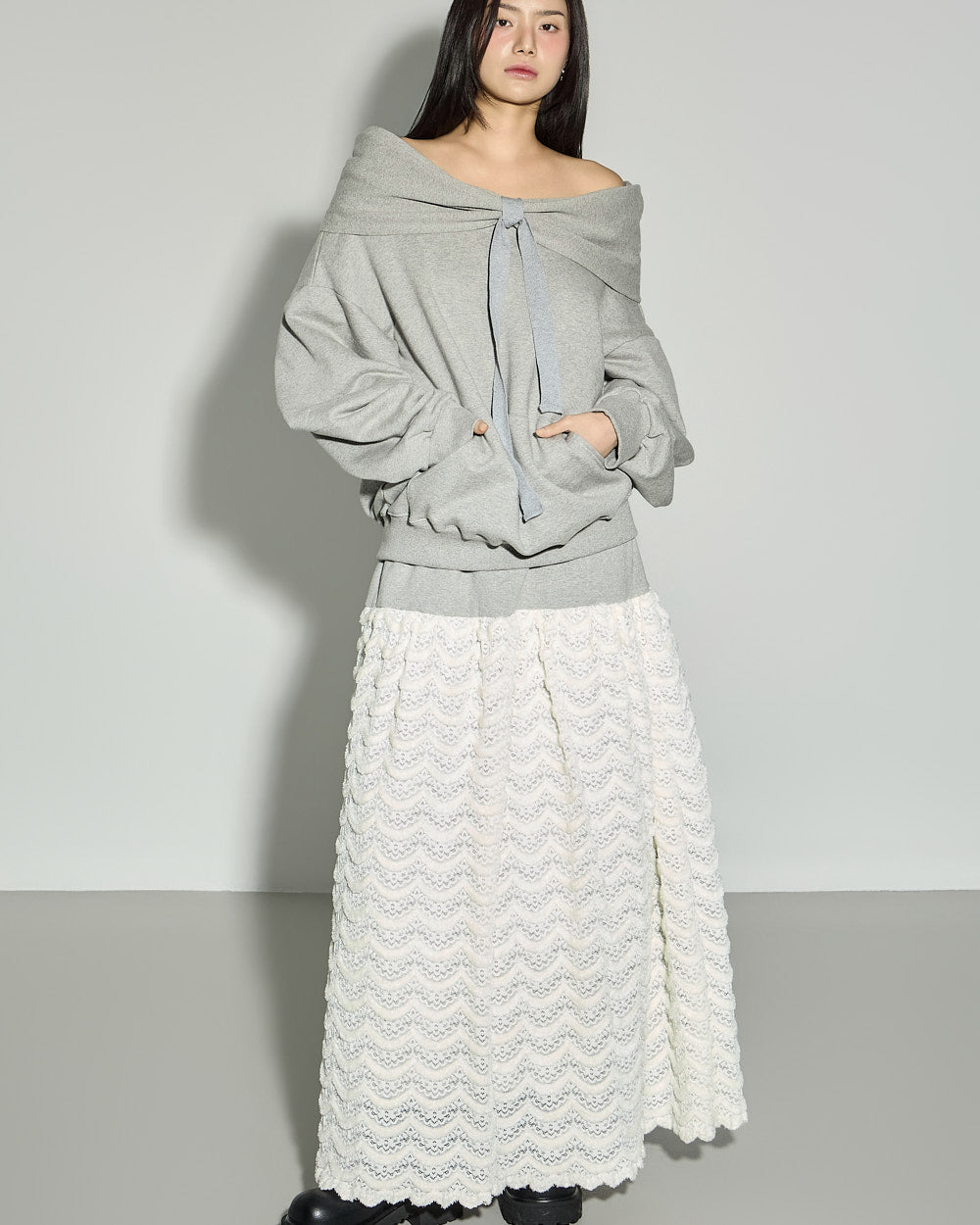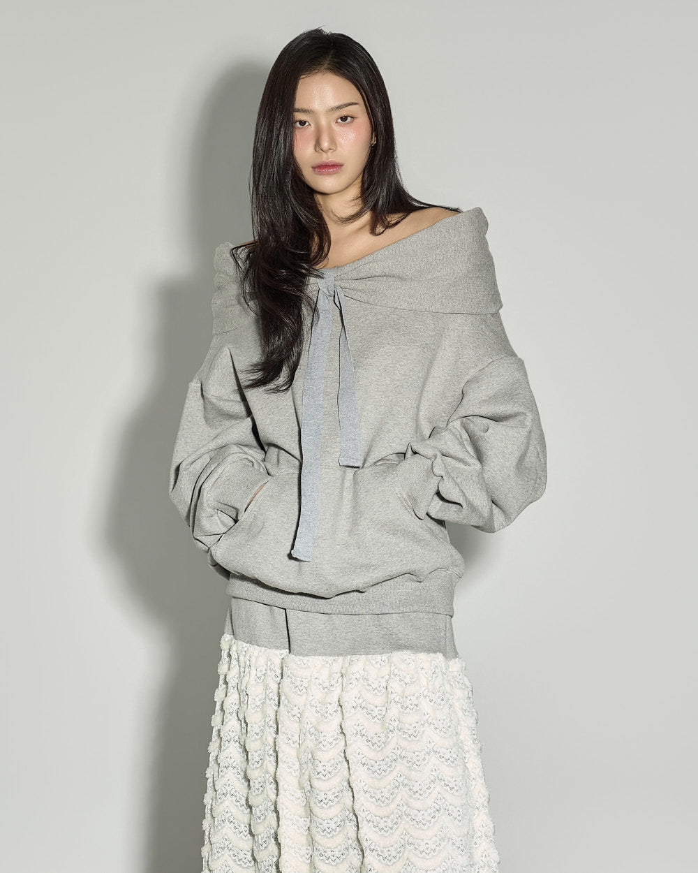 creating a harmonious balance between casual sweatshirt vibes and gentle feminine charm.