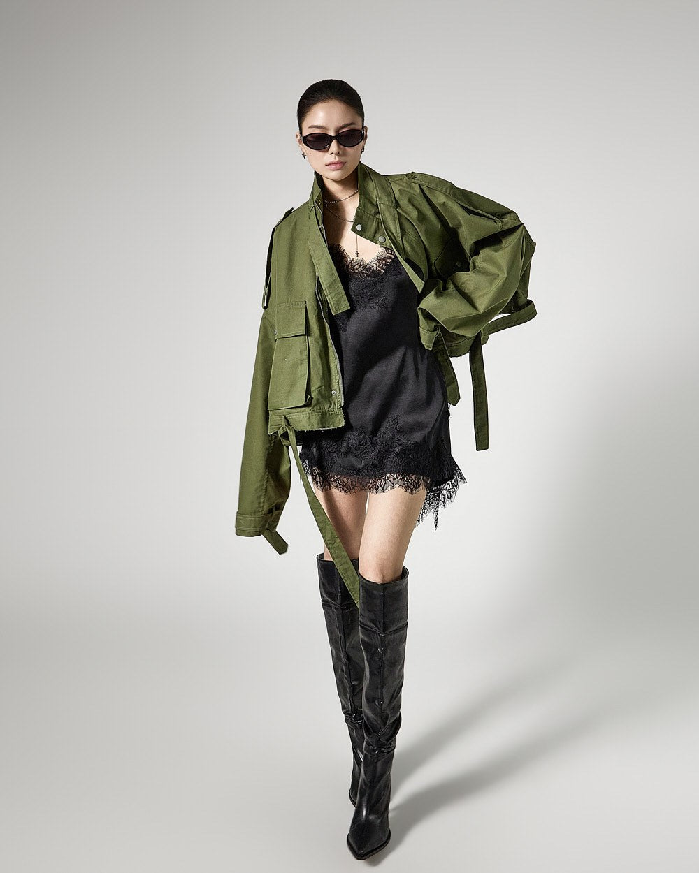 The lace details and asymmetrical hemline serve as key accents,