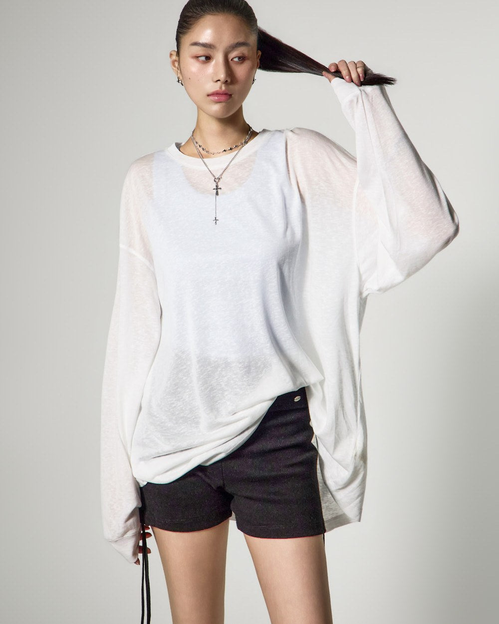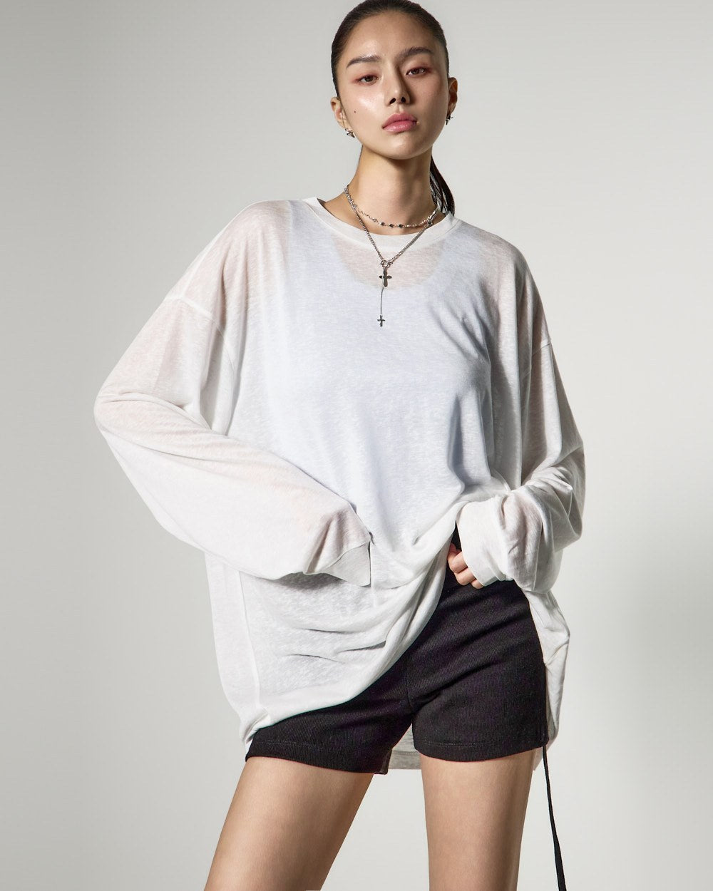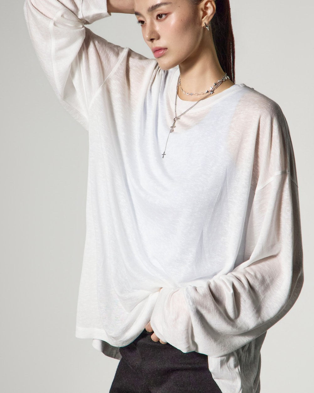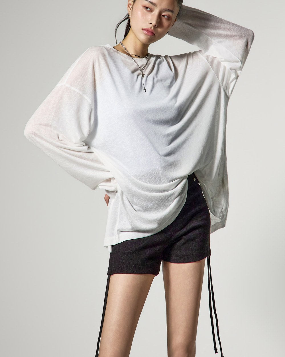 ゆったりとしたフィット感と長めの袖丈が自然な流れるようなシルエットを完成させ、