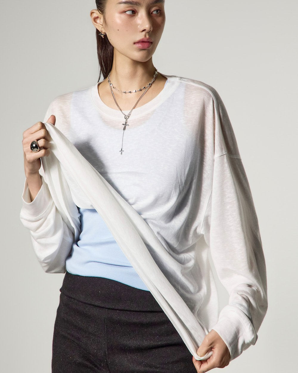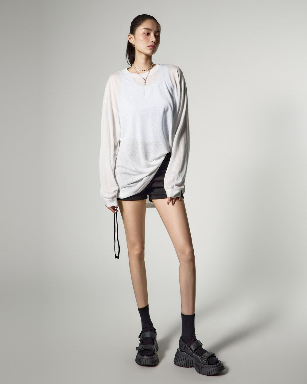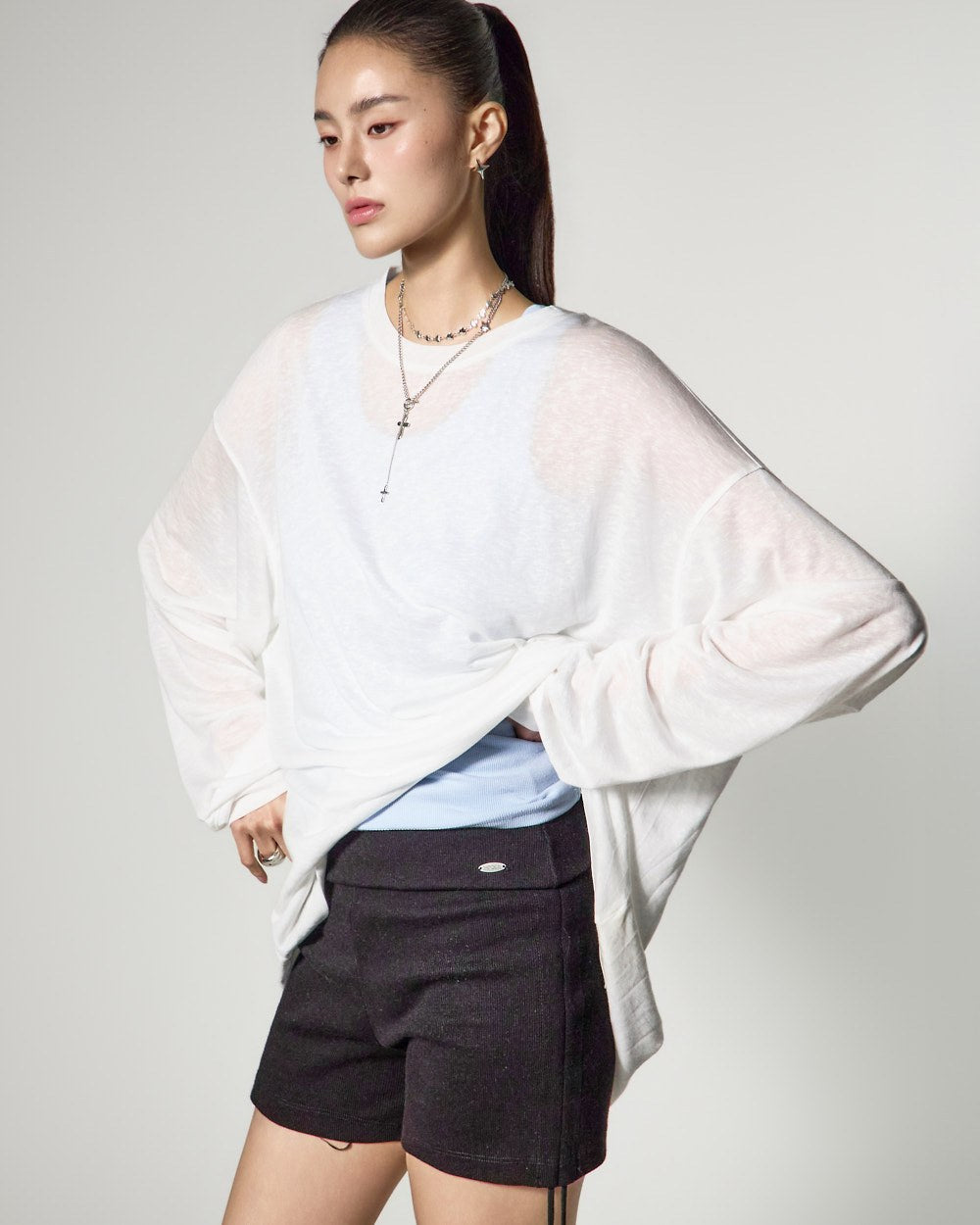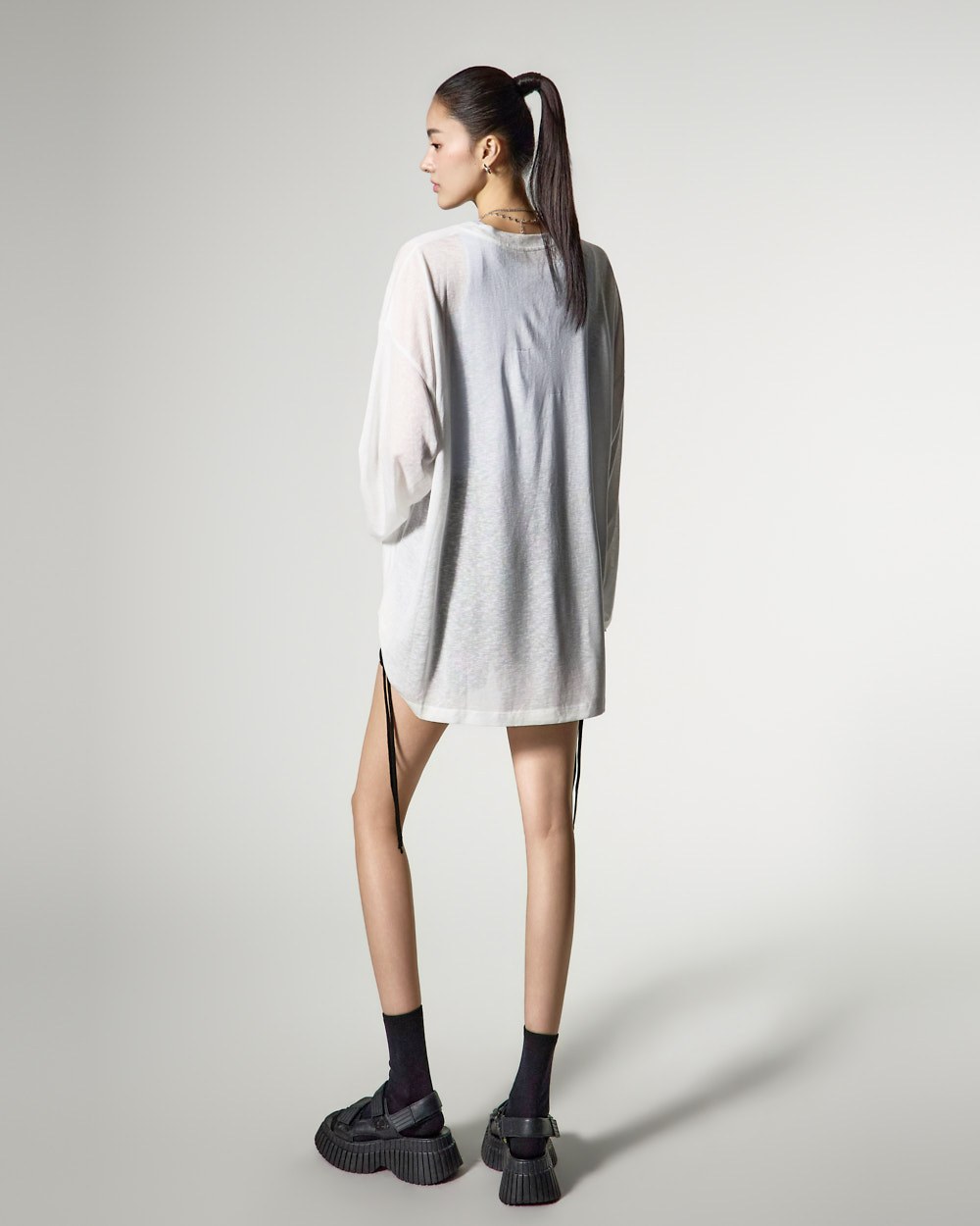 ゆったりとしたフィット感と長めの袖丈が自然な流れるようなシルエットを完成させ、