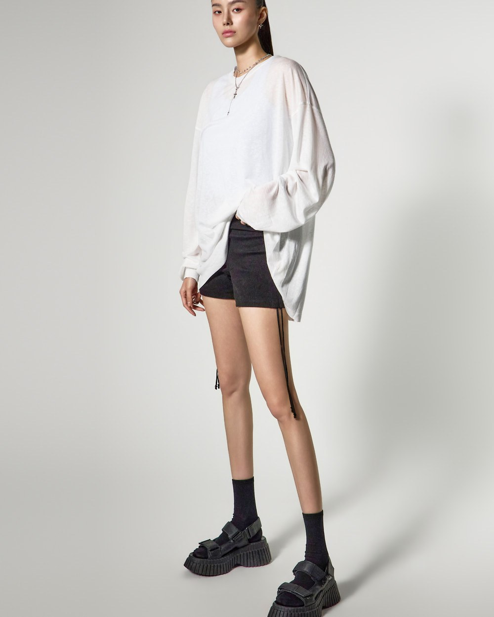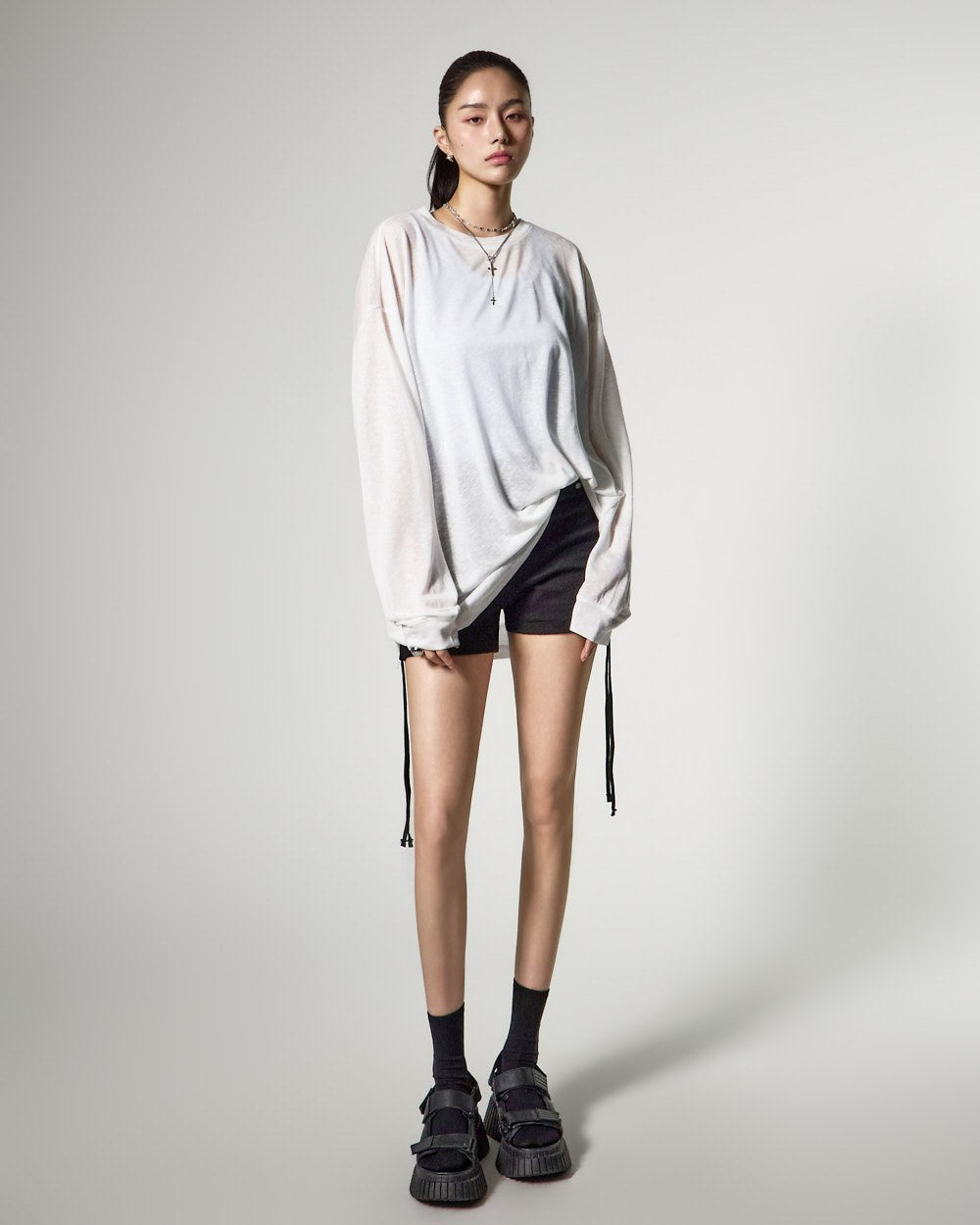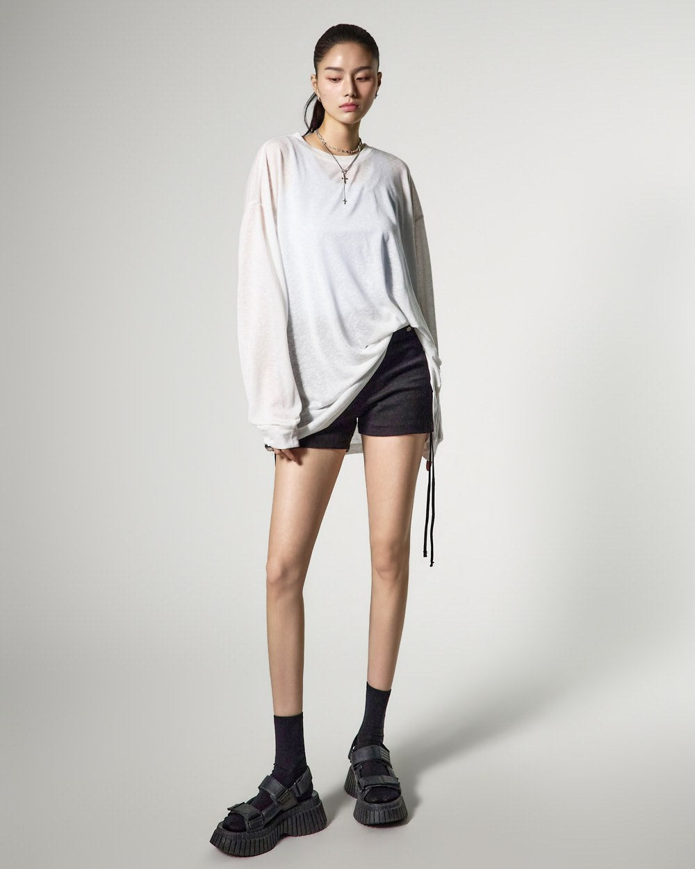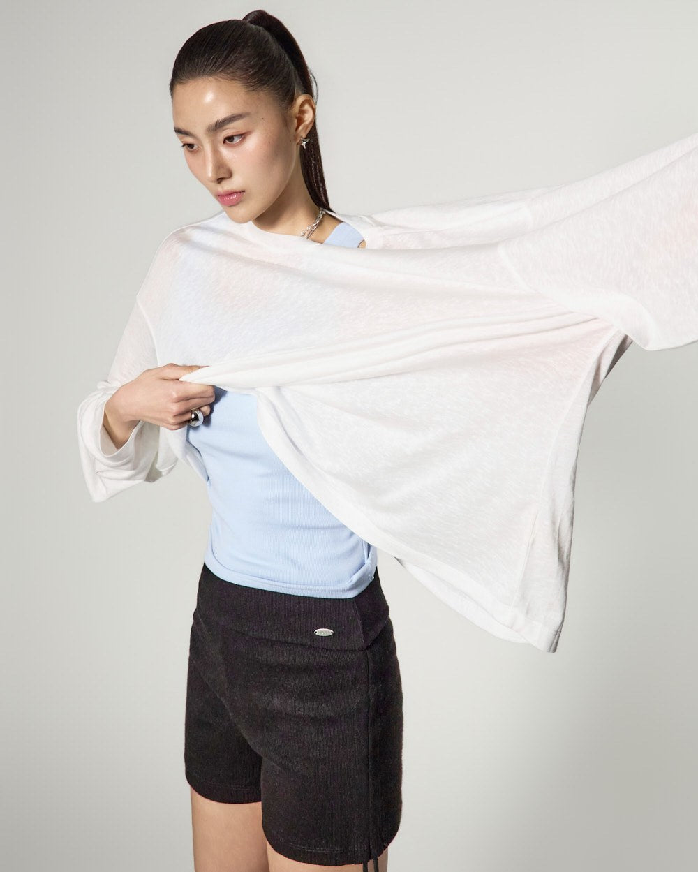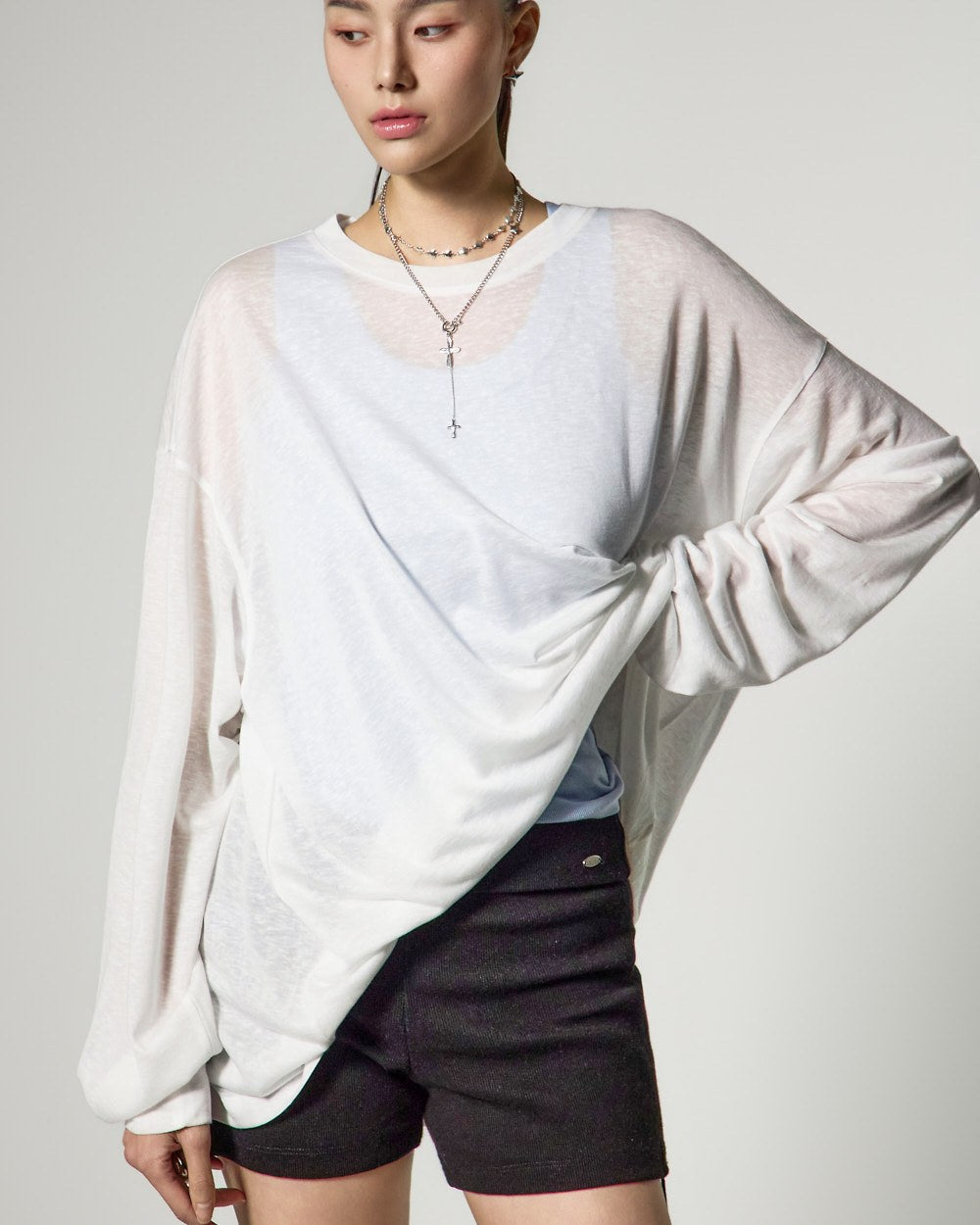 ゆったりとしたフィット感と長めの袖丈が自然な流れるようなシルエットを完成させ、