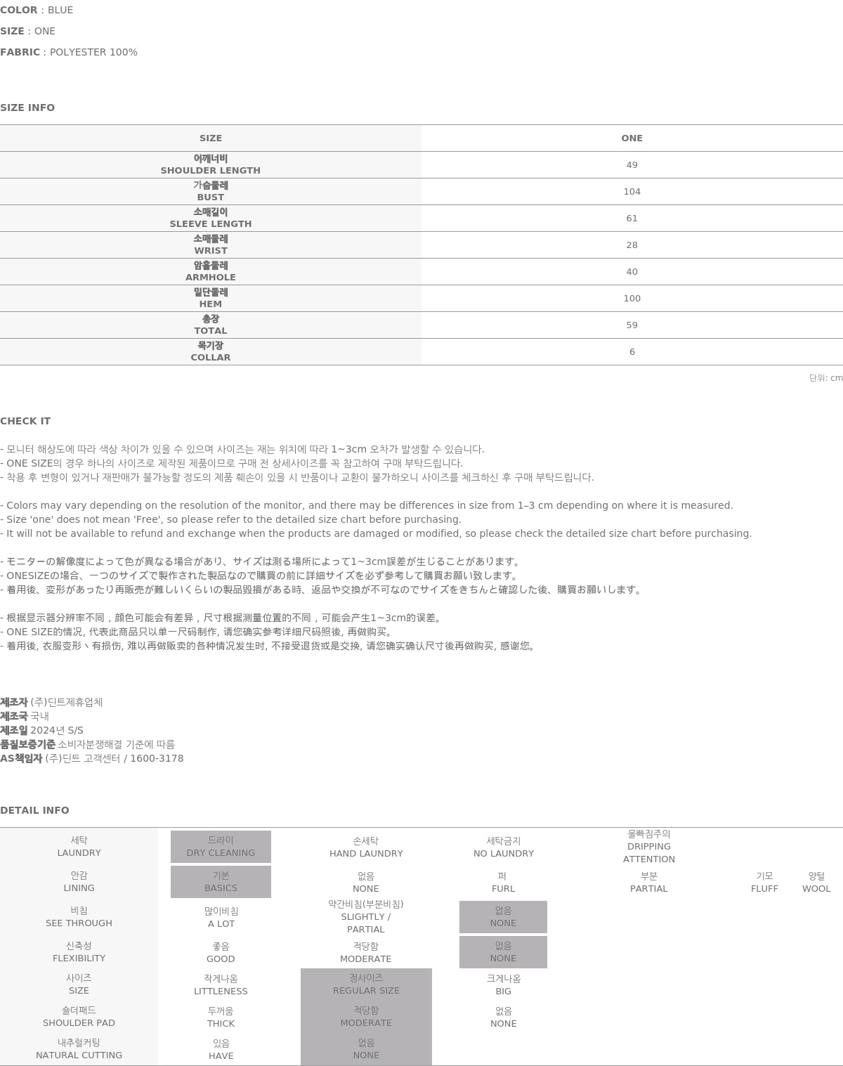 モデルは身長171CMで、ブルーカラーのONEサイズを着用しています。