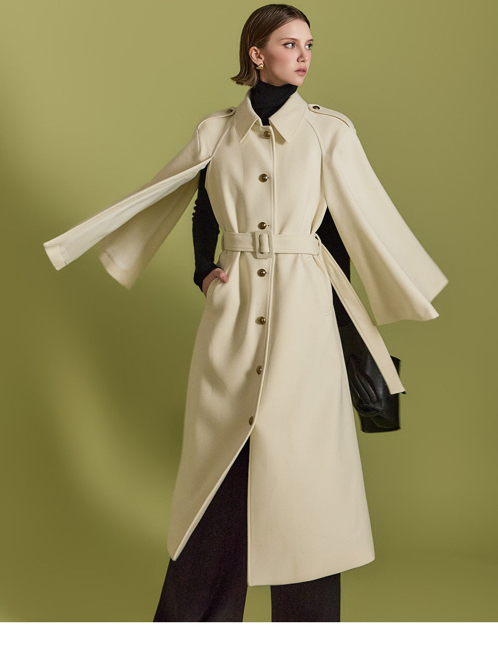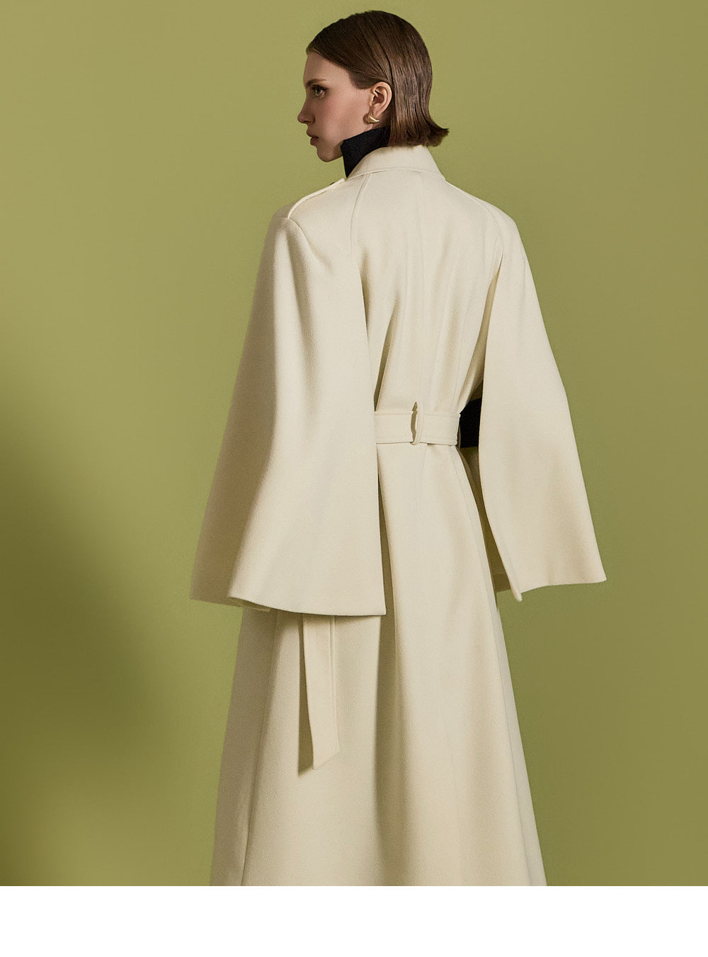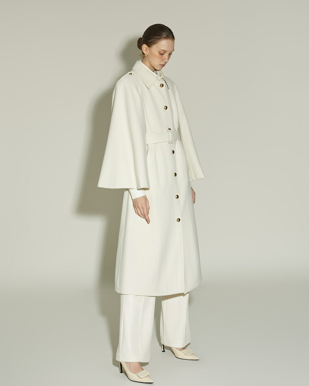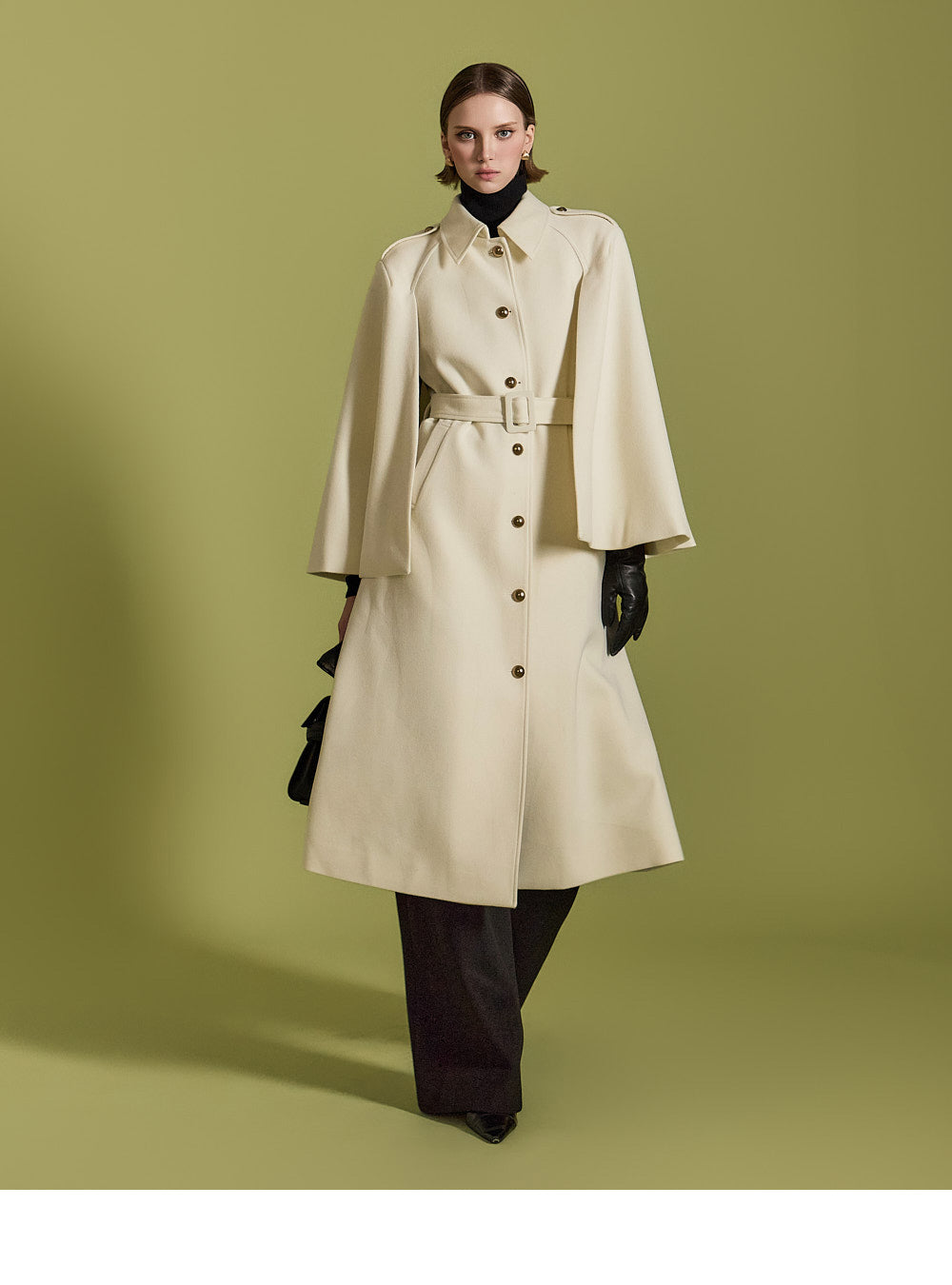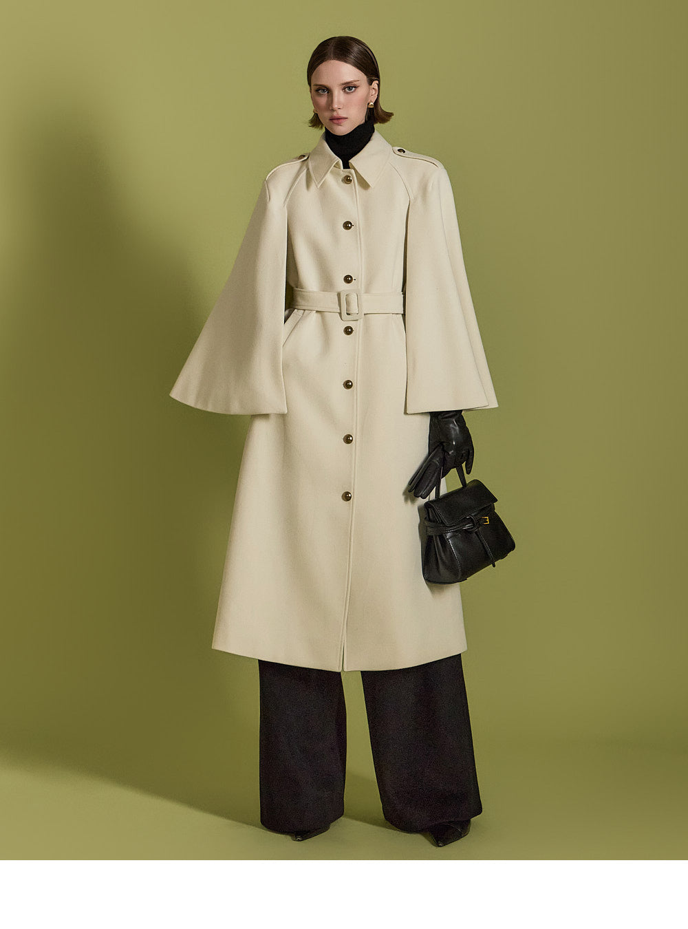 同じ生地のベルトがウエストを締めて、構造的な印象をプラスします。