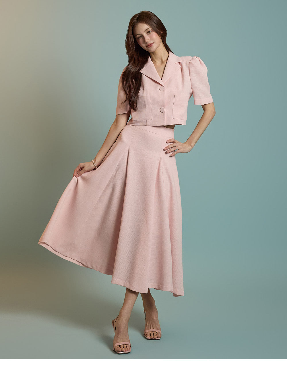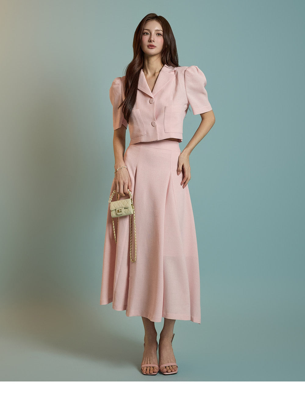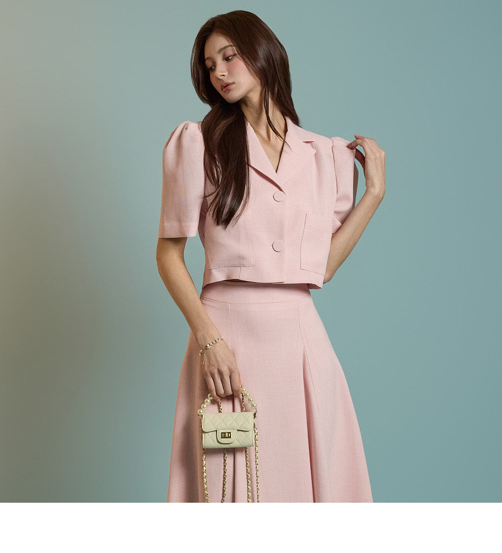 肩のパフディテールがボリュームをプラスし、女性らしいシルエットを強調します。