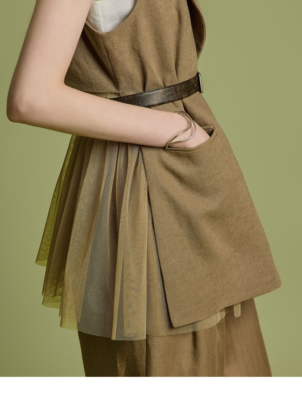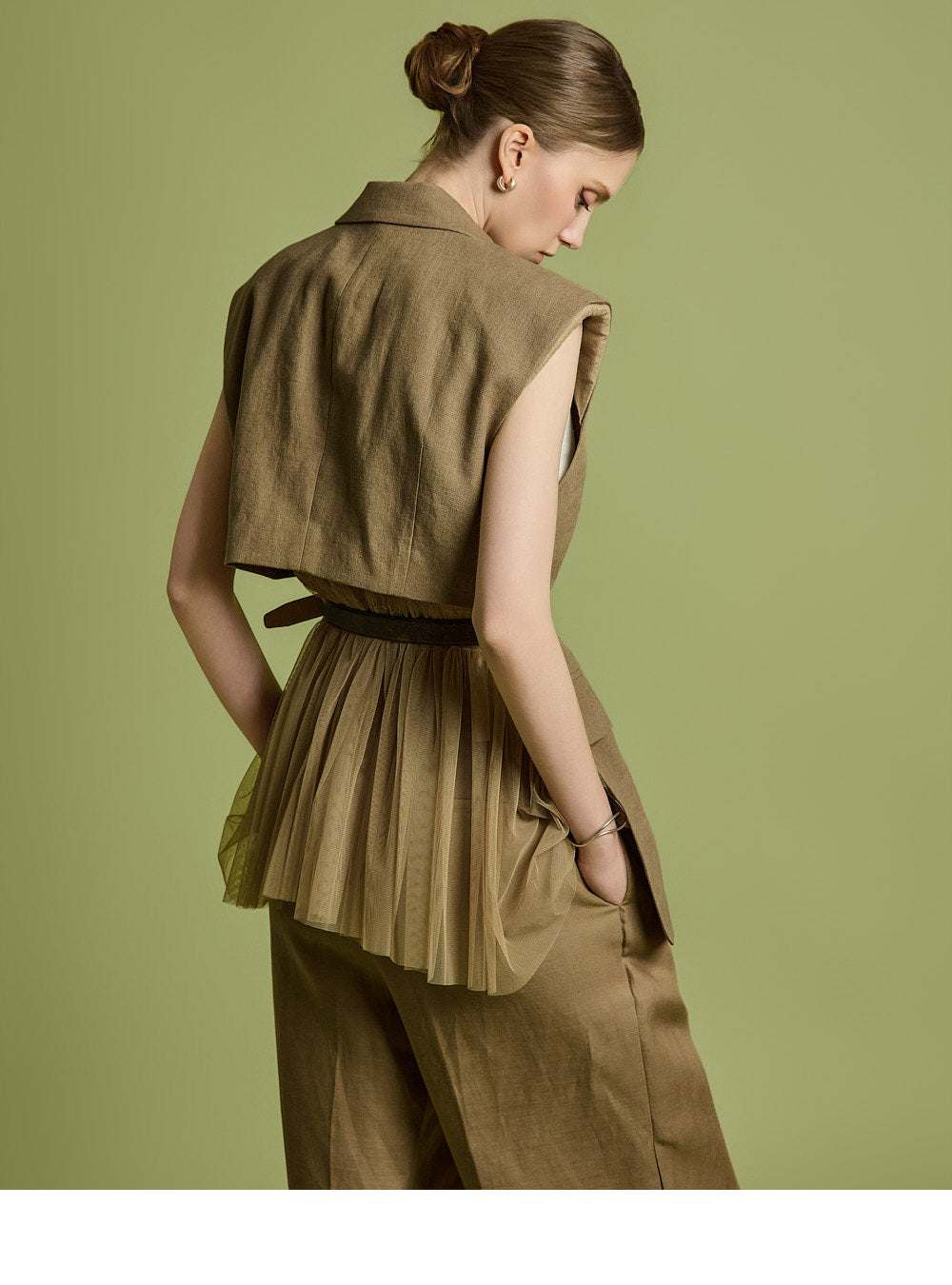 後ろの透け感のあるフリルのディテールが、ユニークでフェミニンな雰囲気を醸し出します。