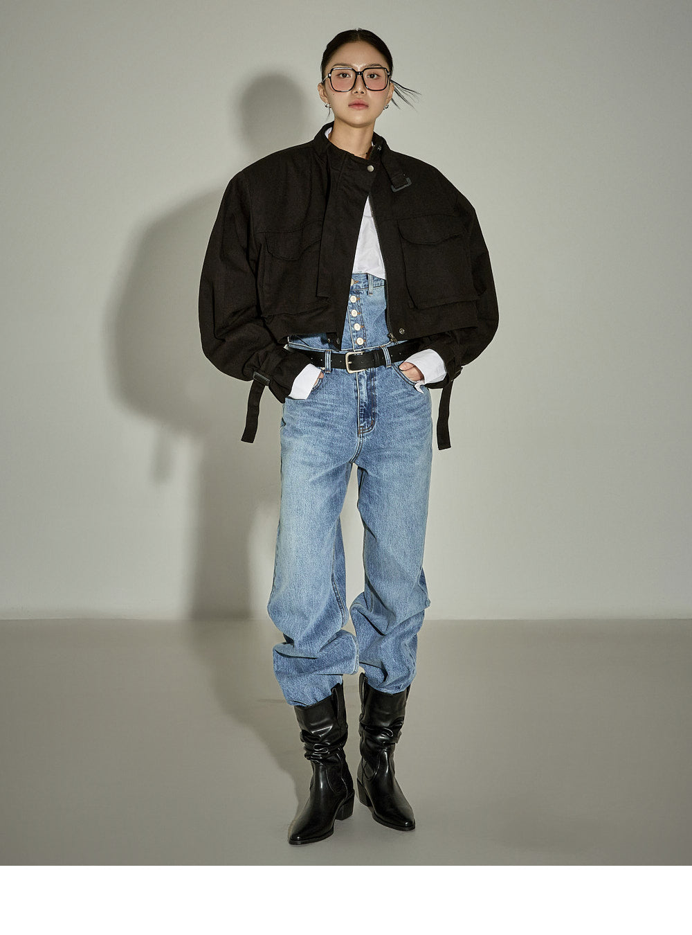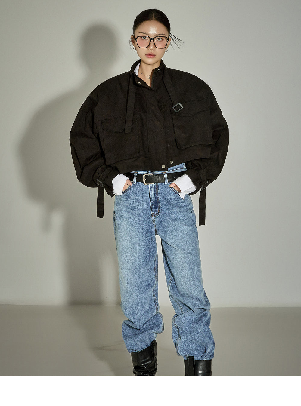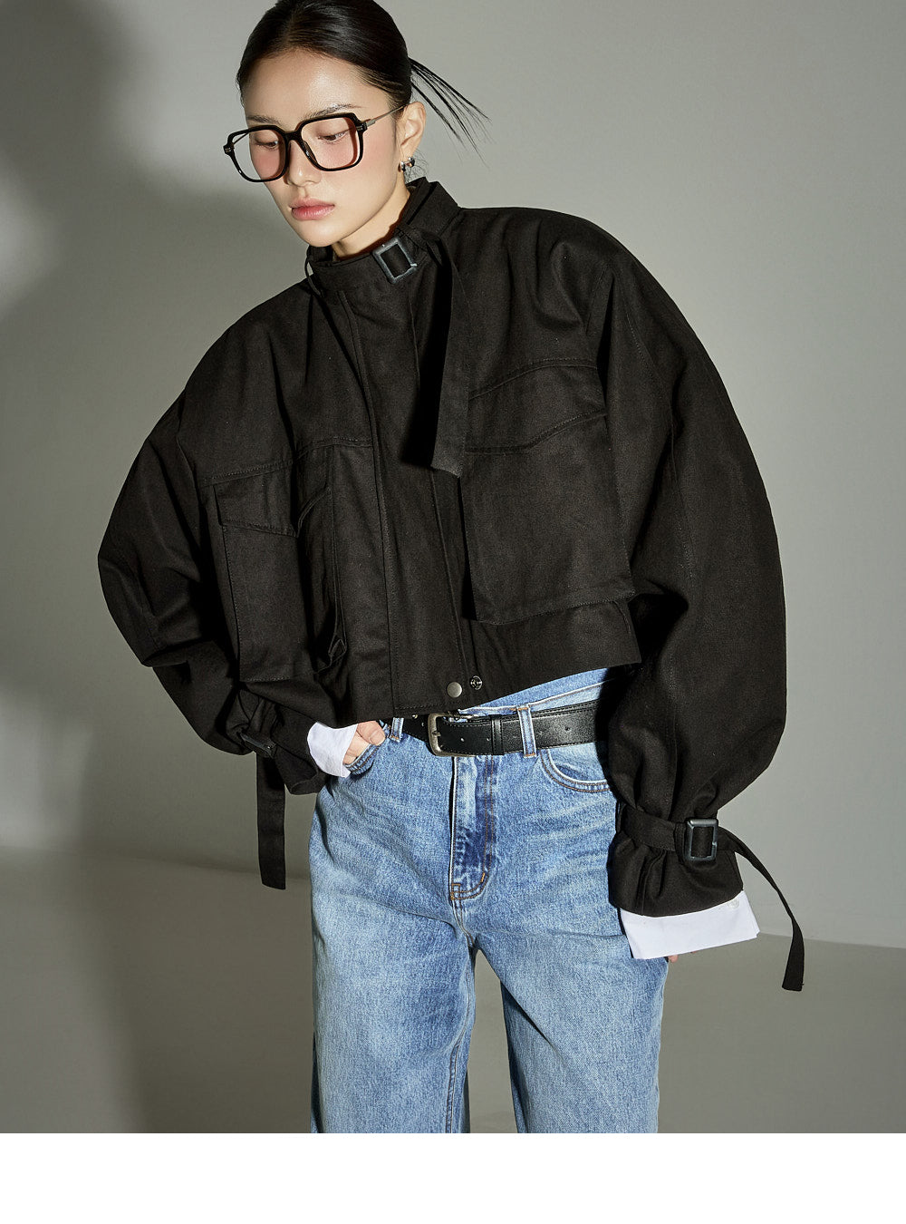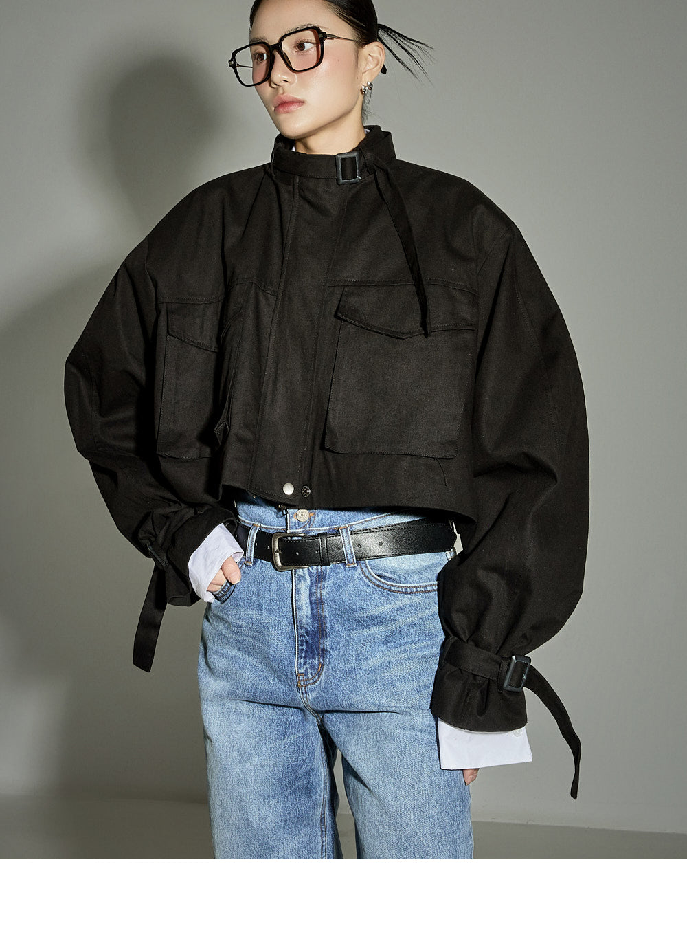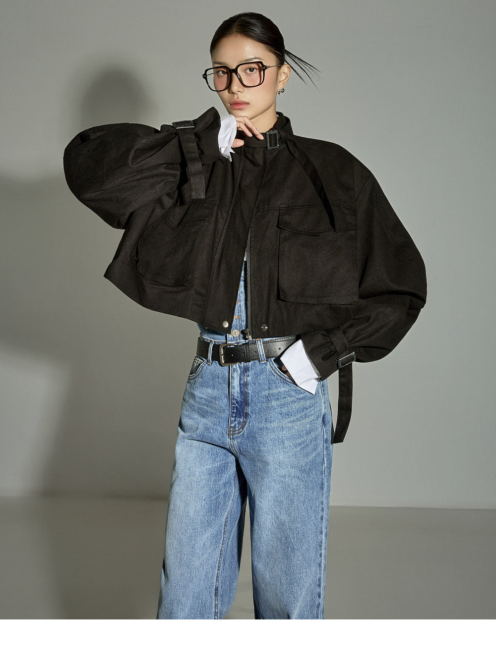 The loose-fitting silhouette and cropped length create a trendy look.