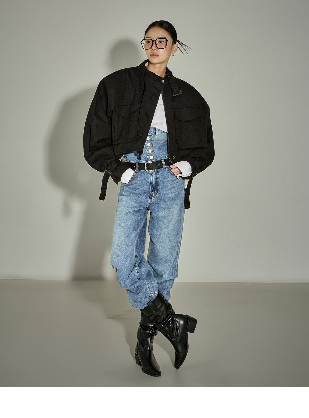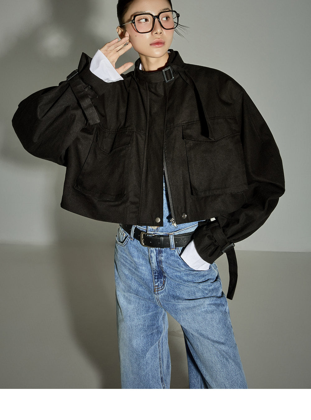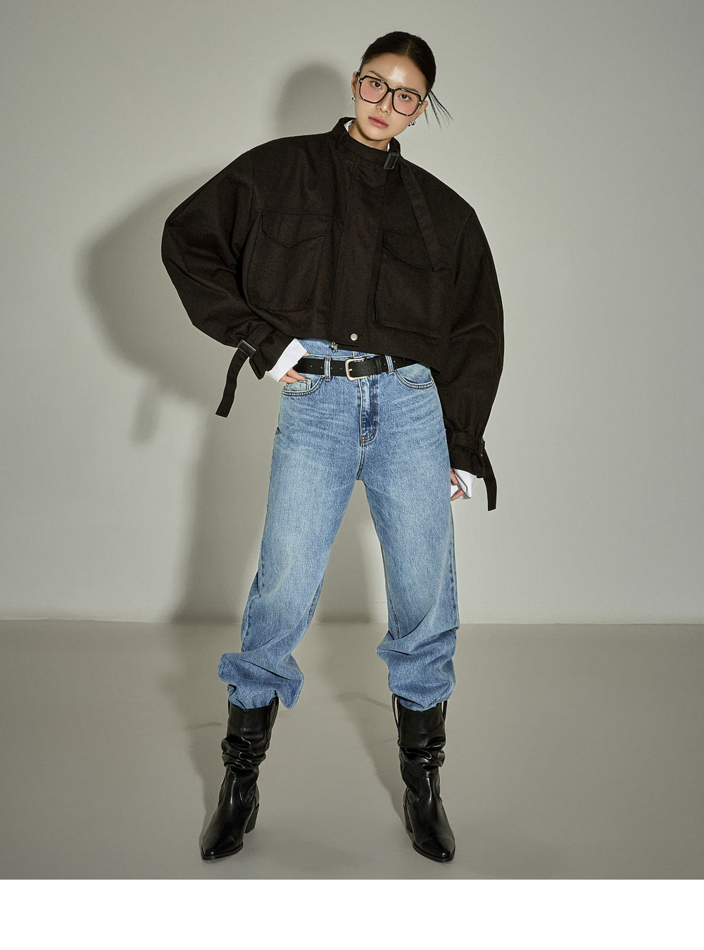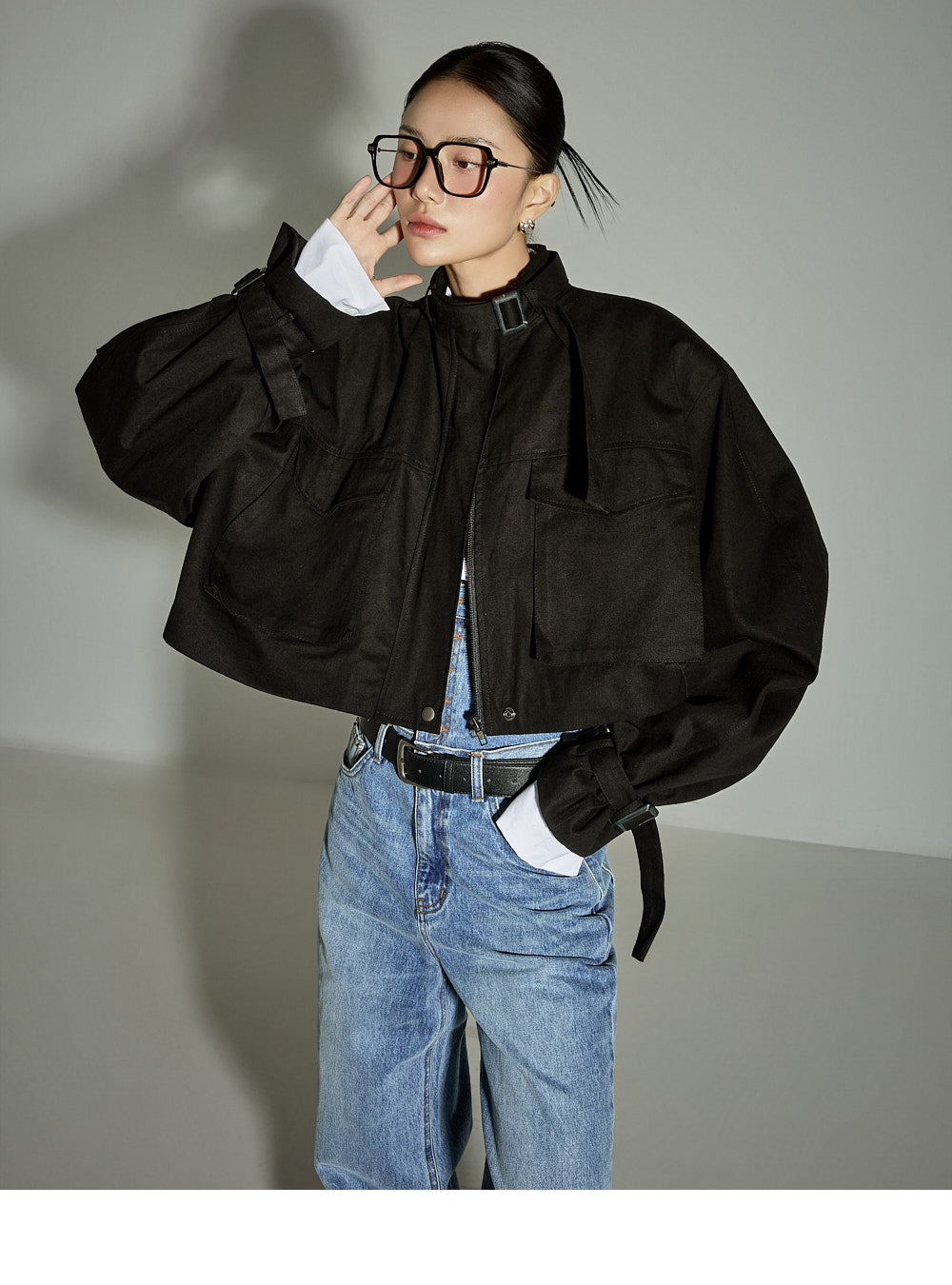 The loose-fitting silhouette and cropped length create a trendy look.