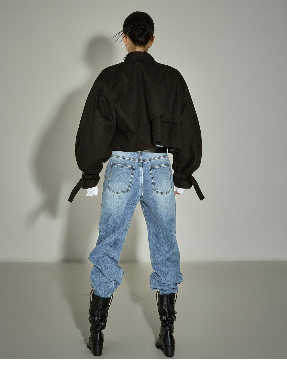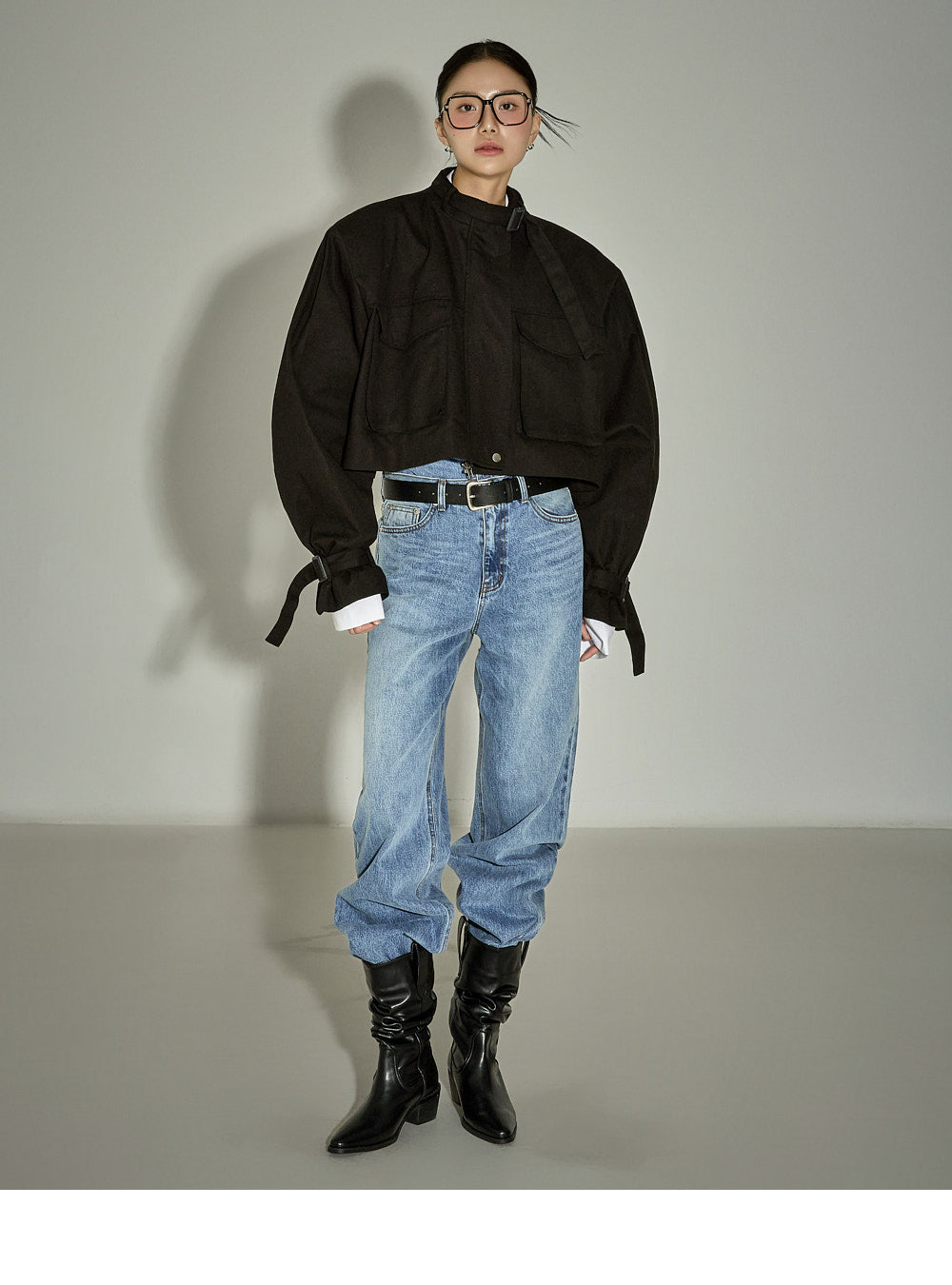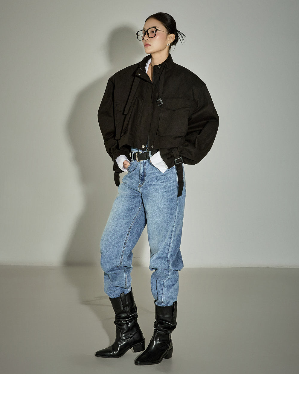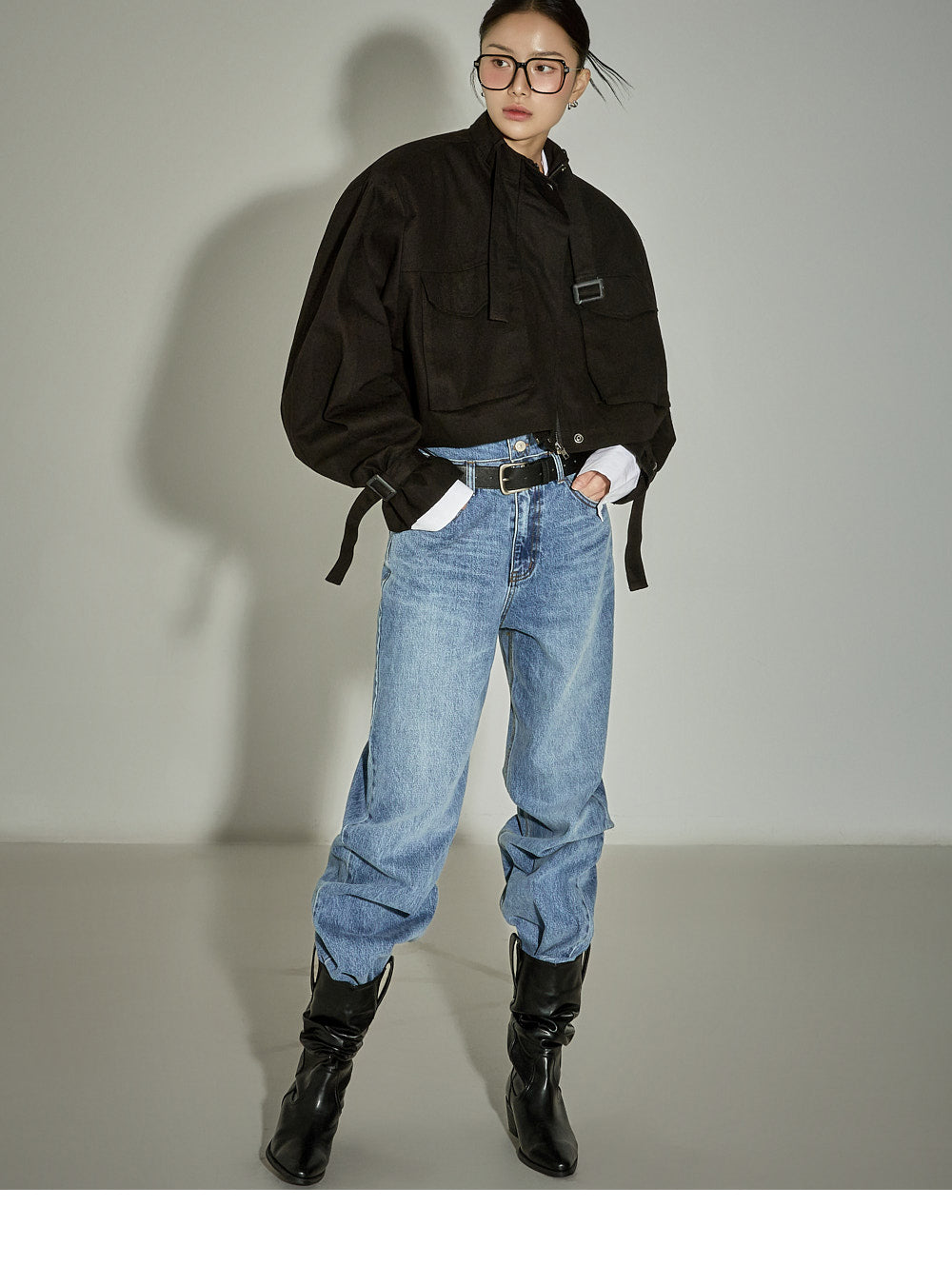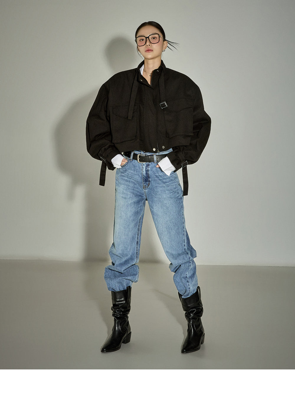 The loose-fitting silhouette and cropped length create a trendy look.