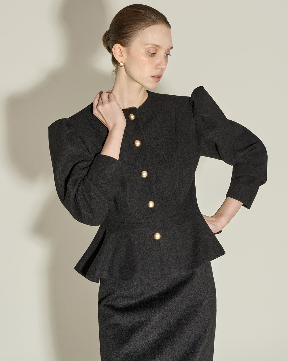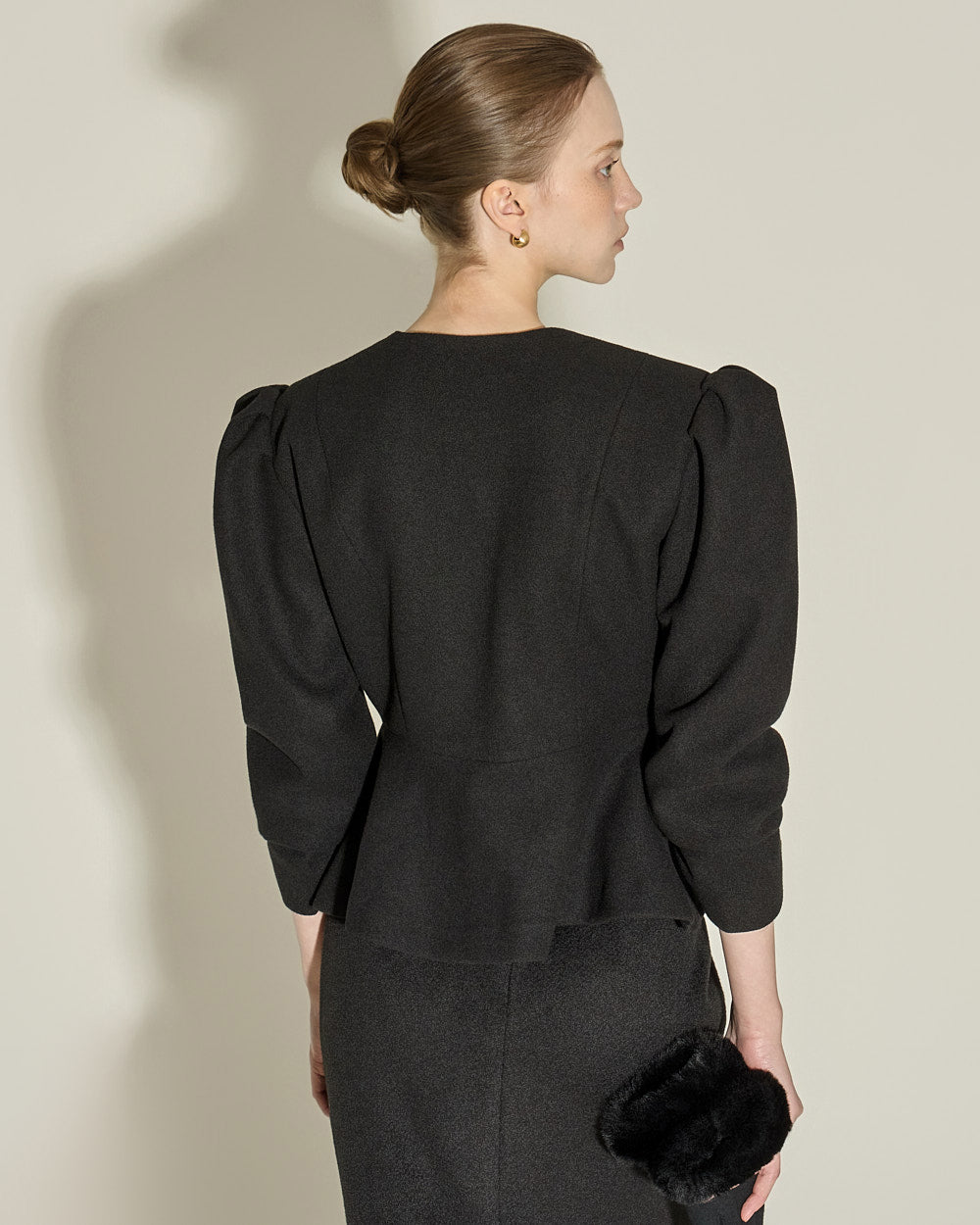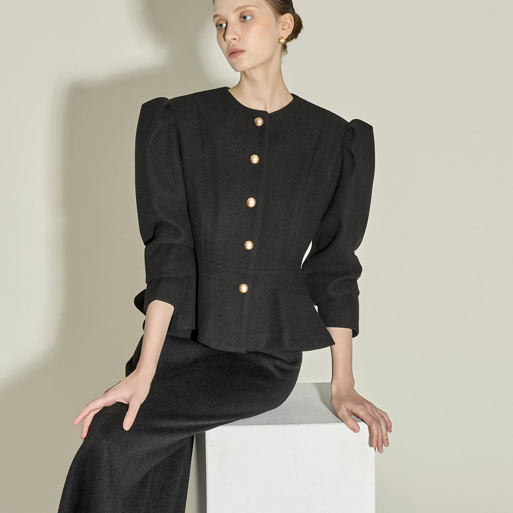 This puff peplum jacket exudes a feminine vibe.