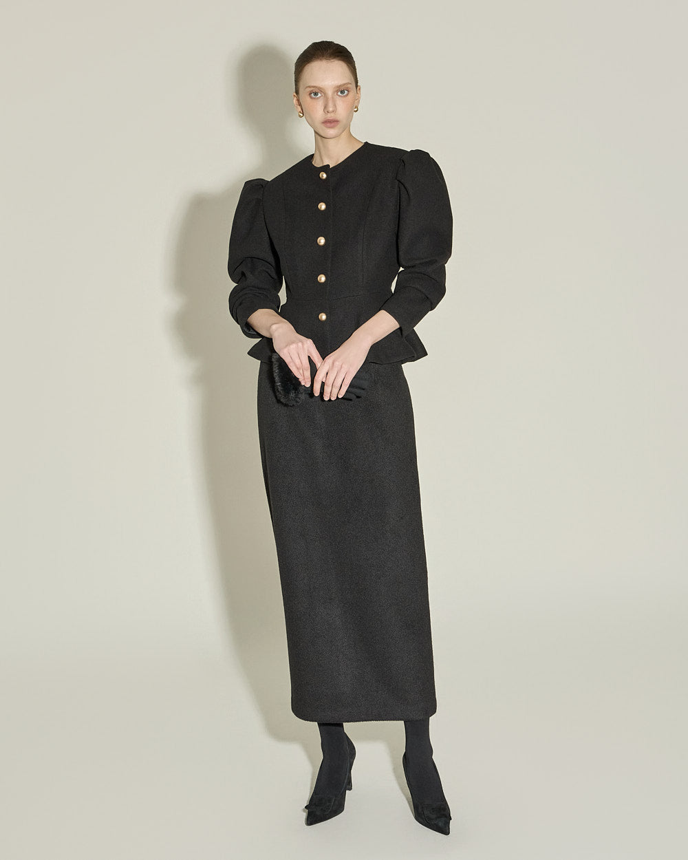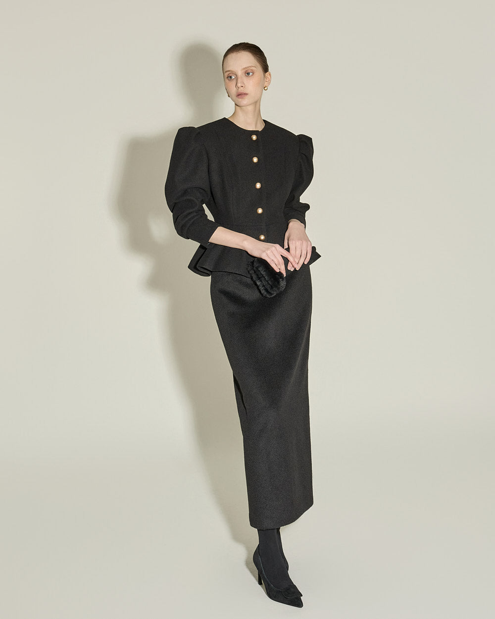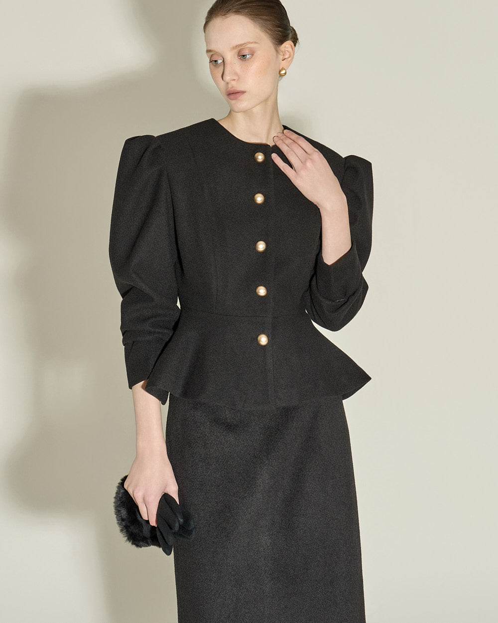 This puff peplum jacket exudes a feminine vibe.