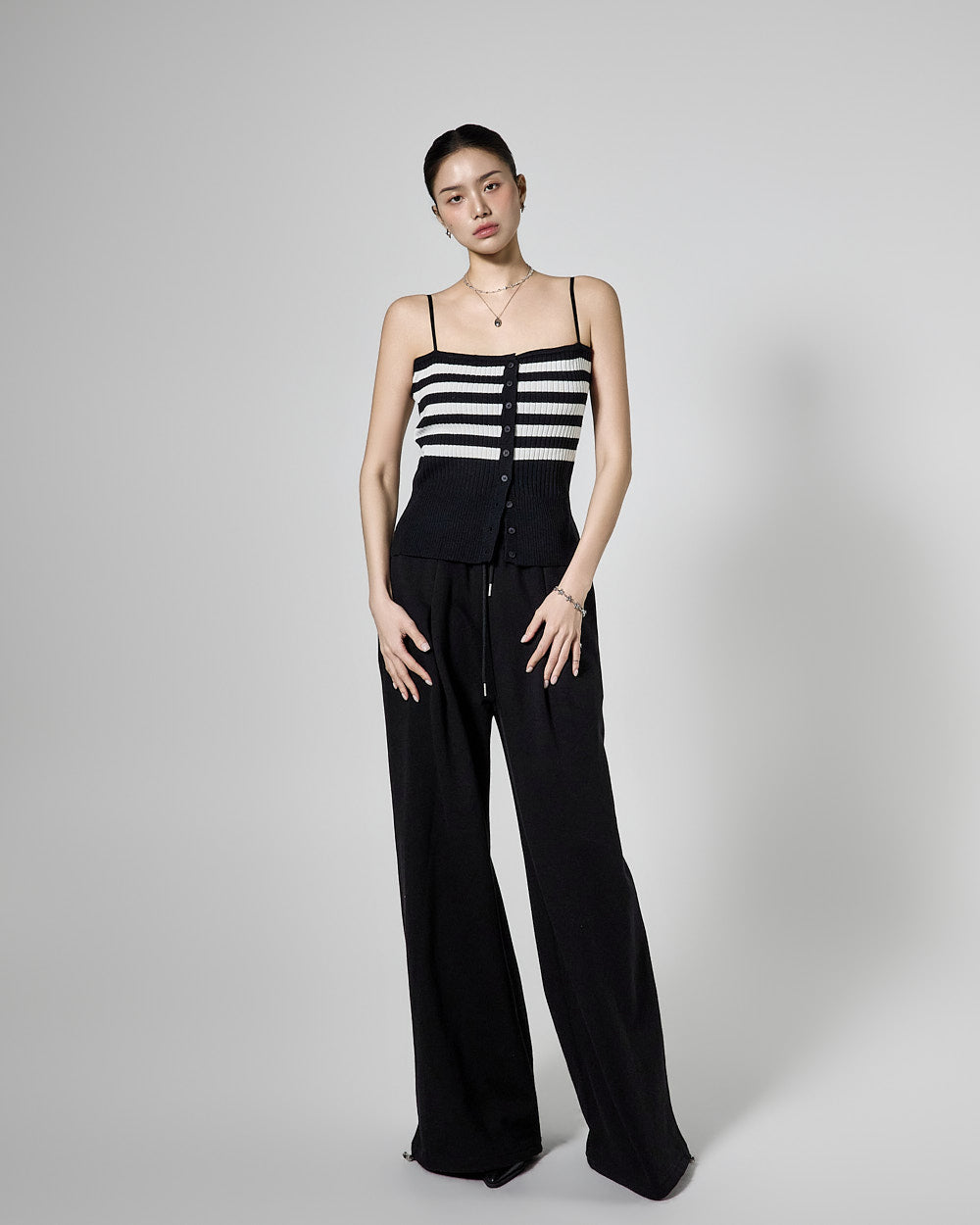 The sleeveless top has adjustable shoulder straps,