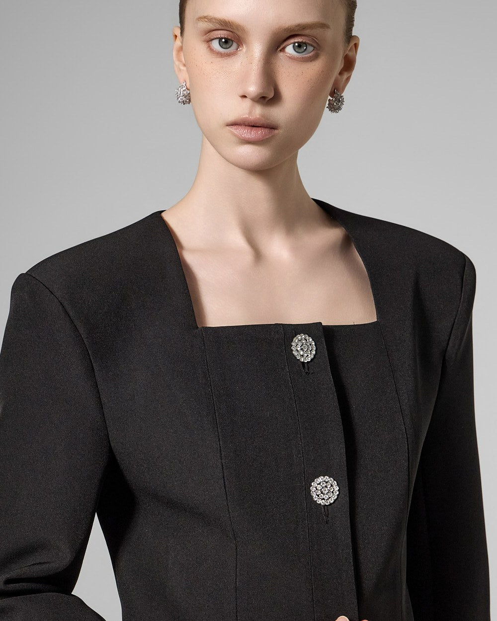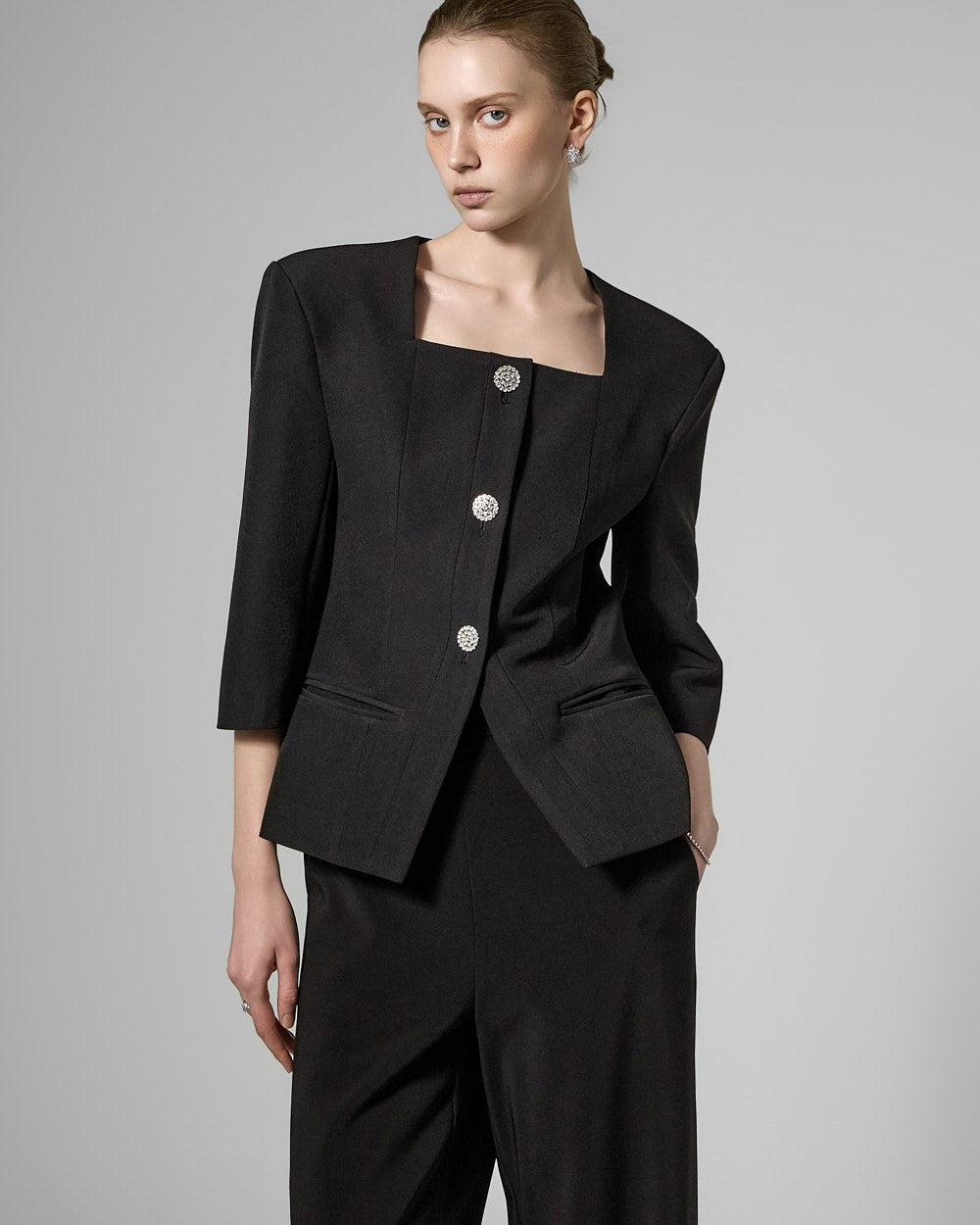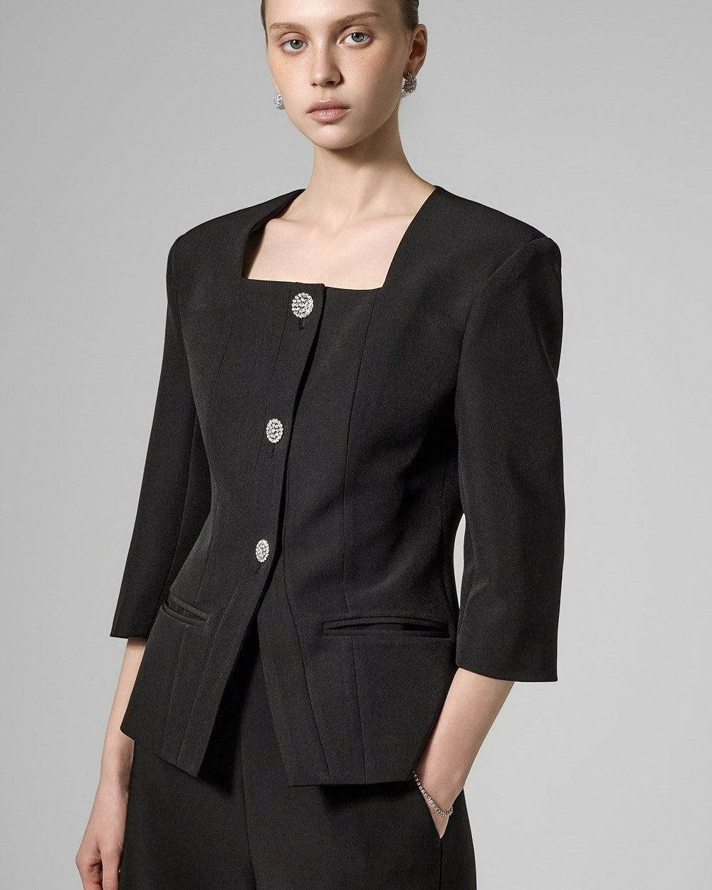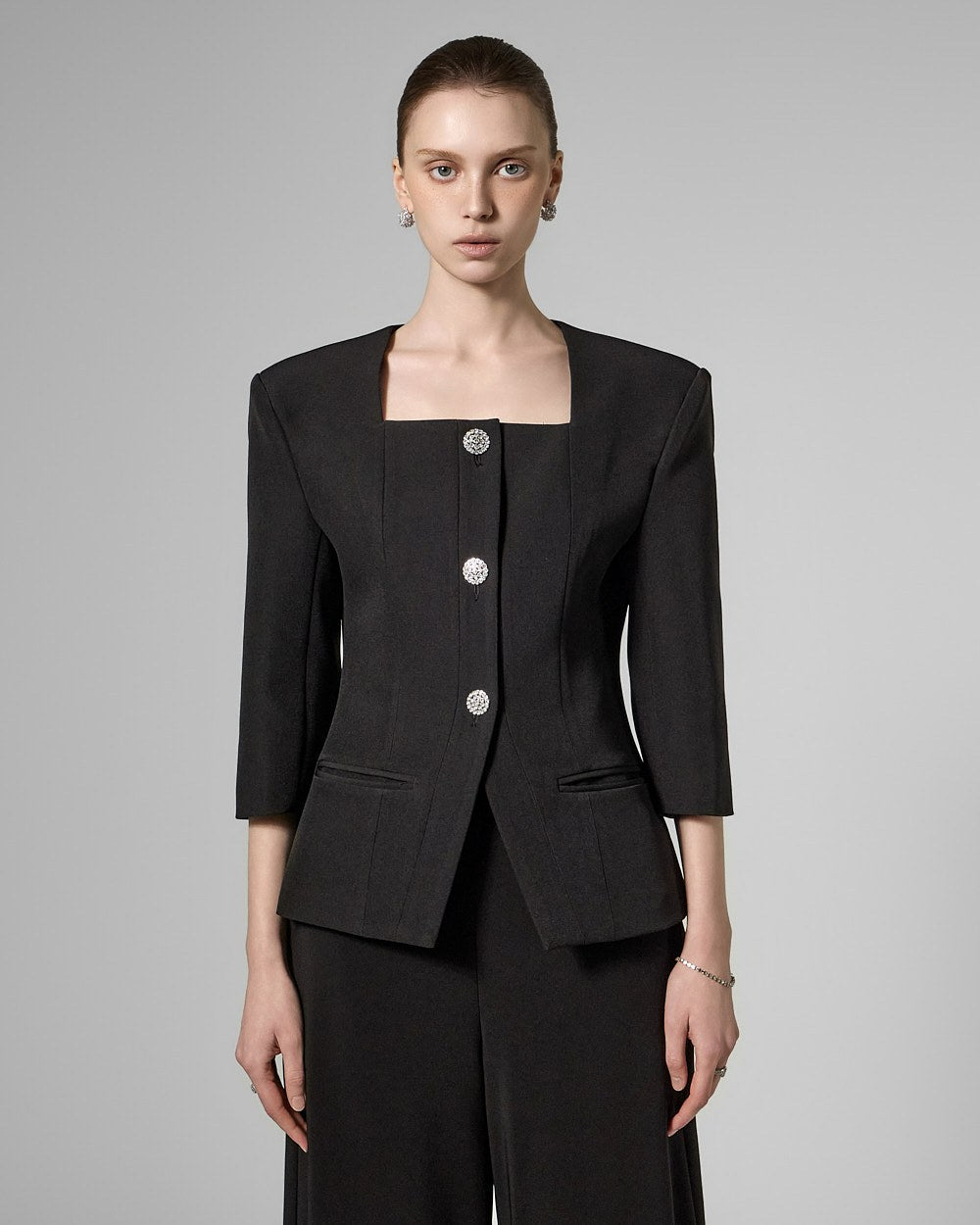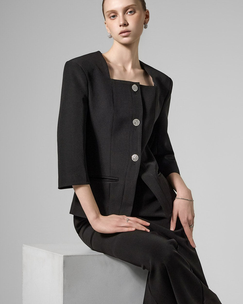 This cubic button jacket exudes elegance and femininity.