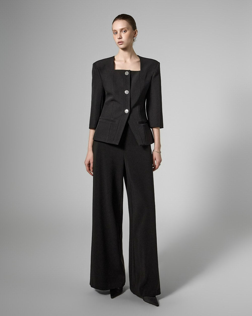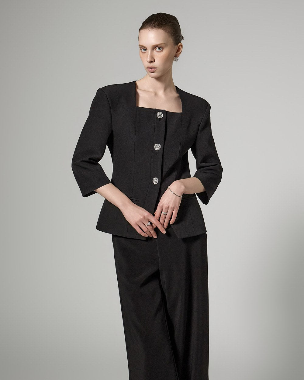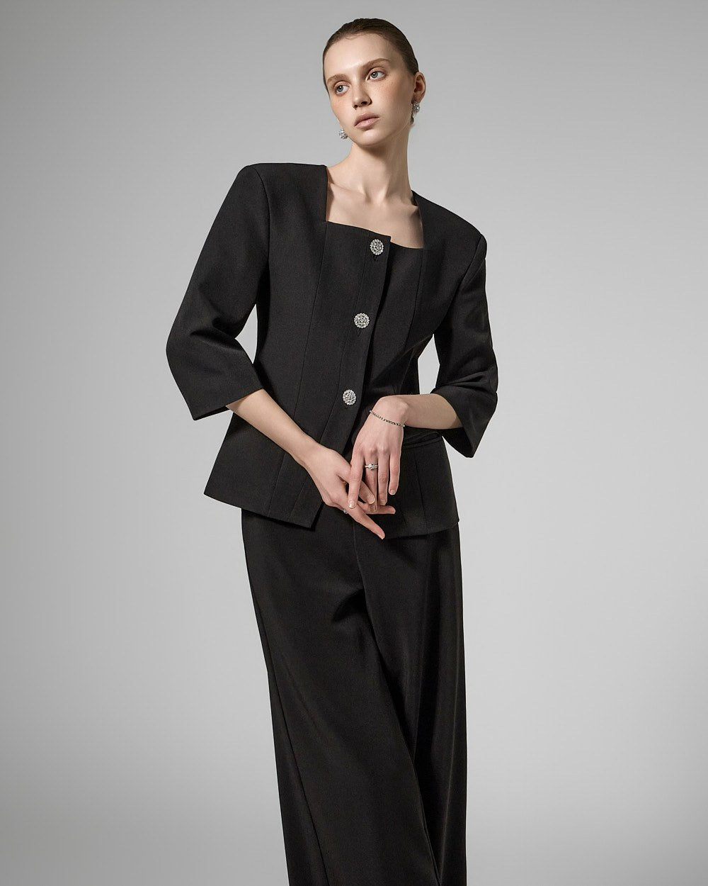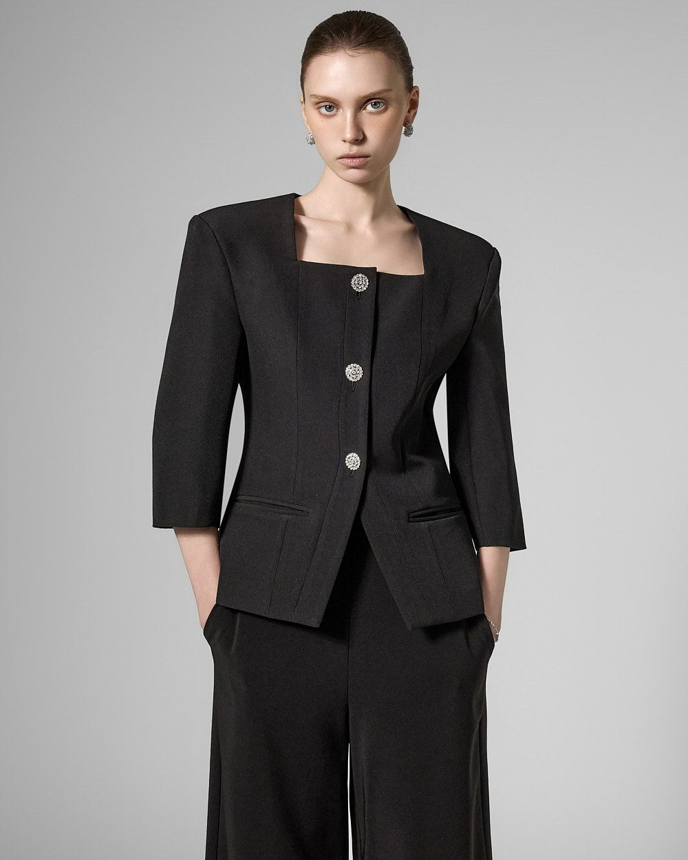This cubic button jacket exudes elegance and femininity.