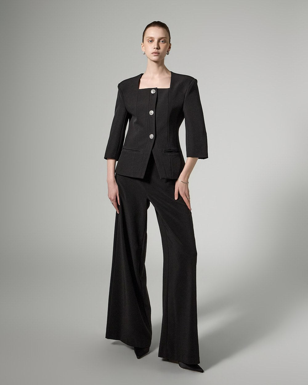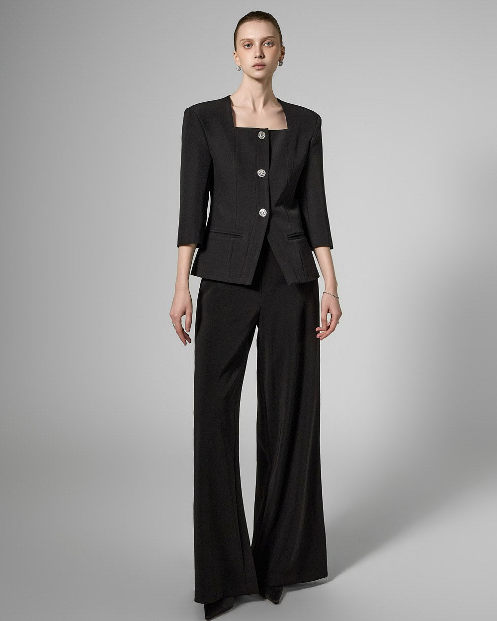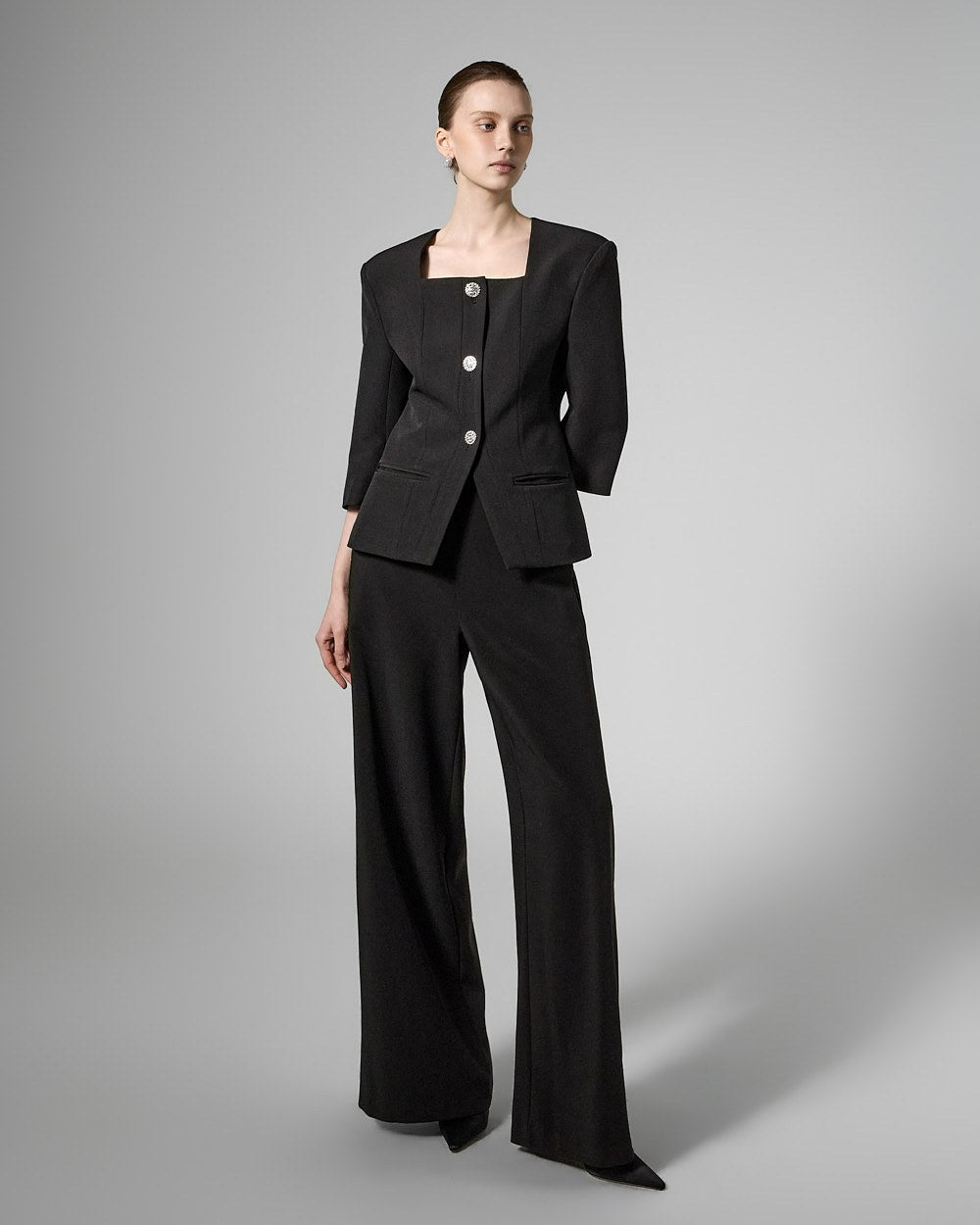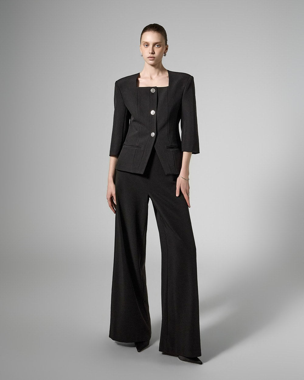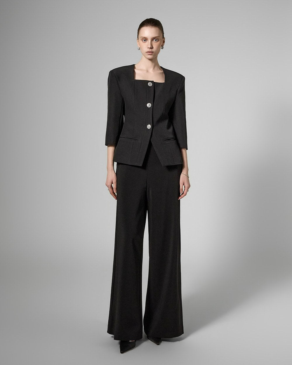 This cubic button jacket exudes elegance and femininity.