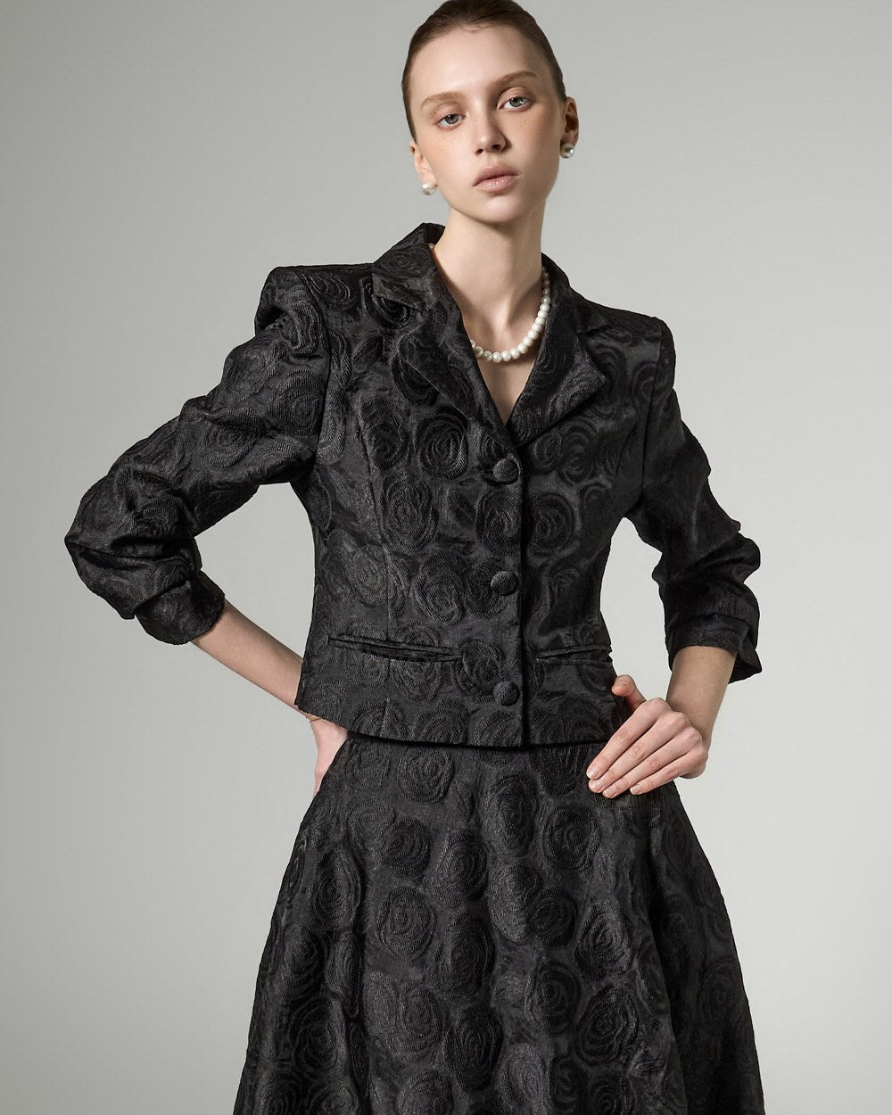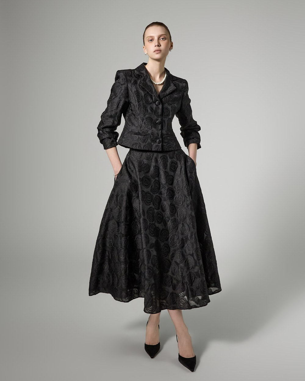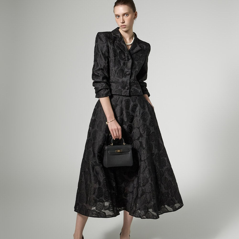 This flower pattern jacket exudes an elegant and feminine vibe.