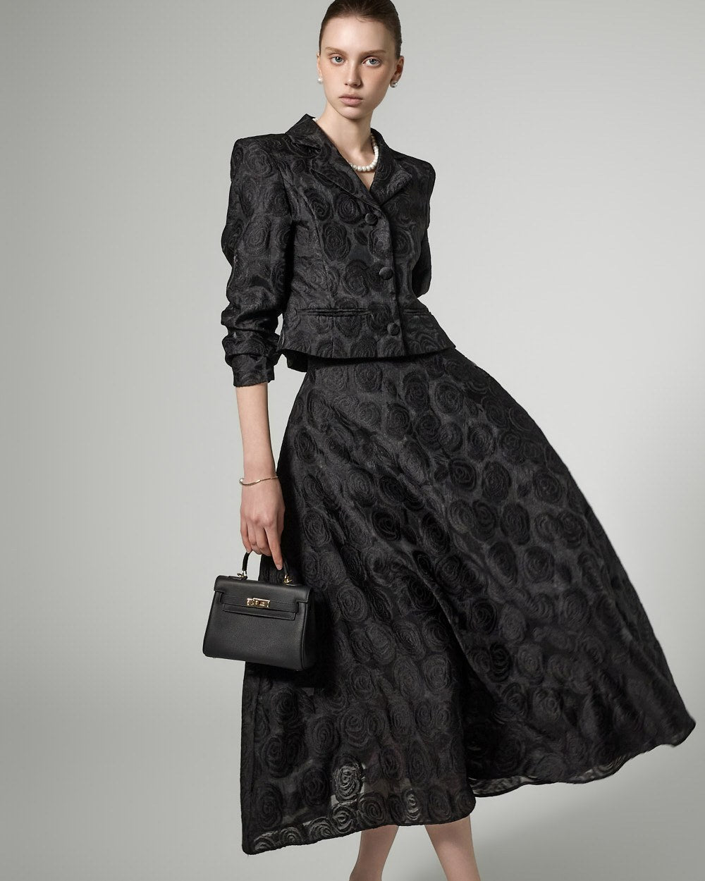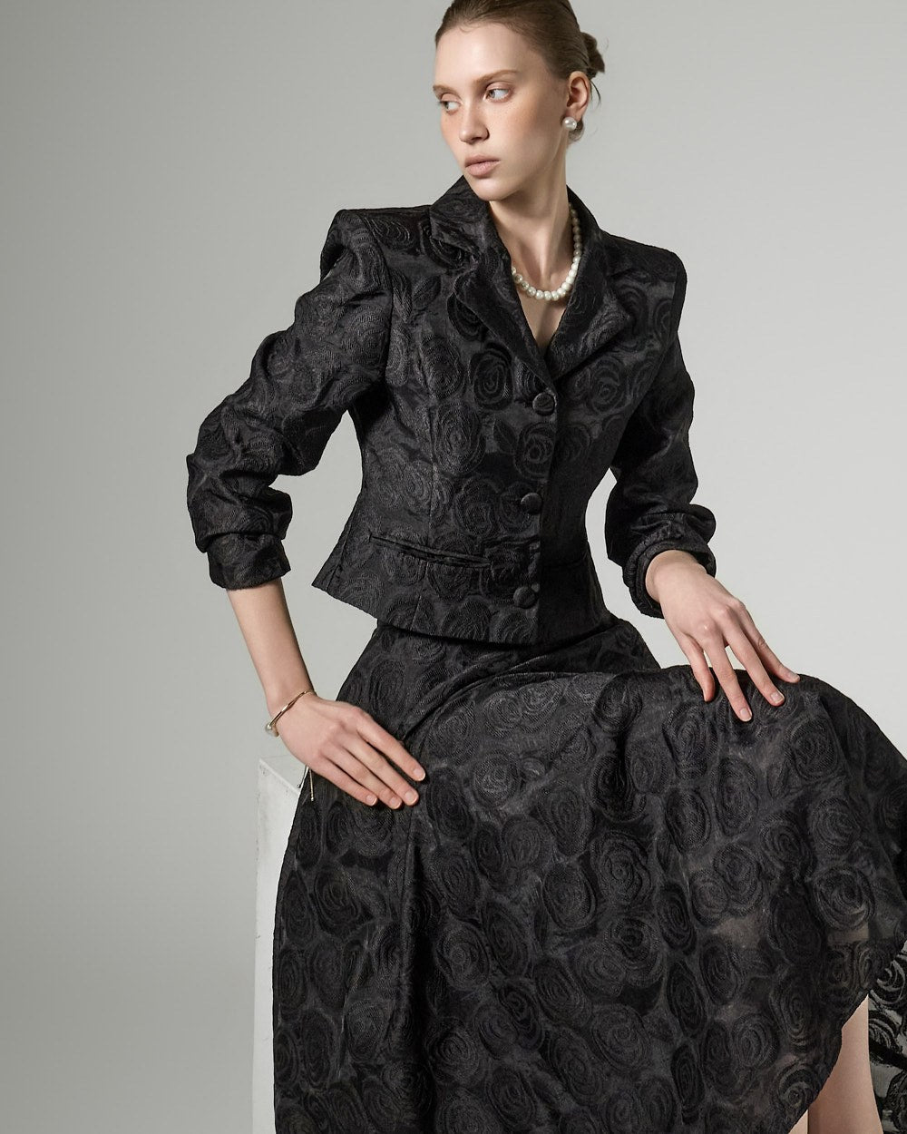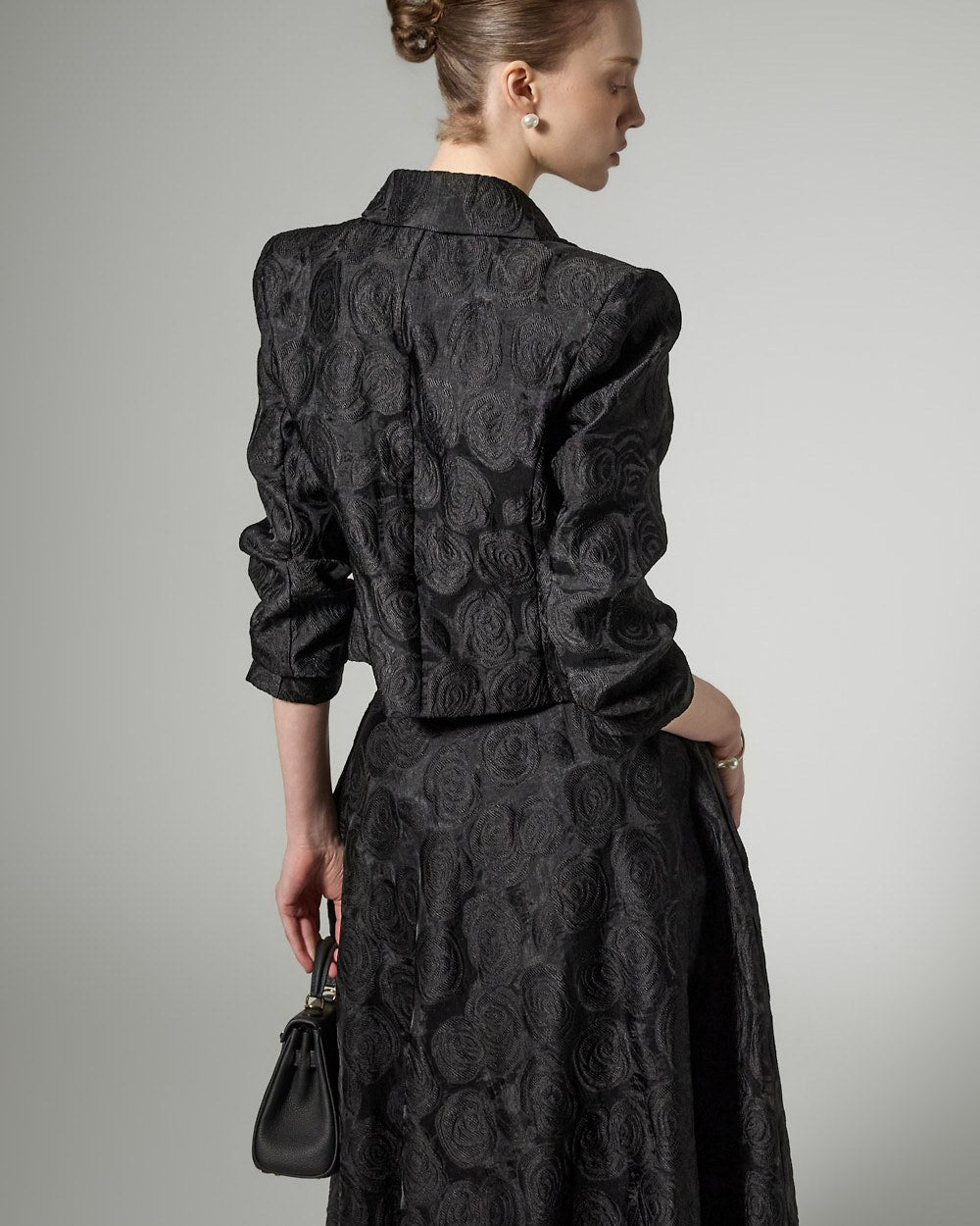 This flower pattern jacket exudes an elegant and feminine vibe.