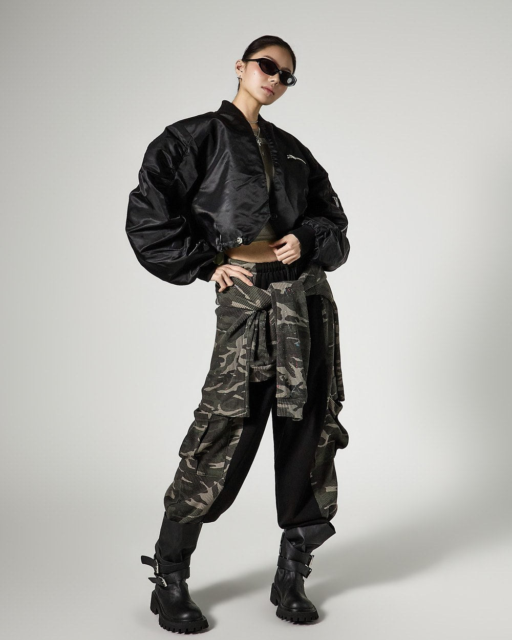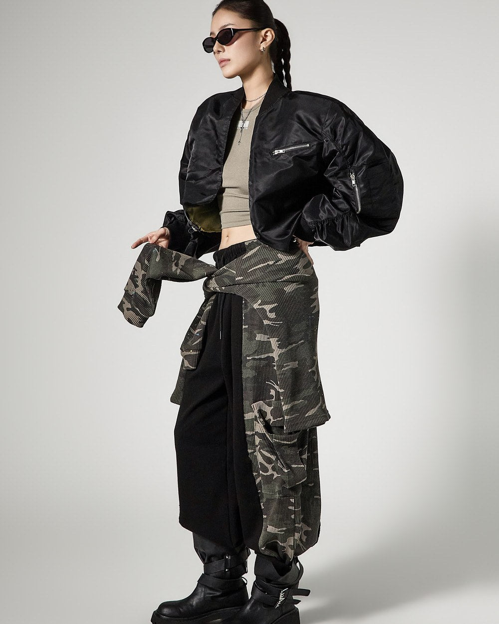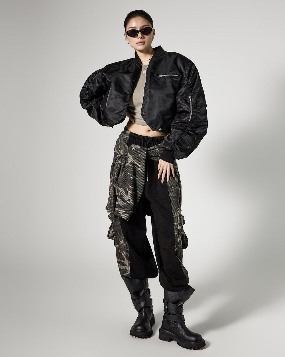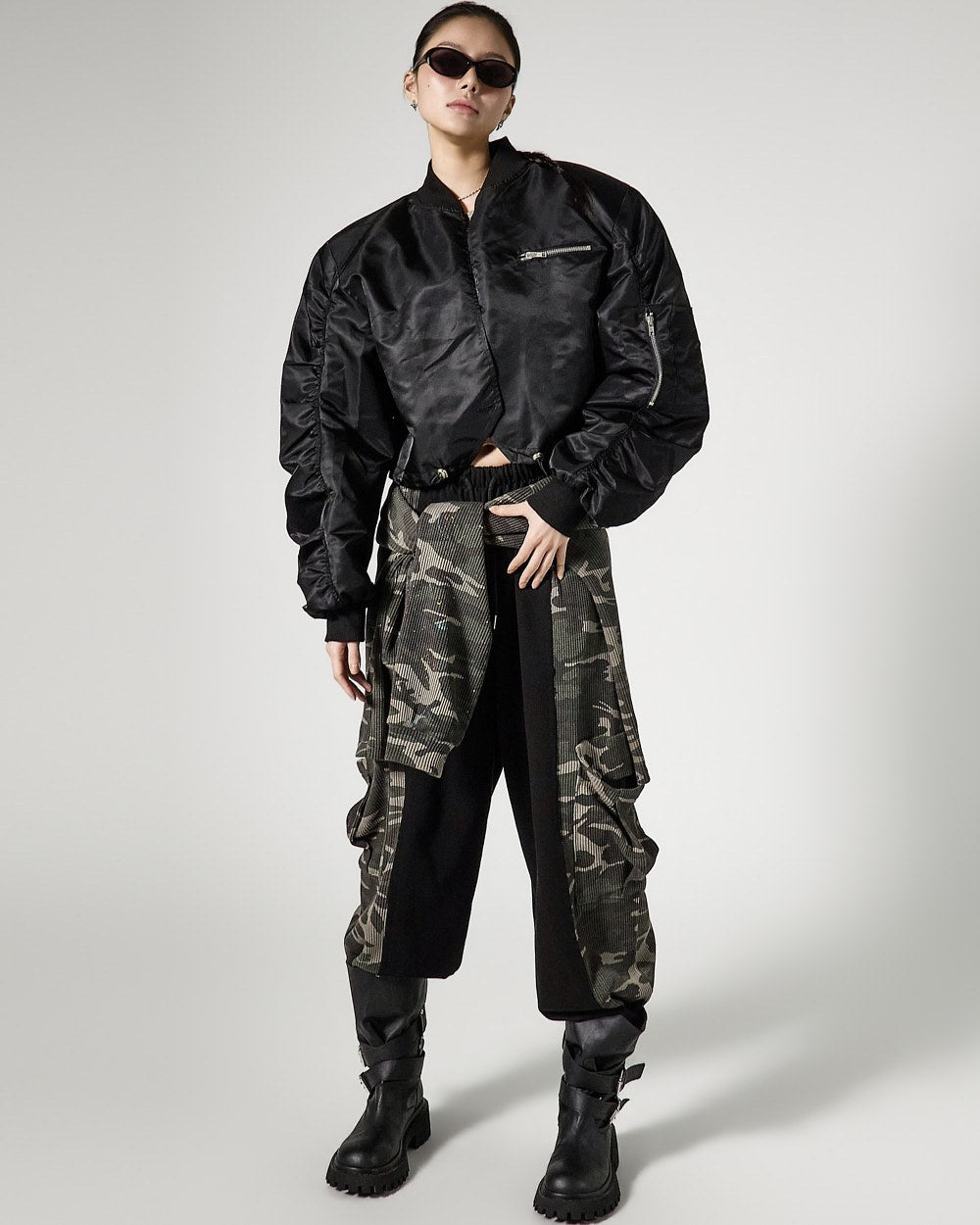 while zipper details on the front bust and sleeve pockets add practicality and a stylish accent,