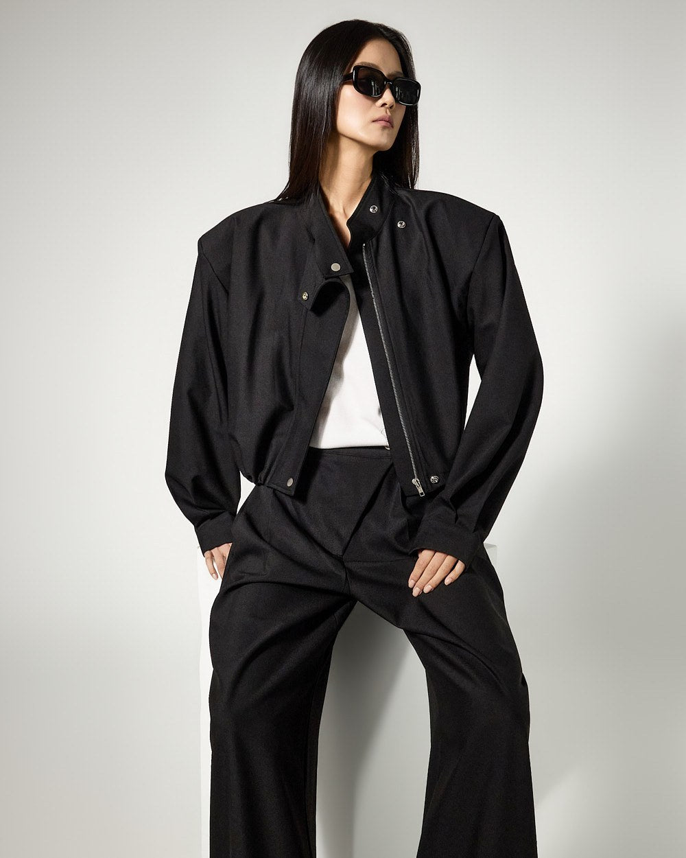 and the addition of moderate shoulder pads creates a clean silhouette,