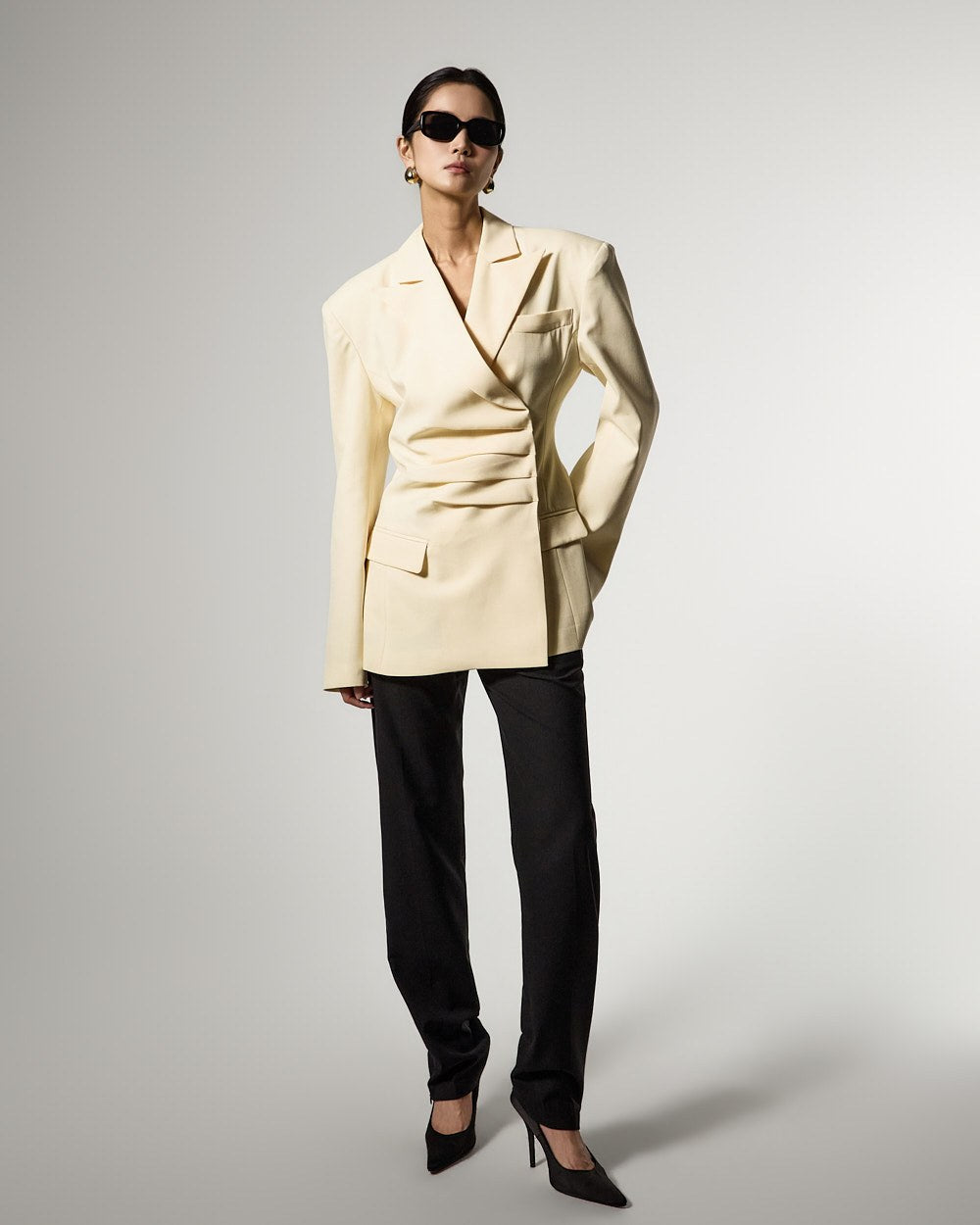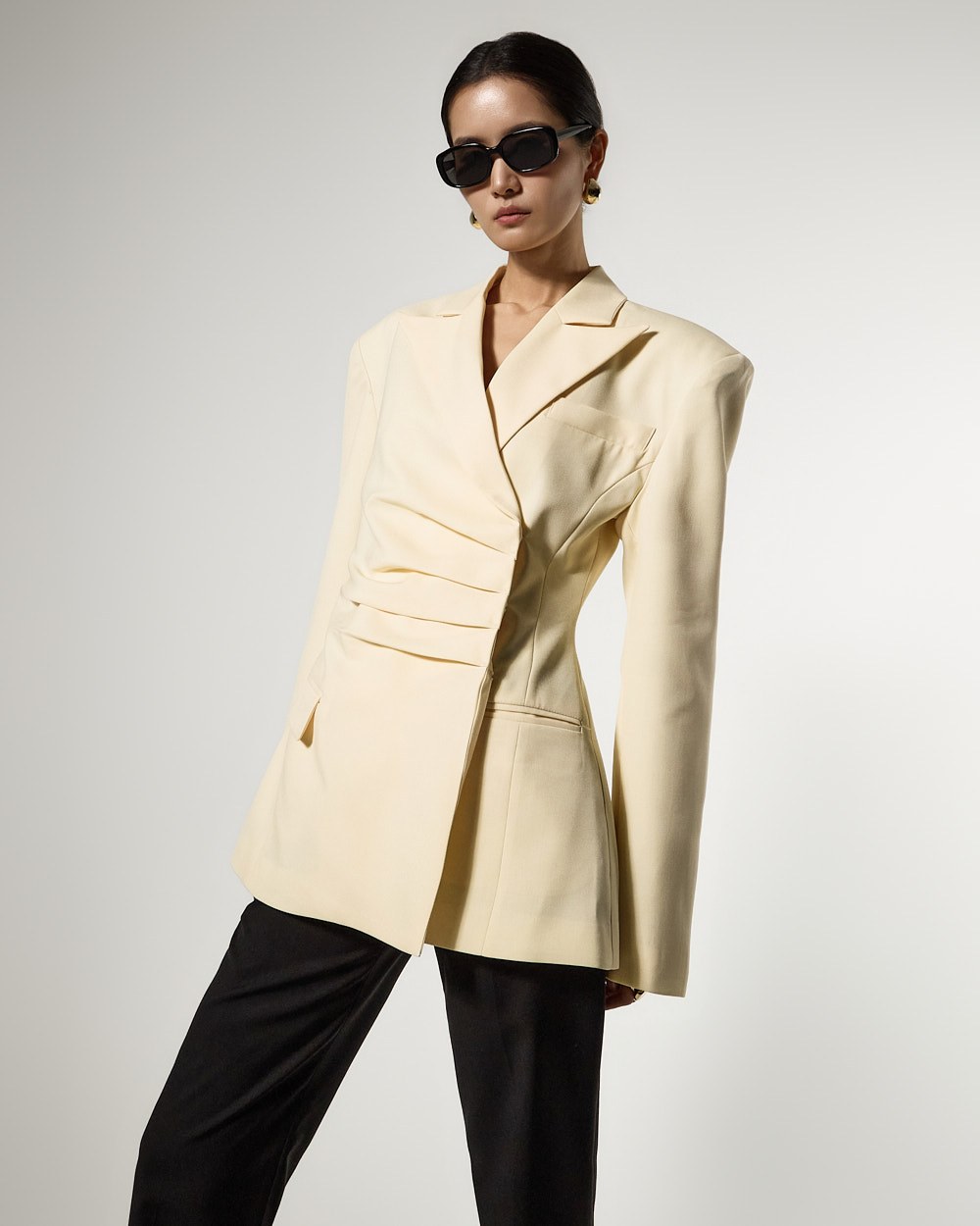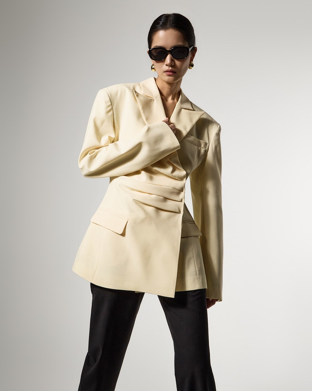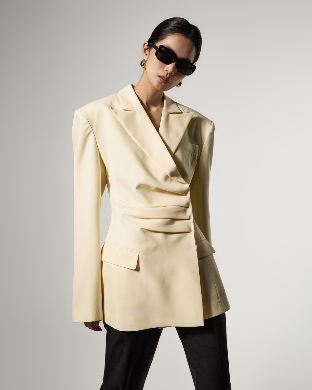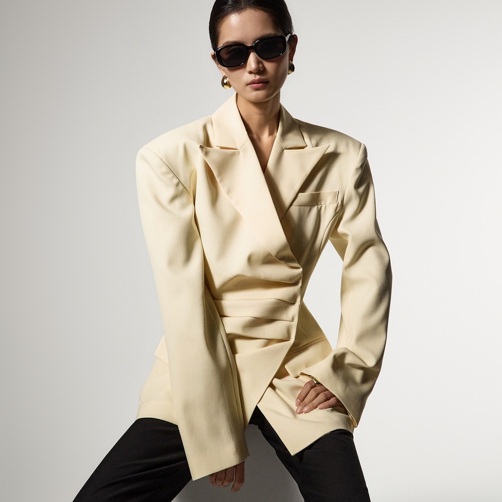 モダンでユニークなムードのドレープテーラードジャケットです。