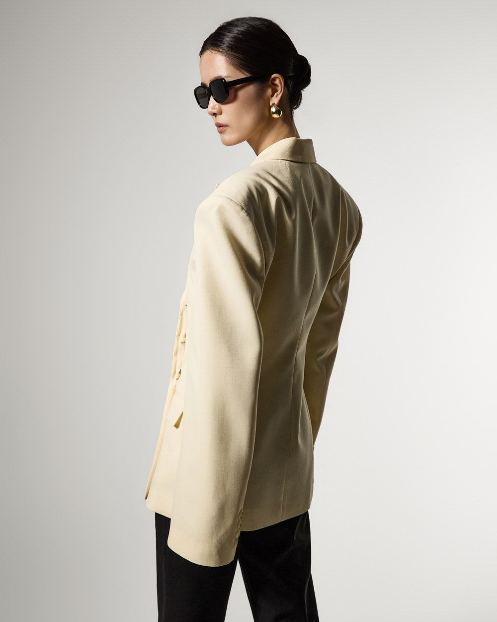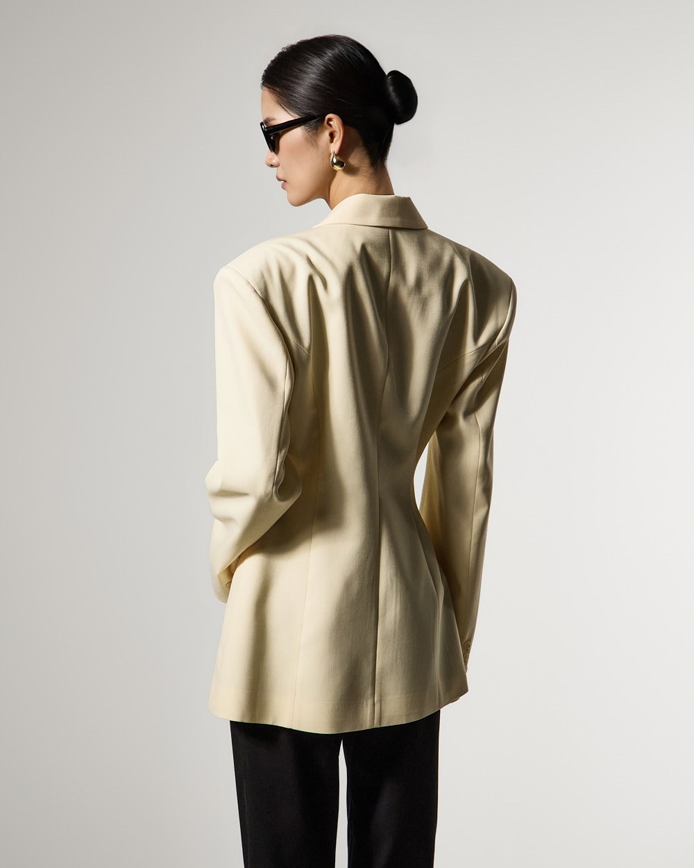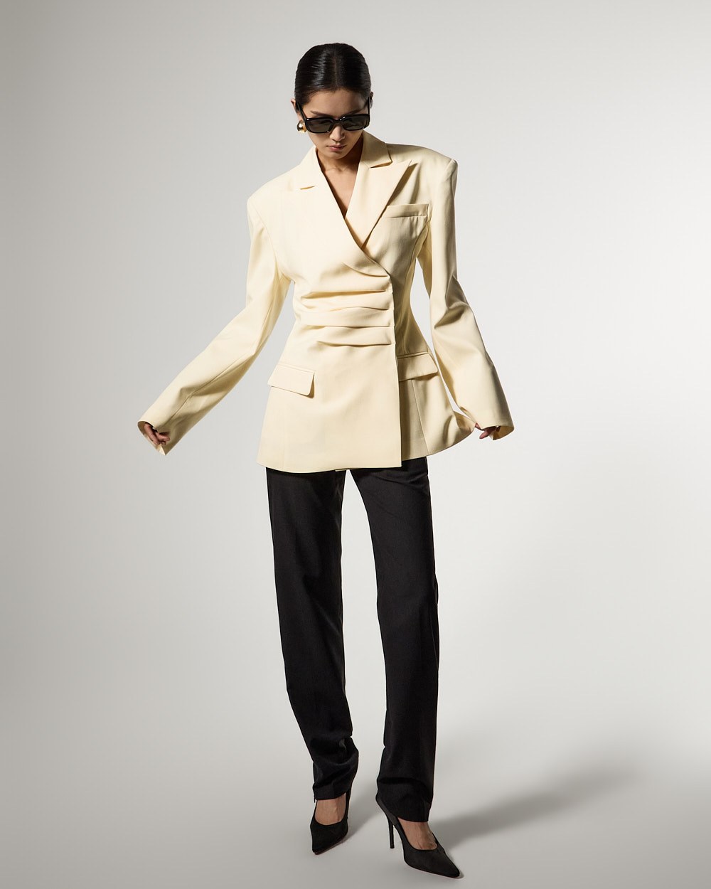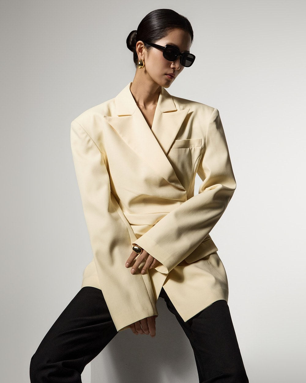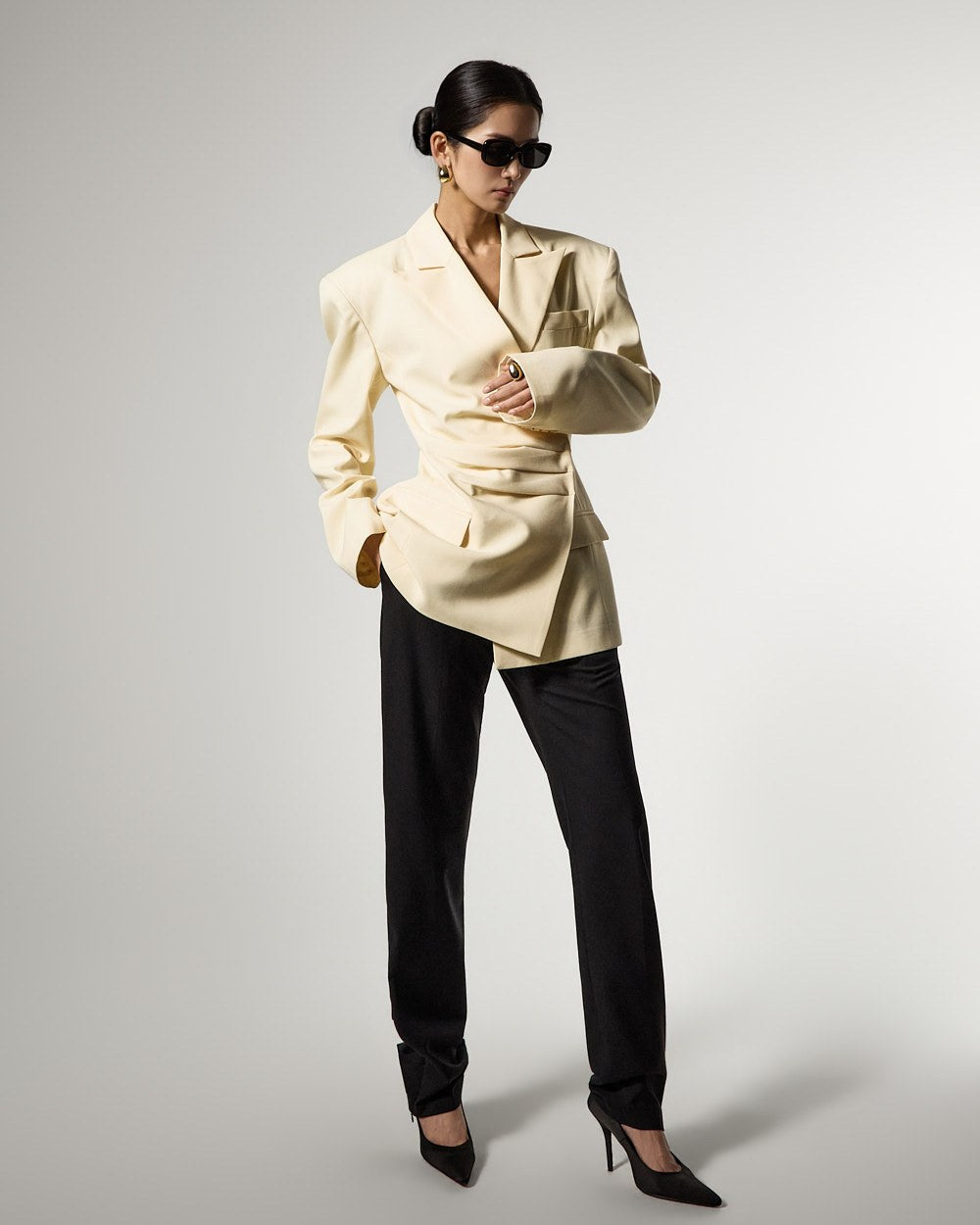 モダンでユニークなムードのドレープテーラードジャケットです。