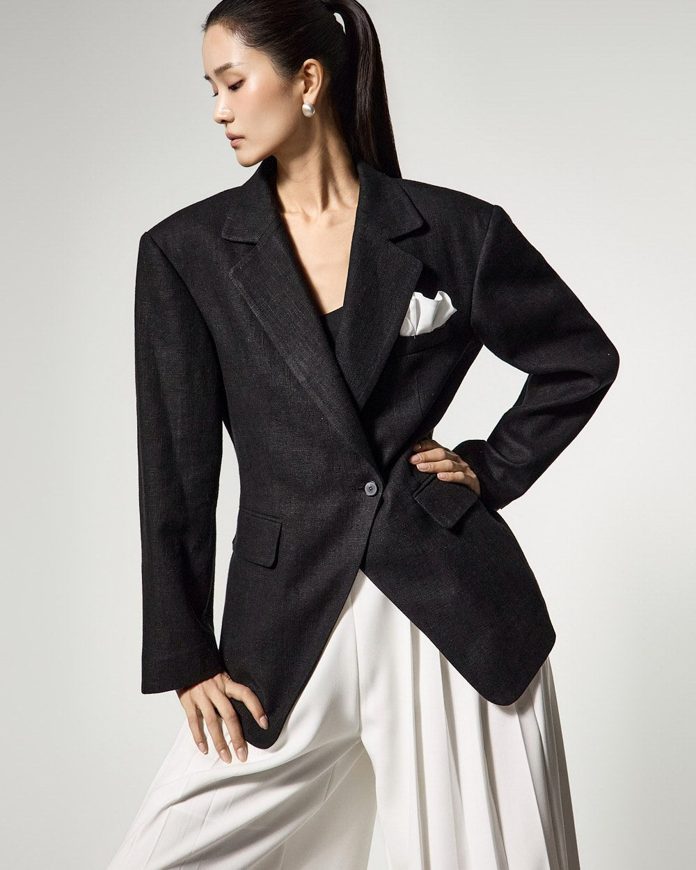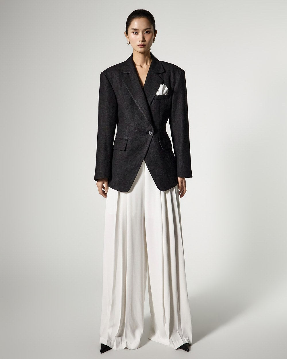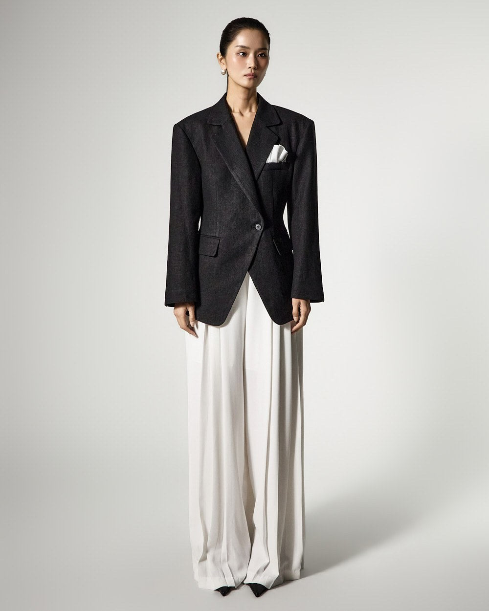 胸ポケットのポケットチーフディテールは洗練されたアクセントになり、