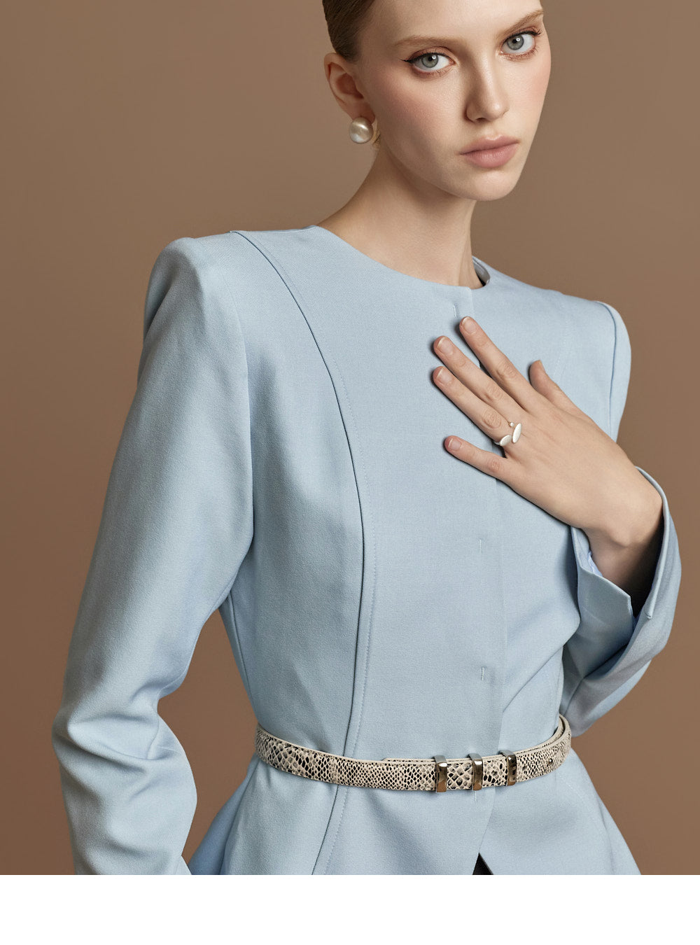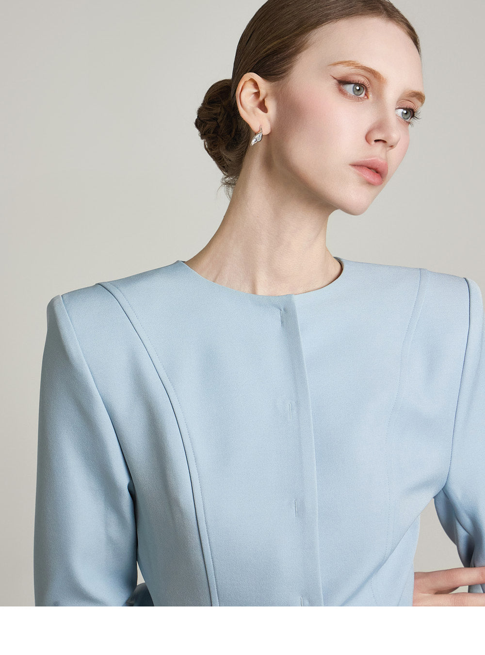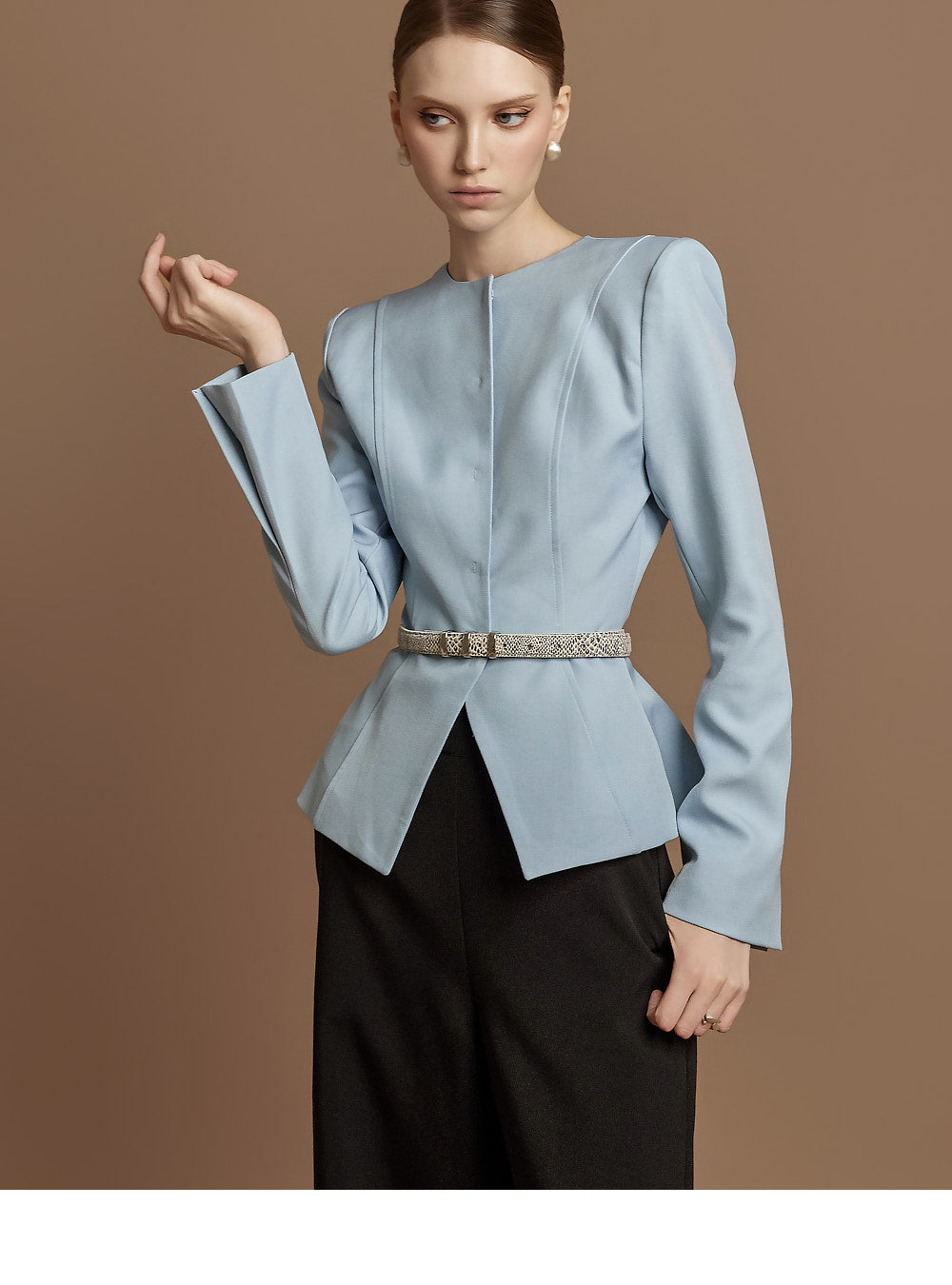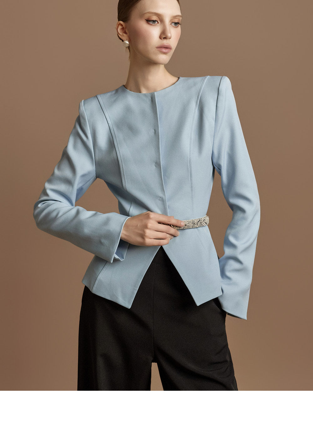 ノーカラーデザインが柔らかく洗練されたフェイスラインを演出し、