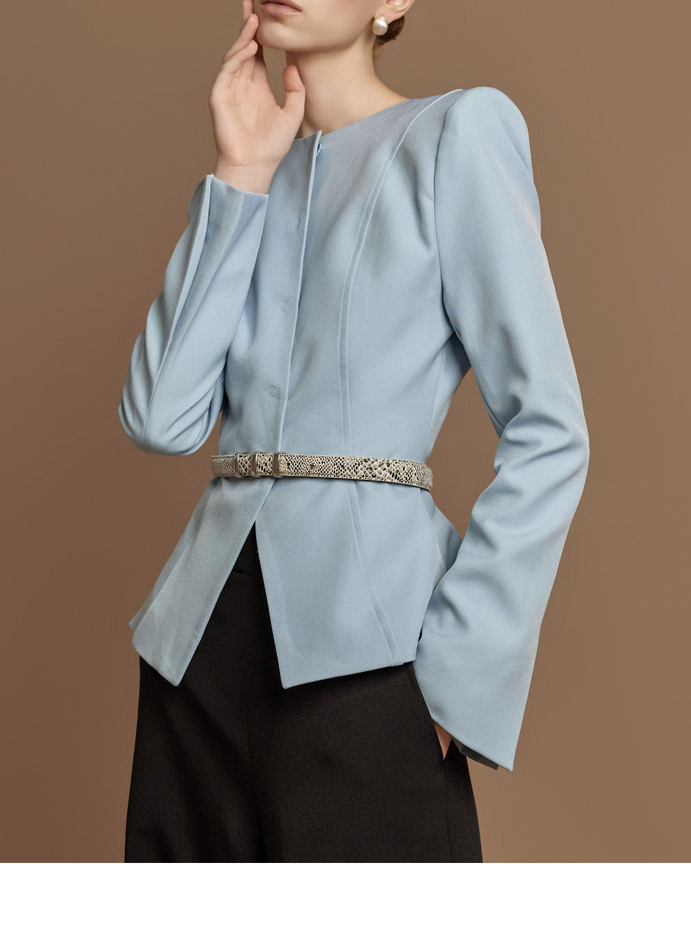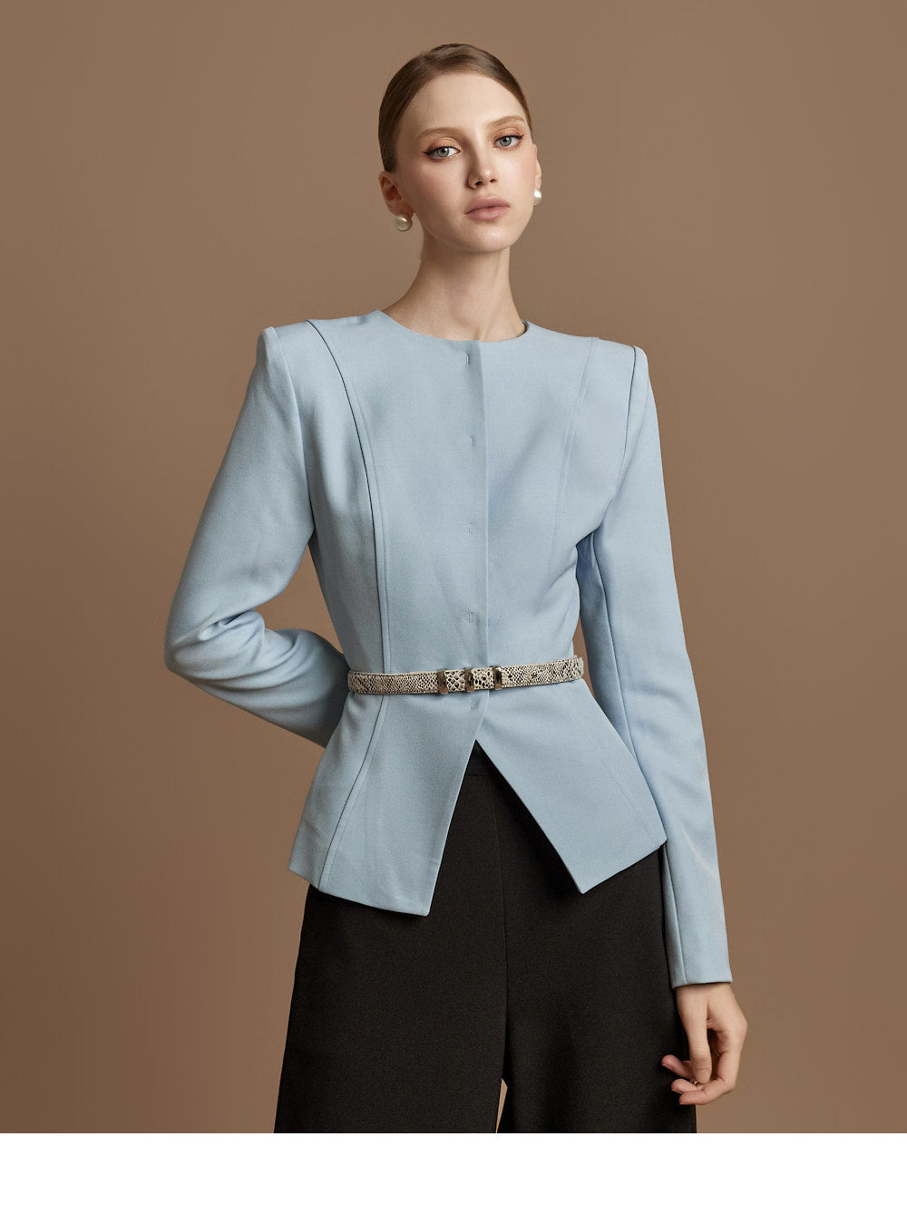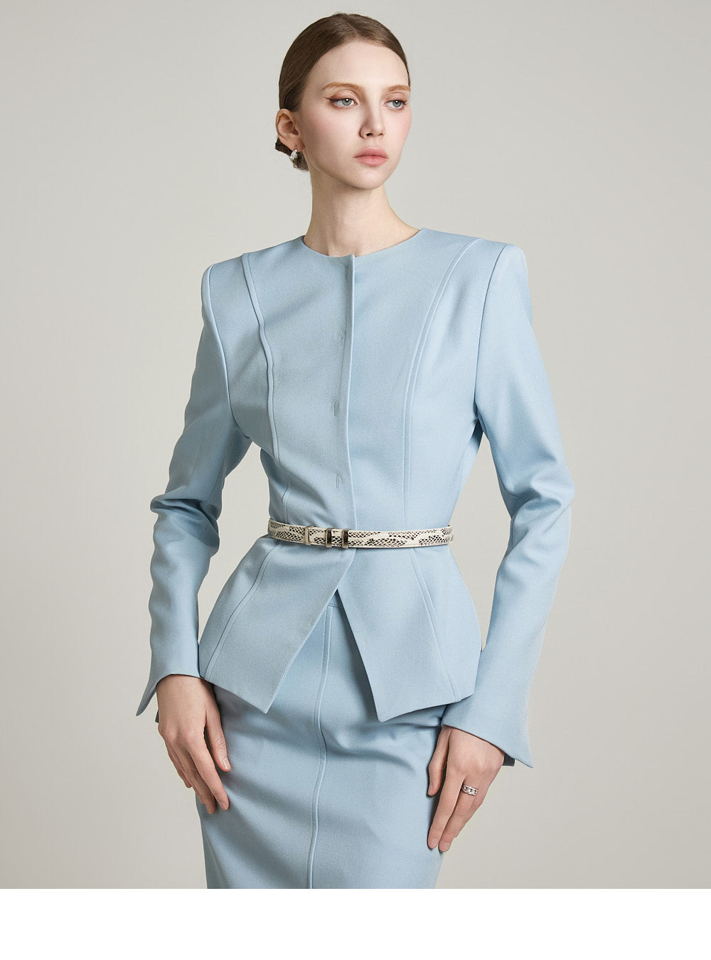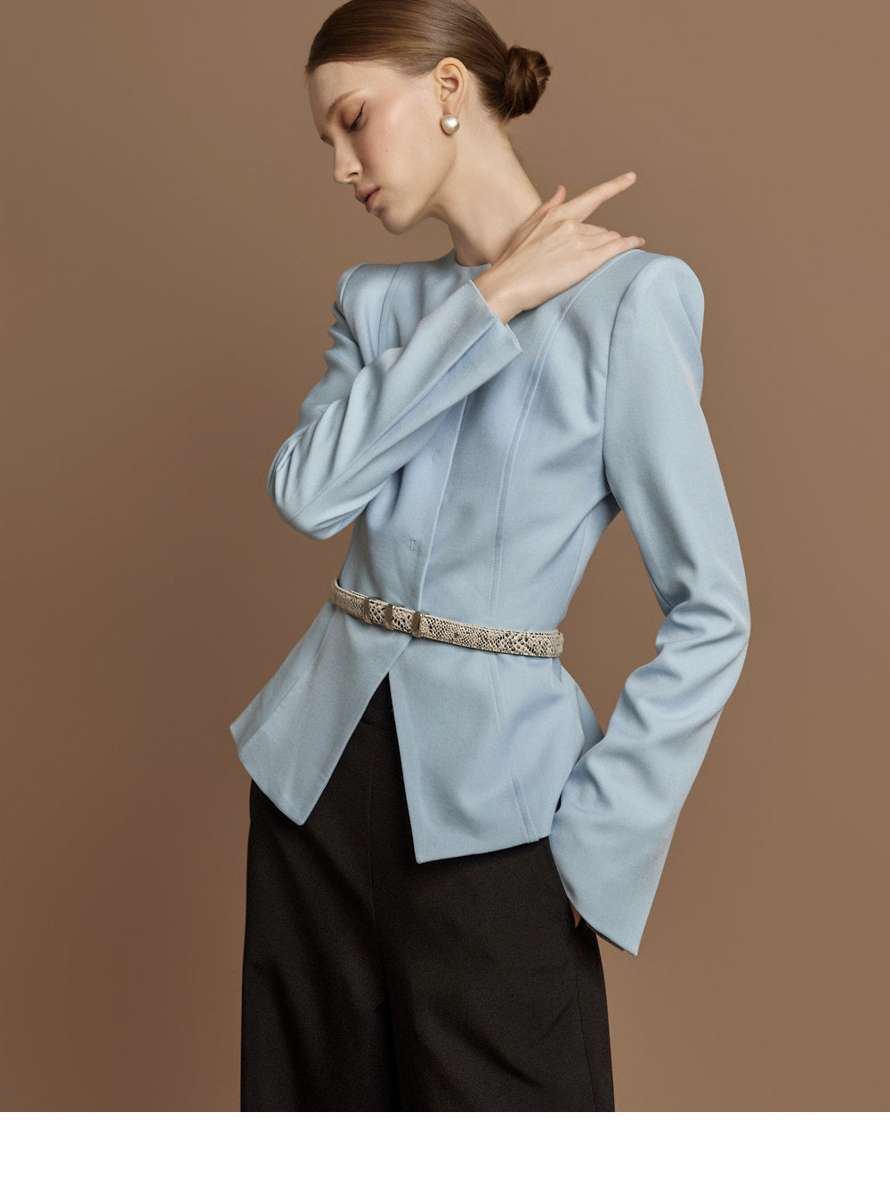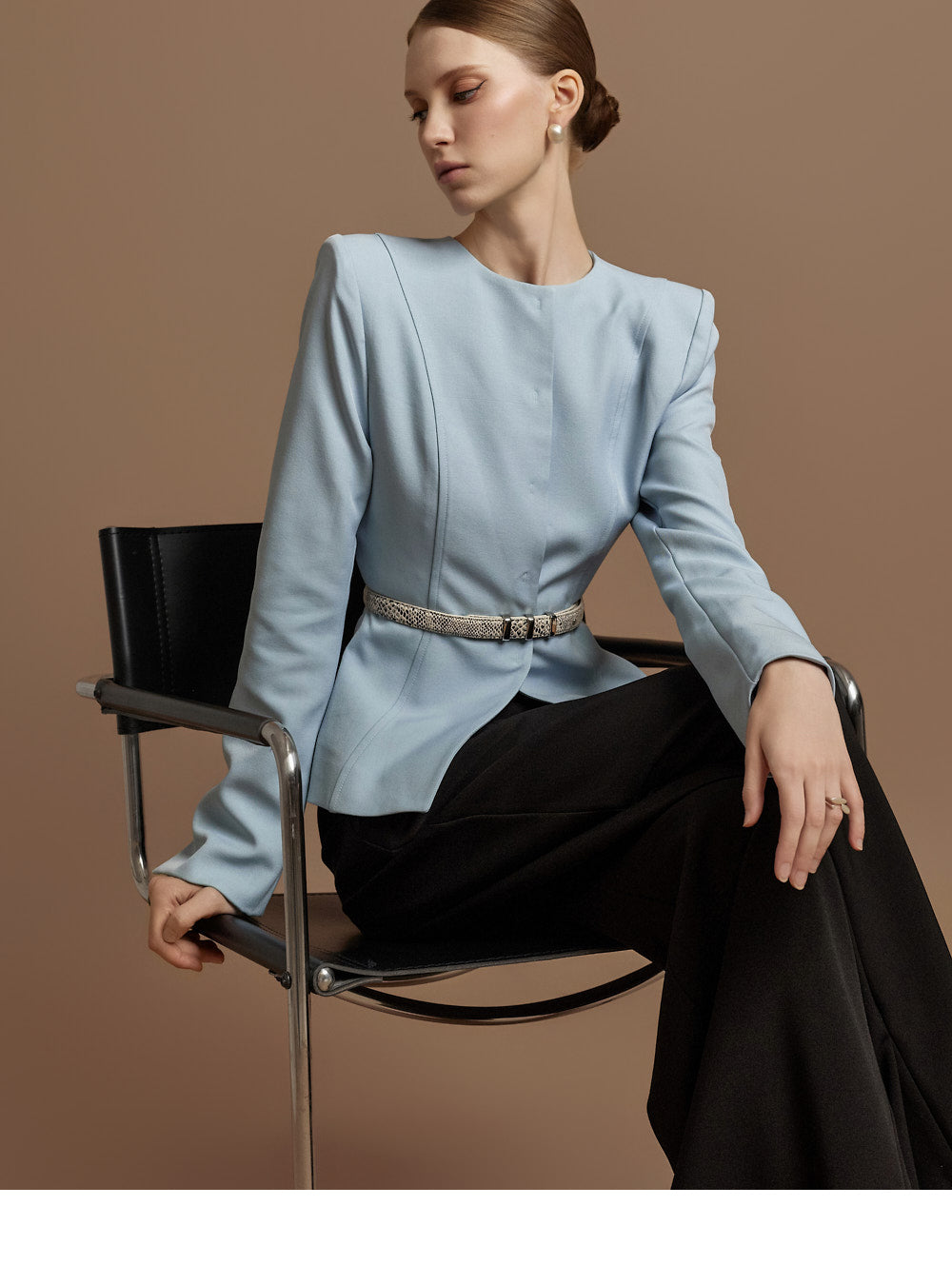 ノーカラーデザインが柔らかく洗練されたフェイスラインを演出し、