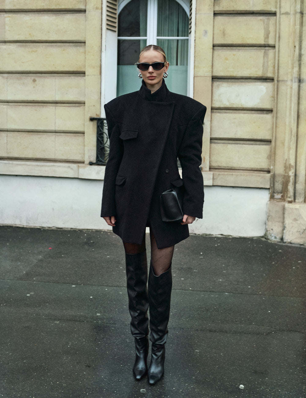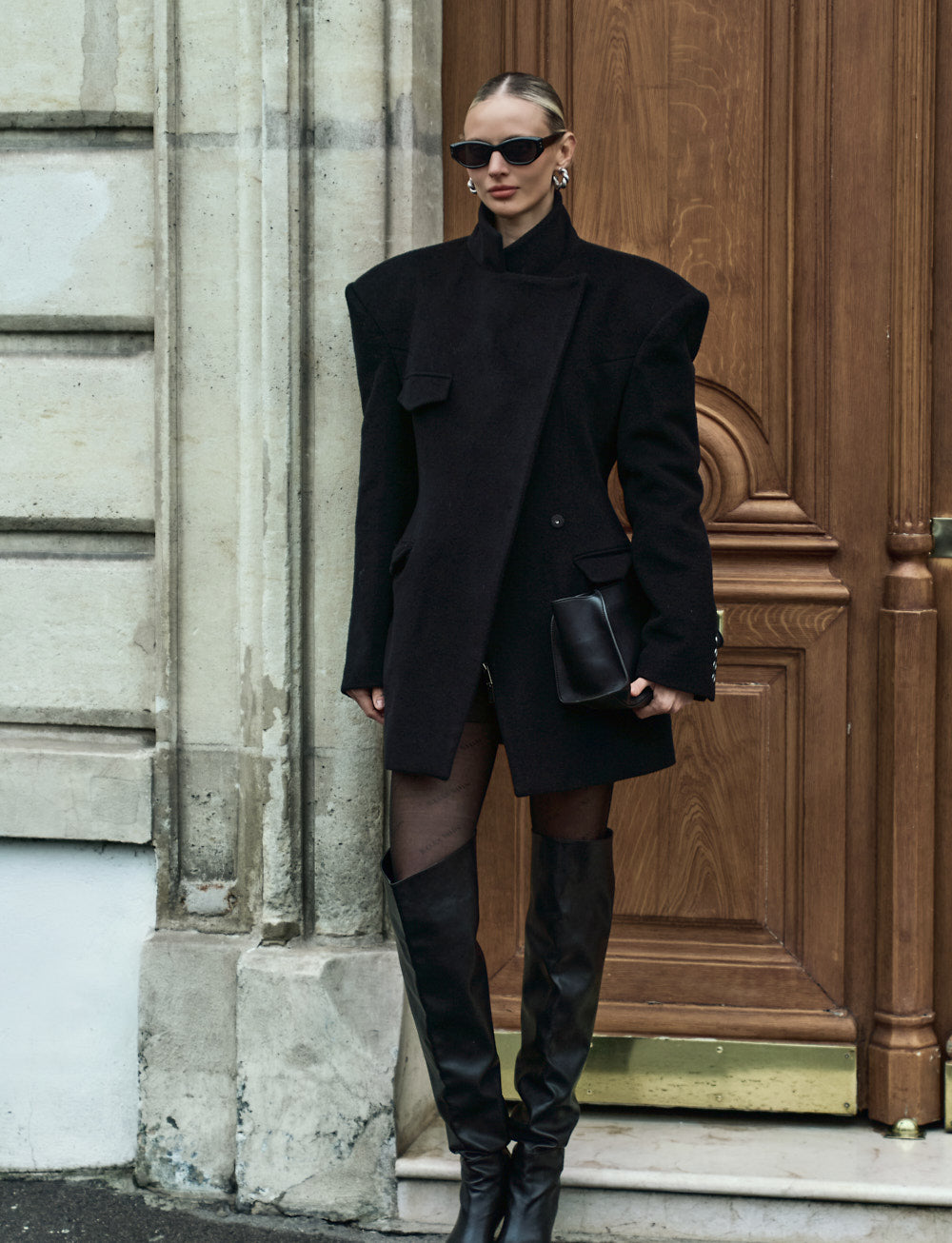 ハイネックがフェイスラインをすっきりと見せてくれます。