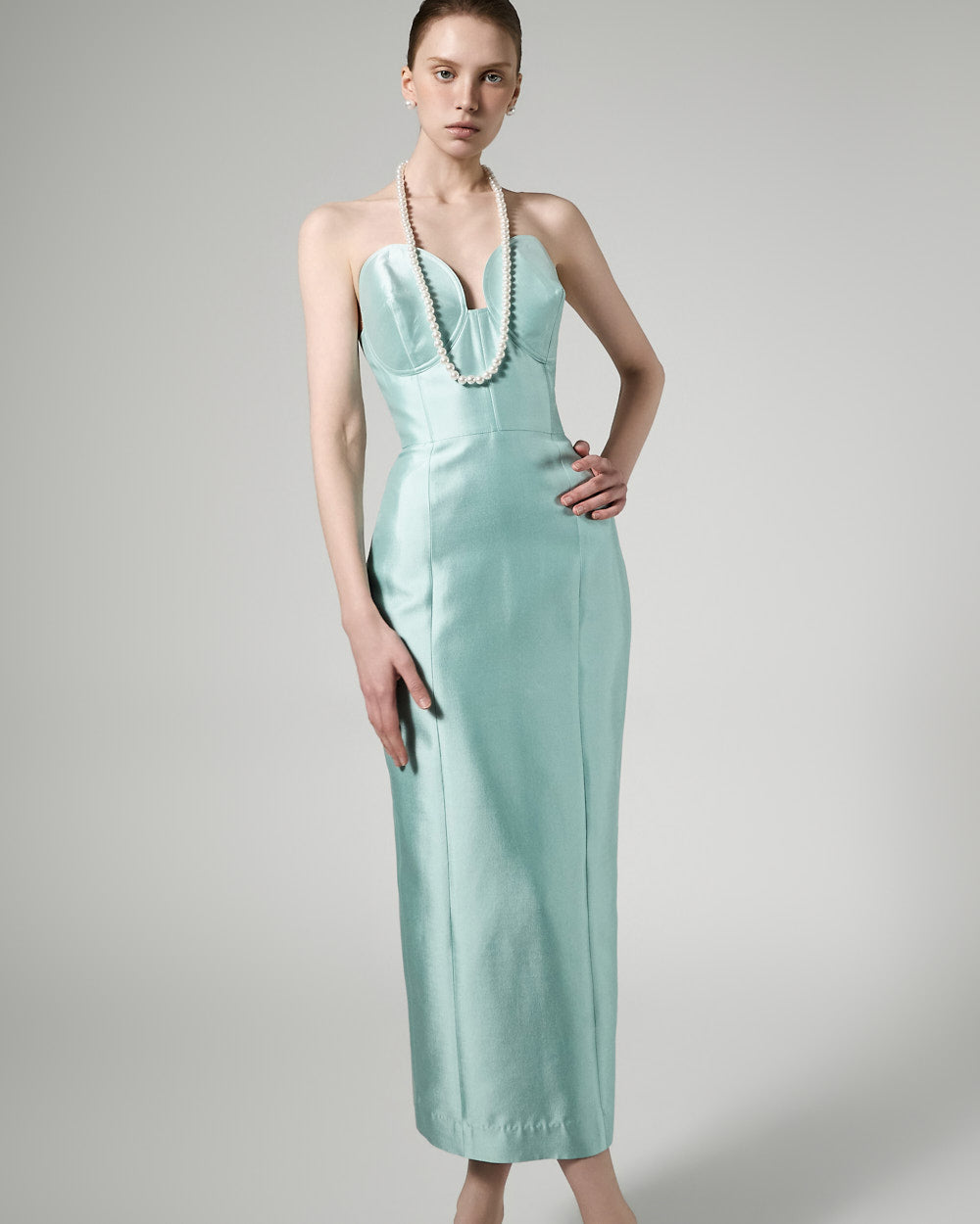 This slim-fit dress has a luxurious silhouette.