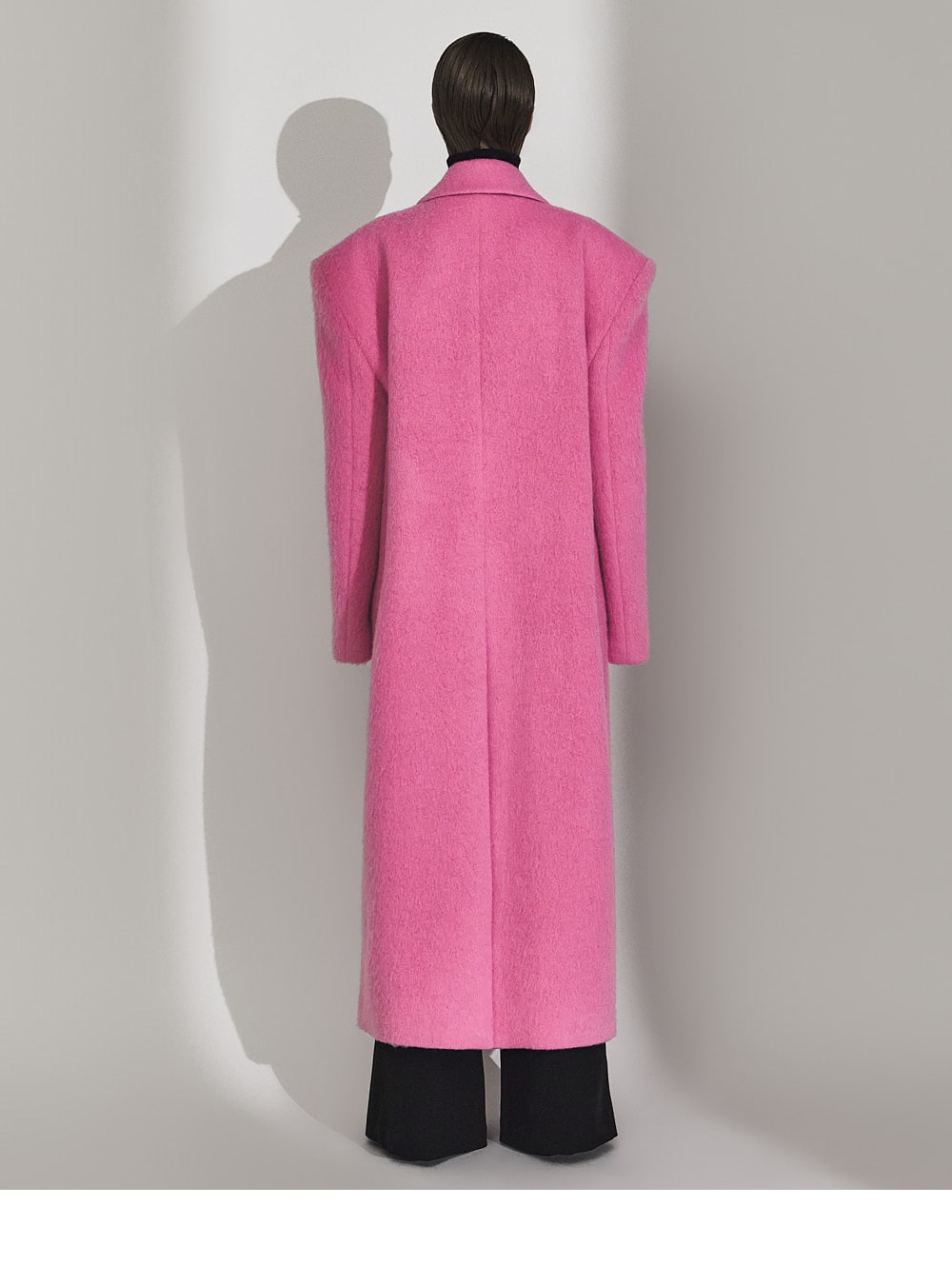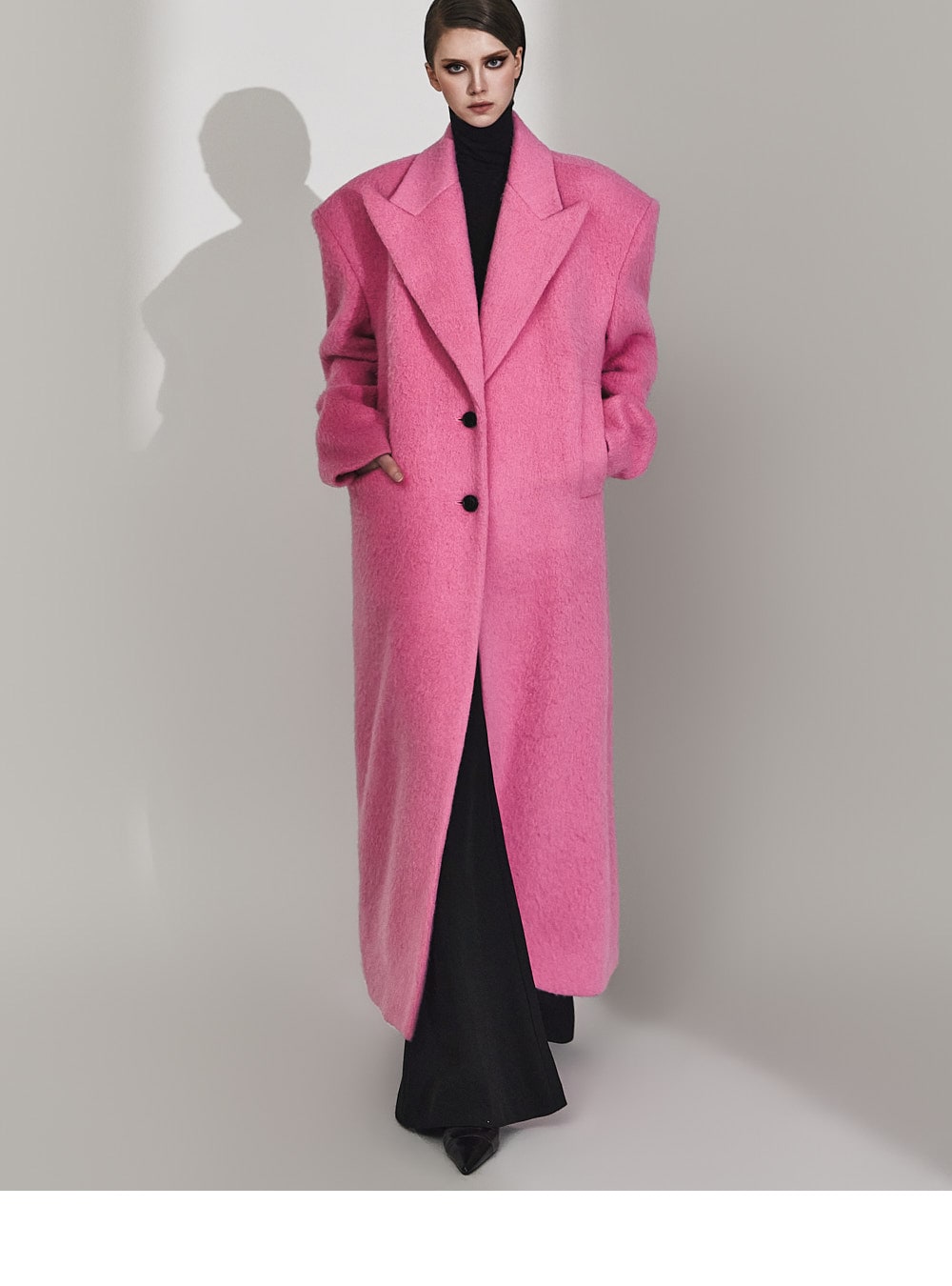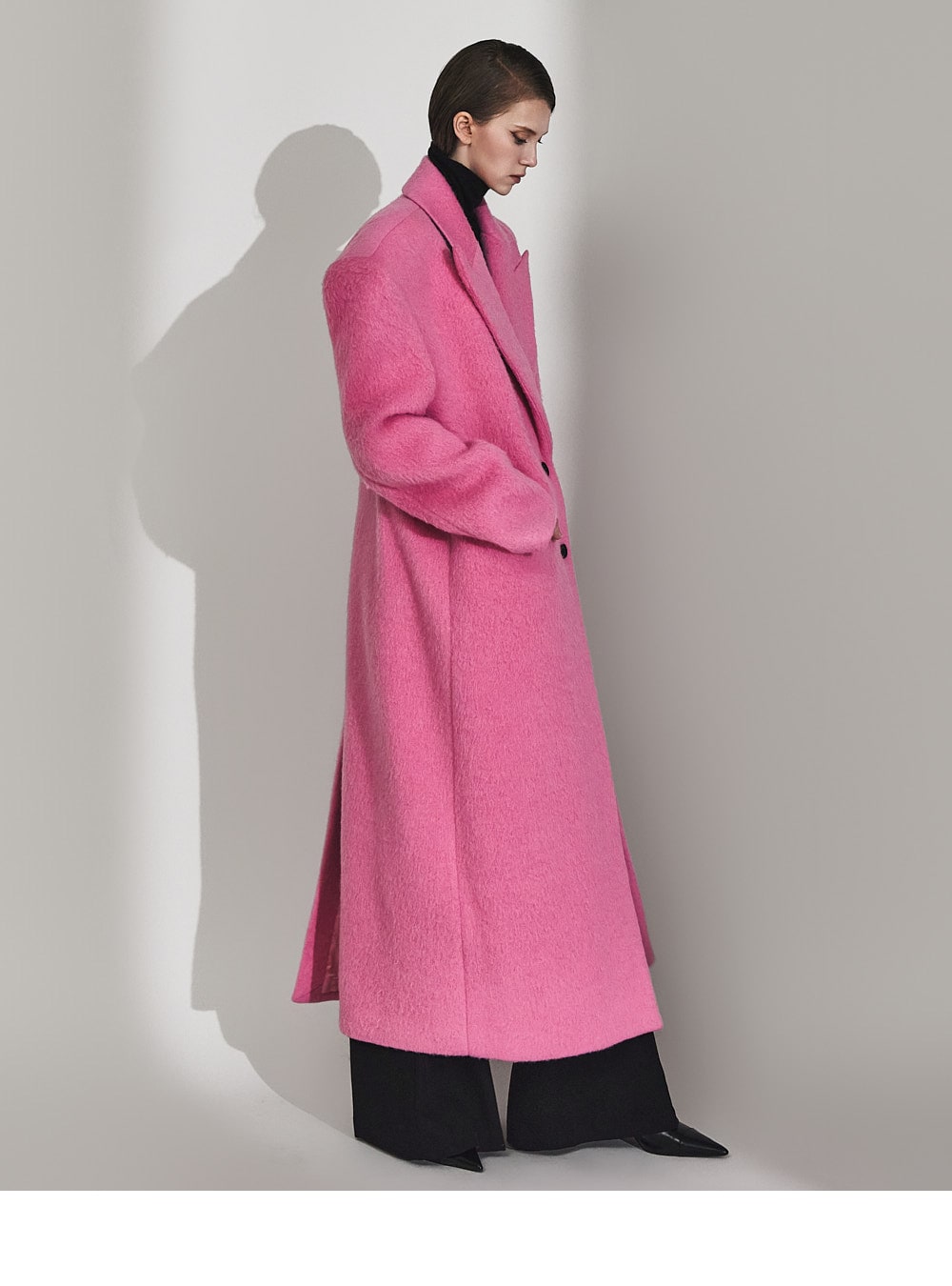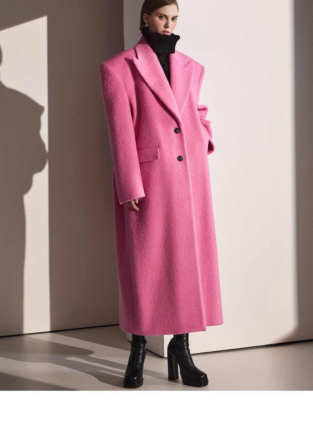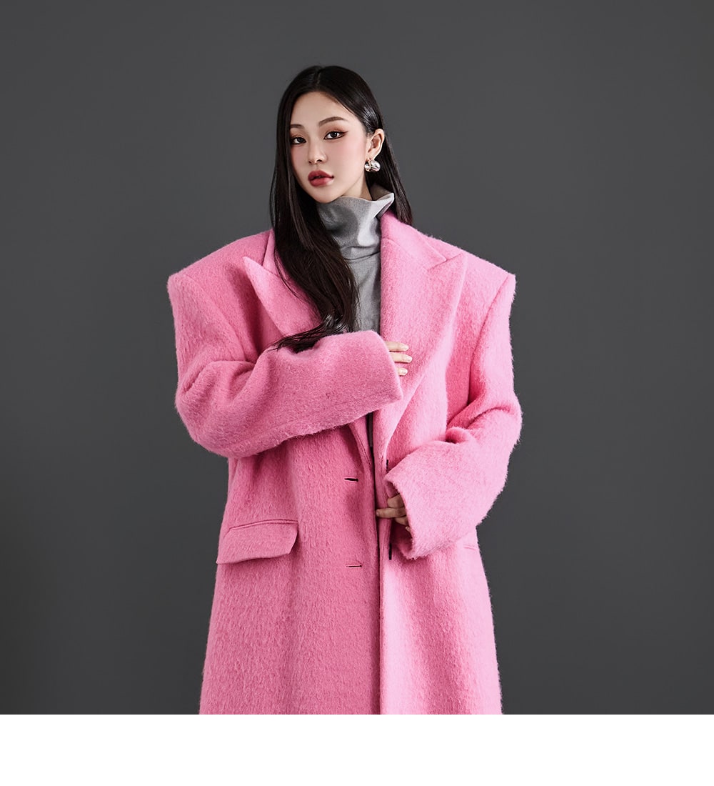 このコートは魅力的なピンク色で目立ちます。