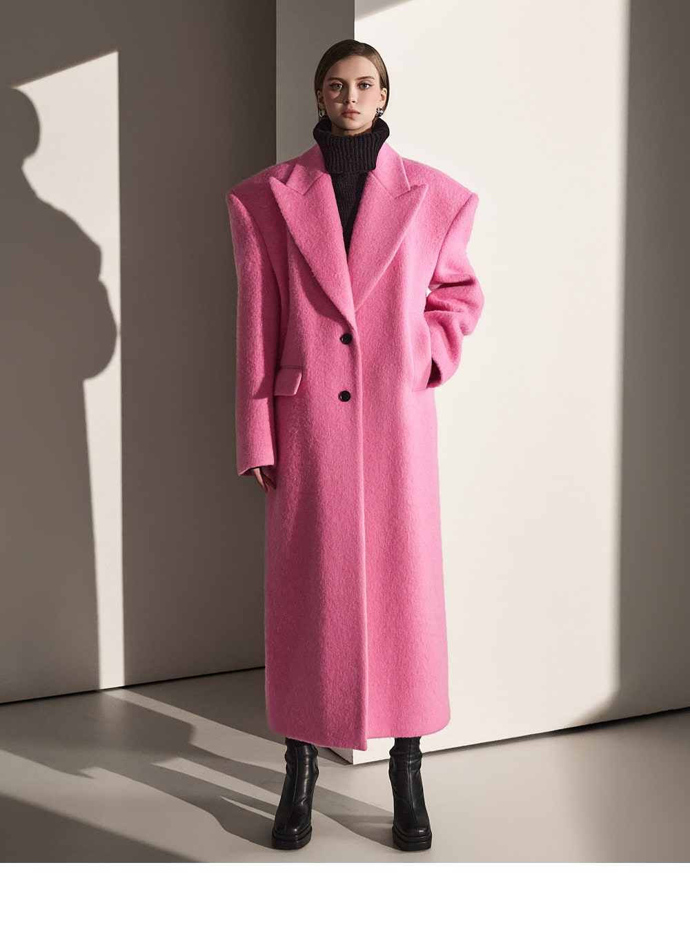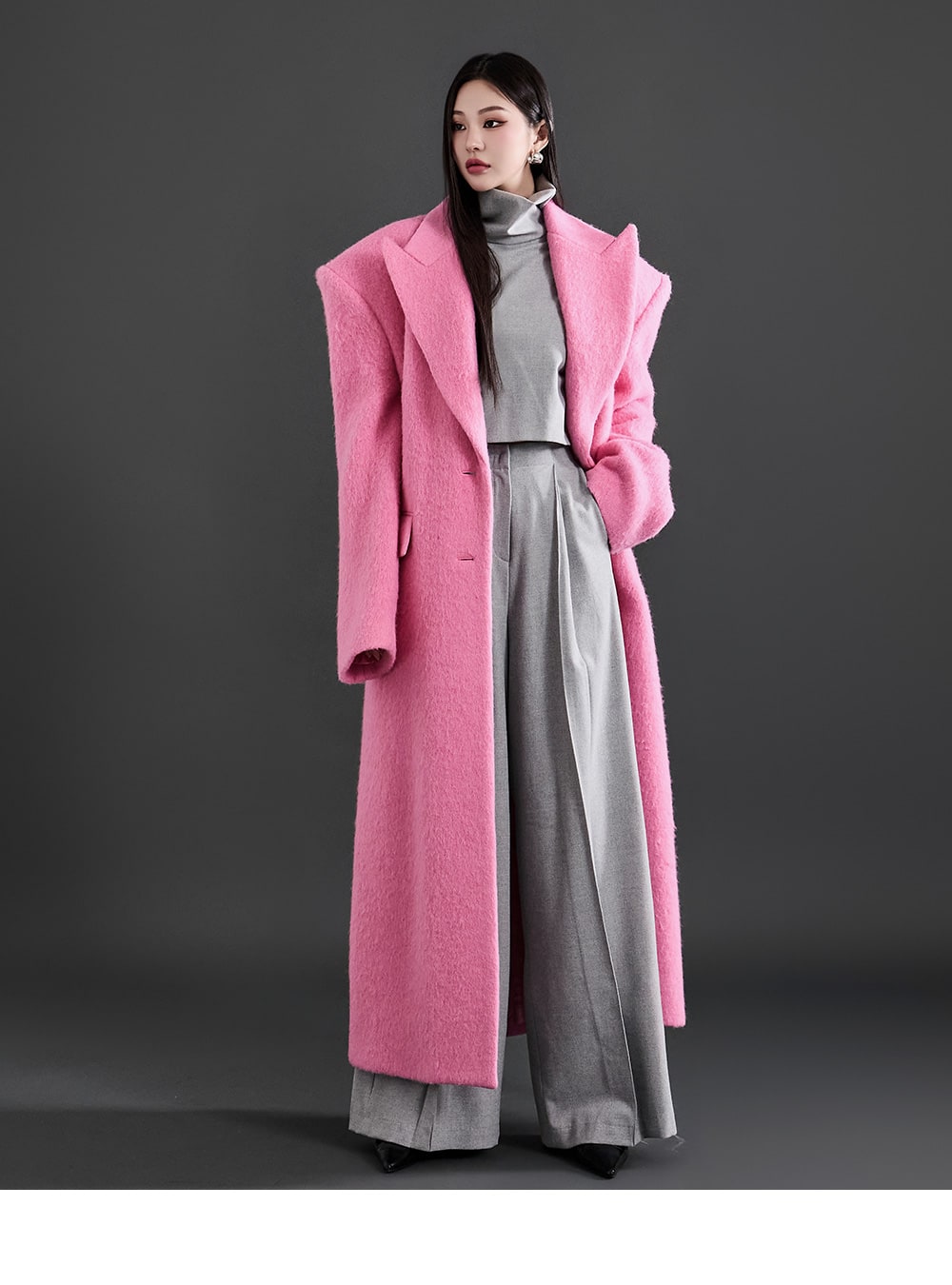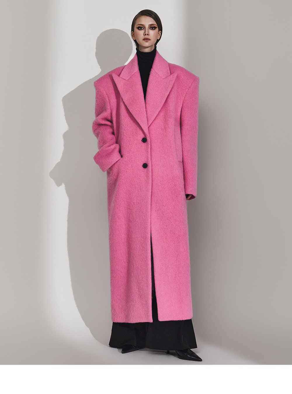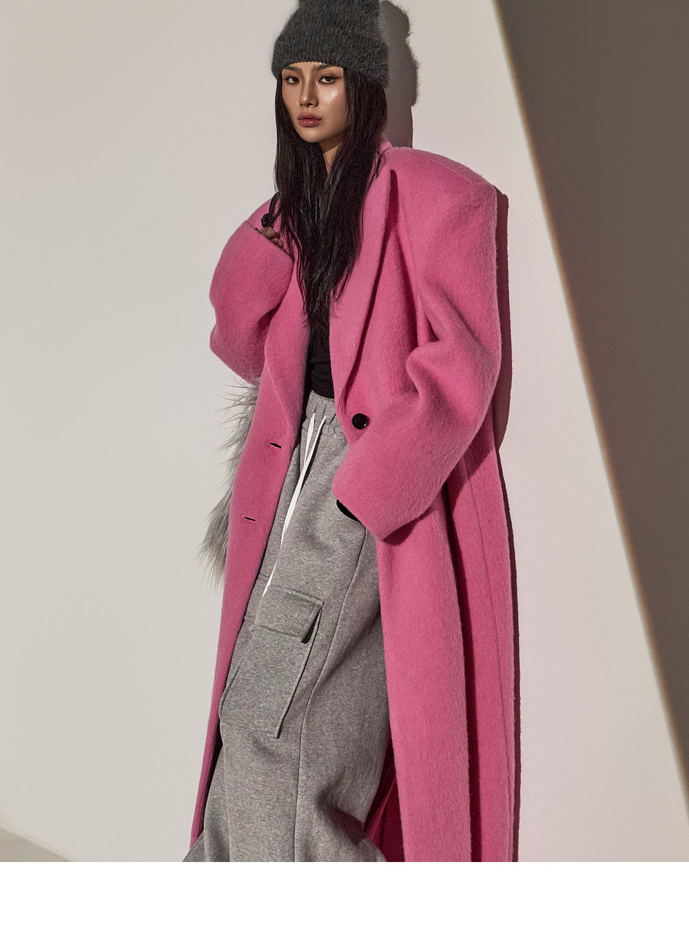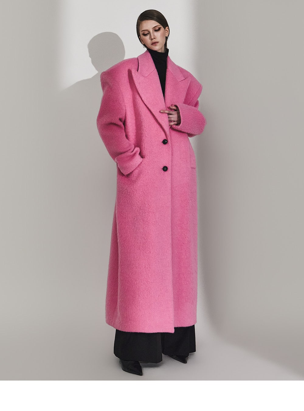 このコートは魅力的なピンク色で目立ちます。
