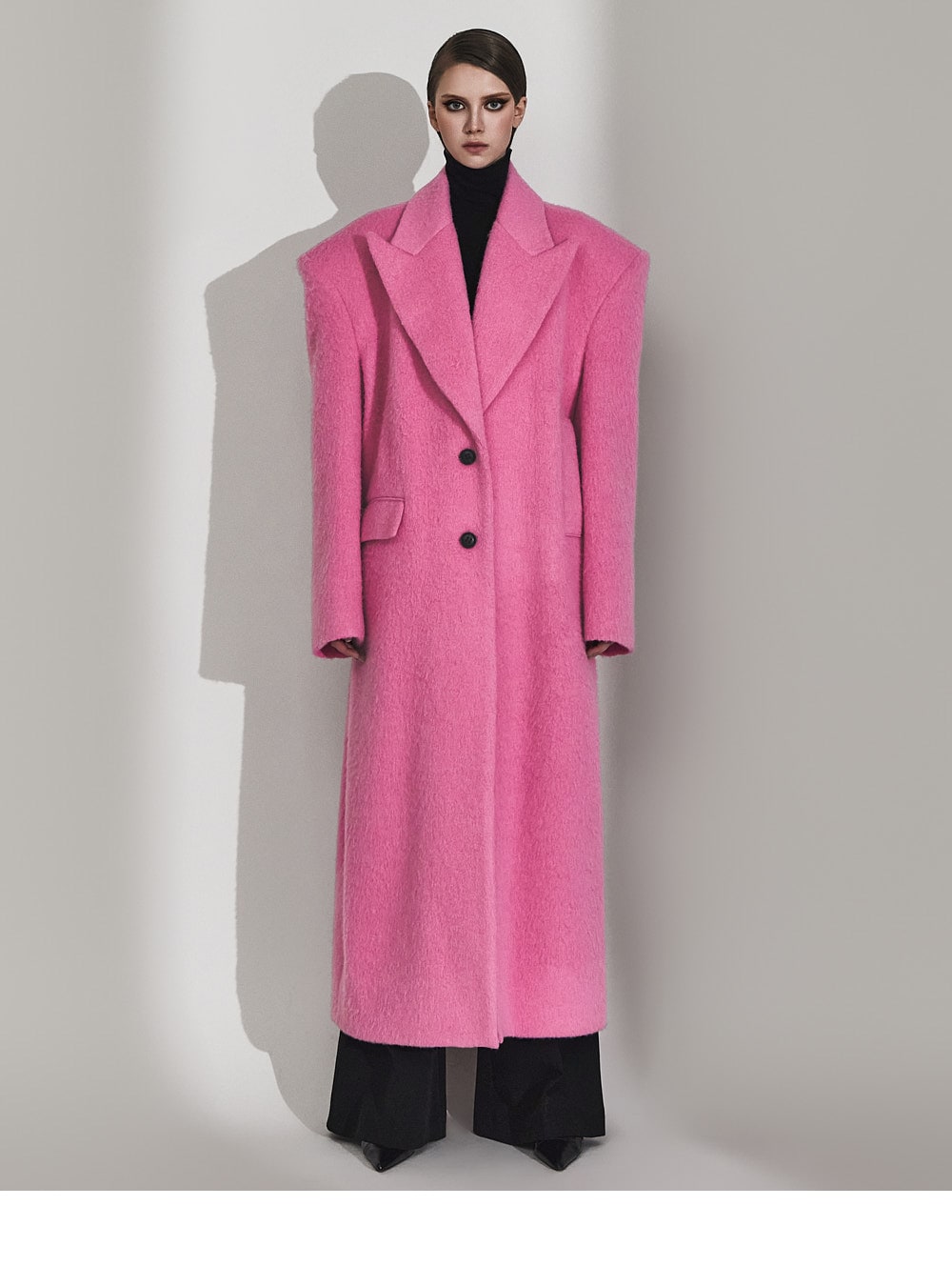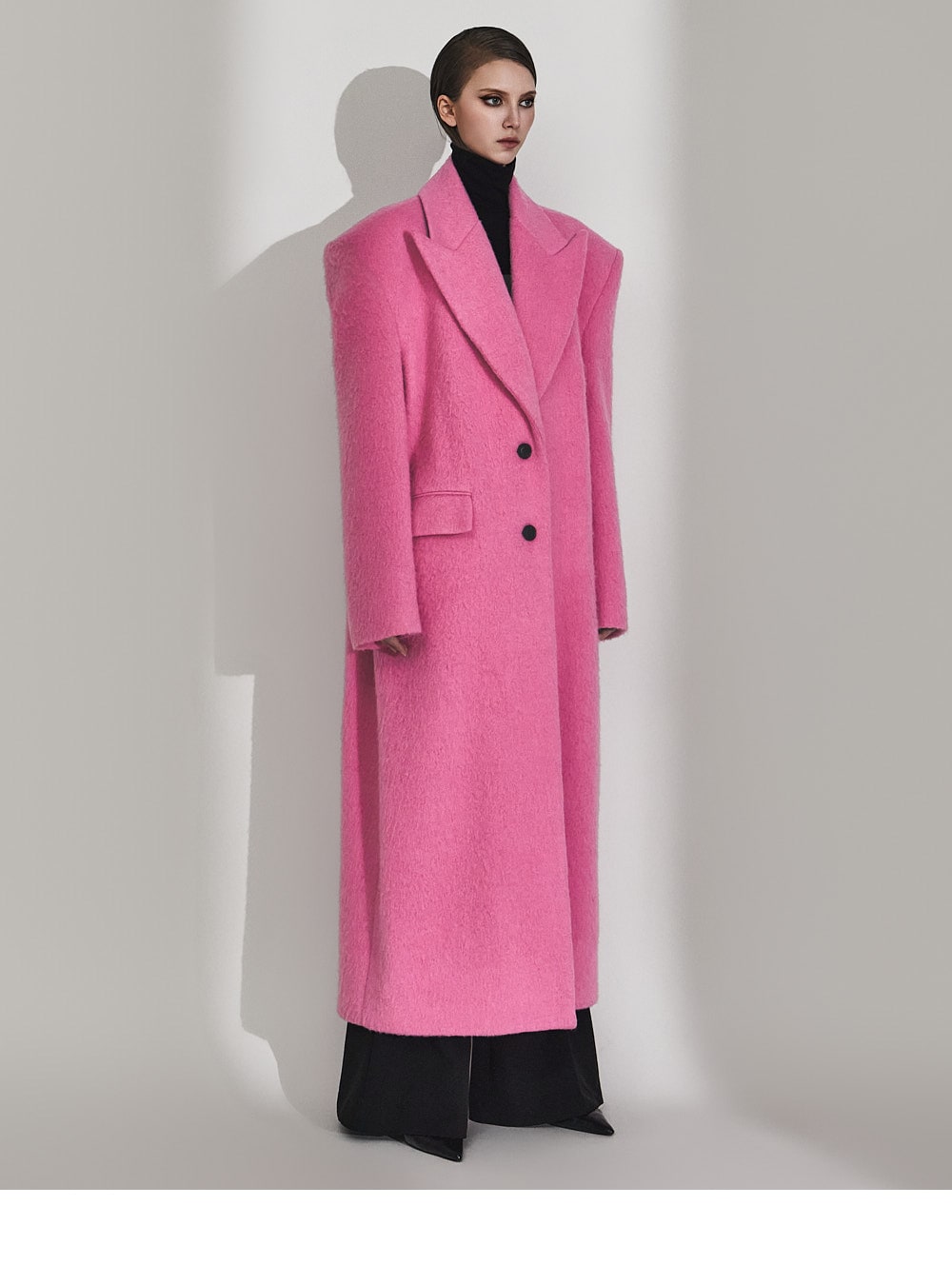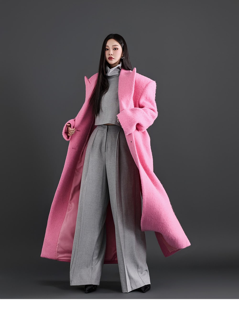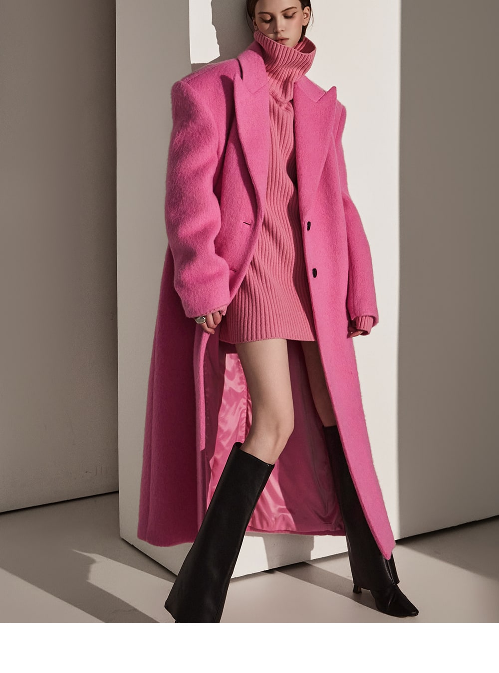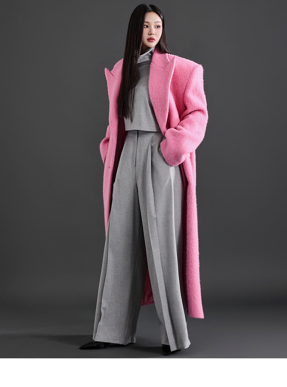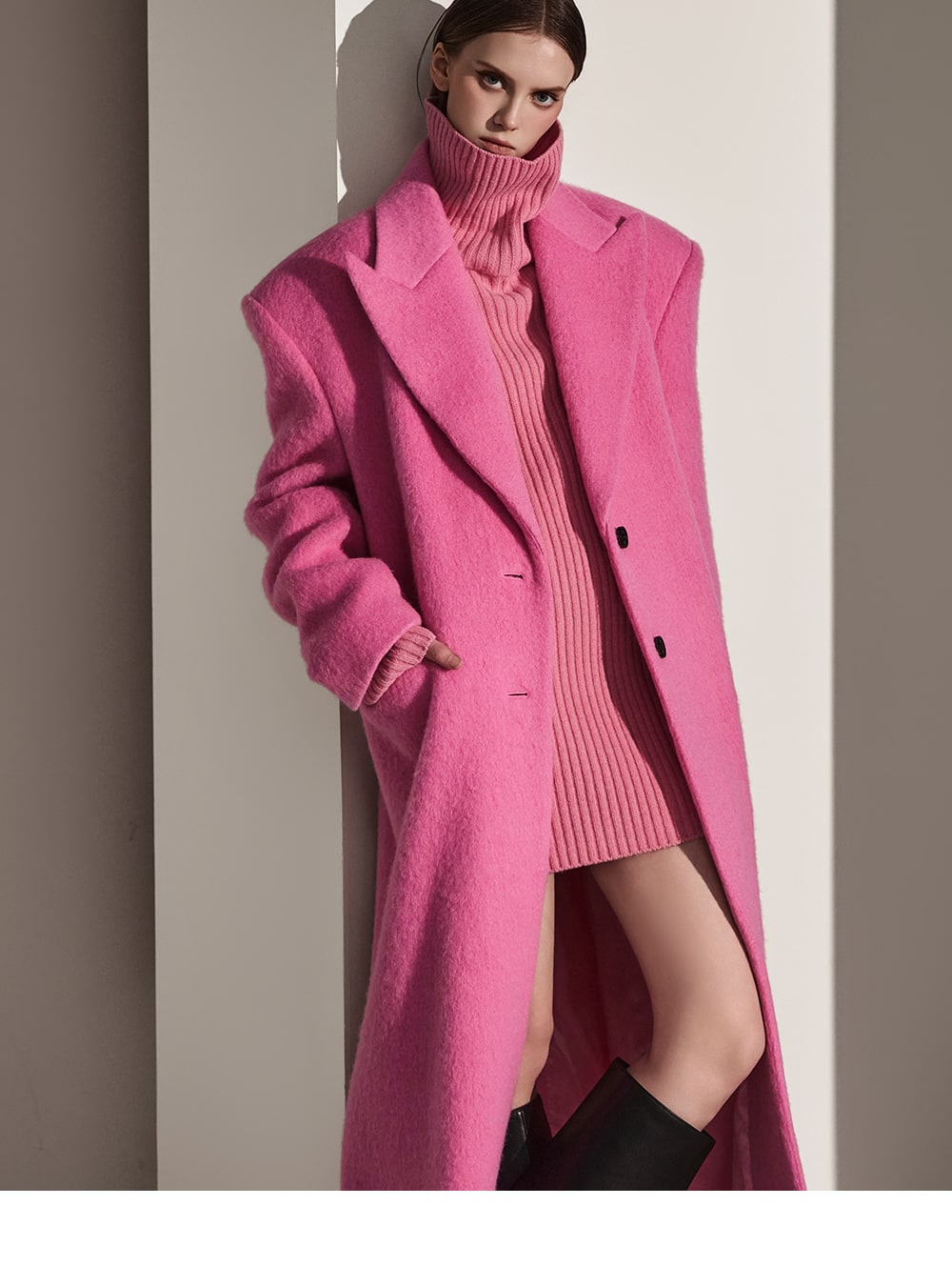 このコートは魅力的なピンク色で目立ちます。